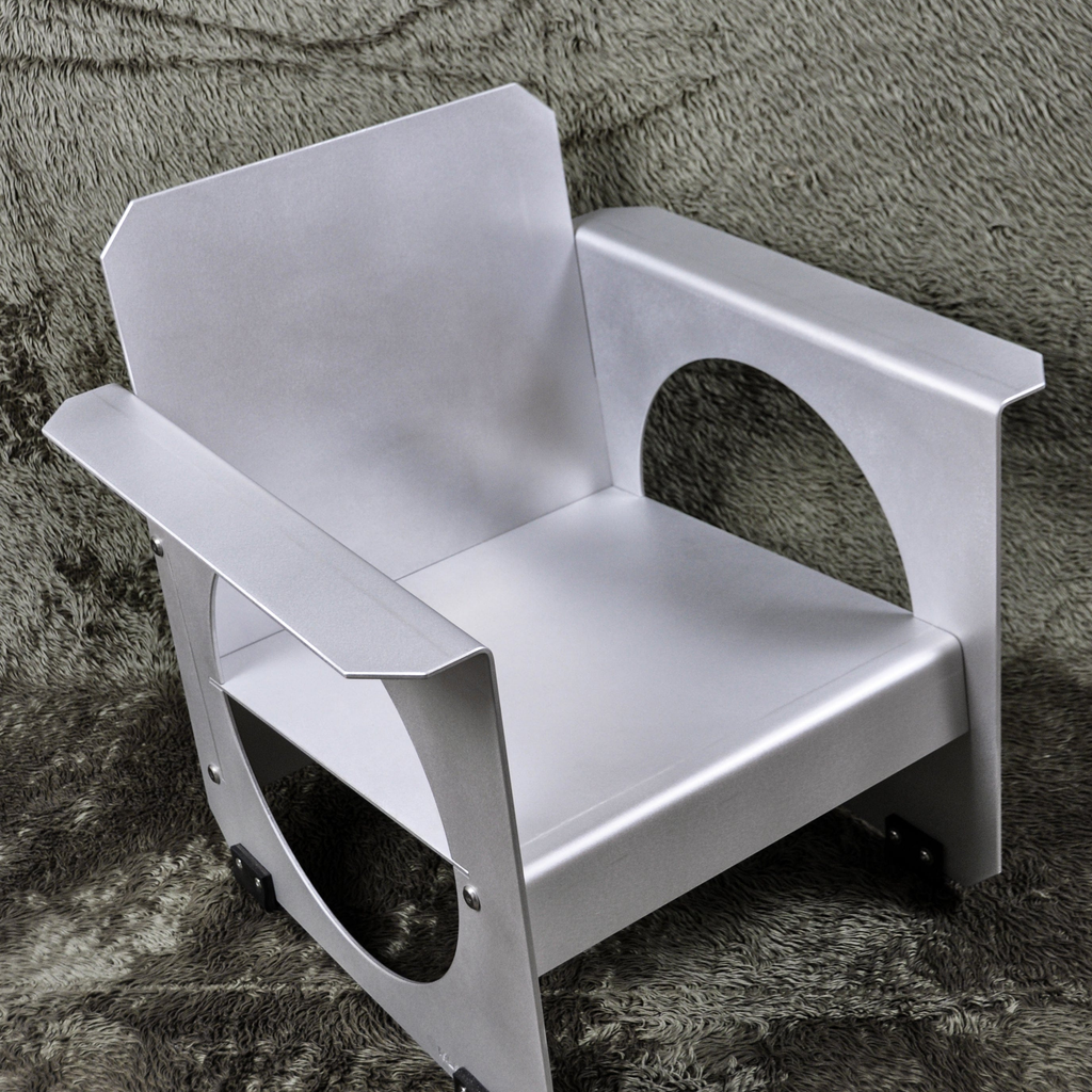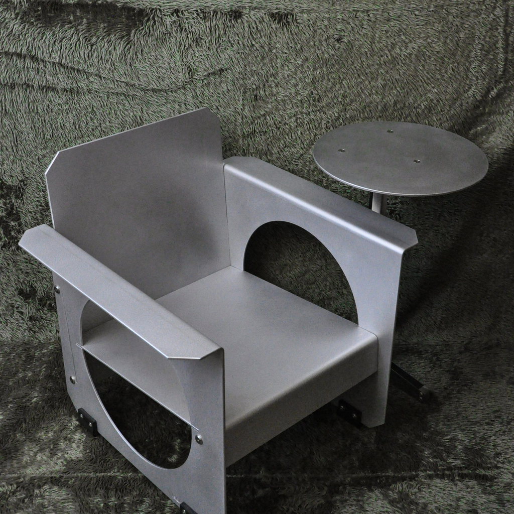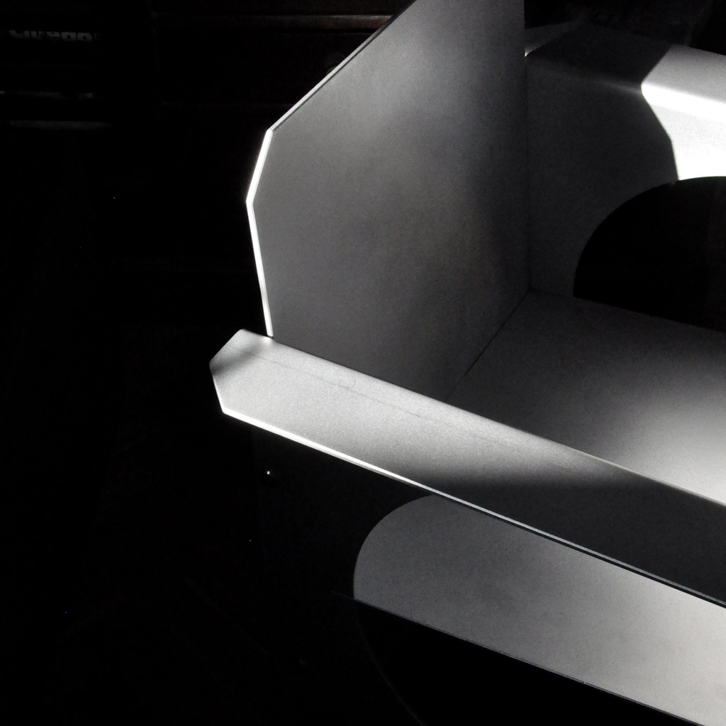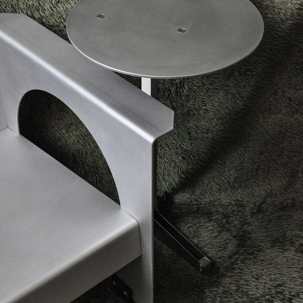 This low armchair by MLK Furniture, crafted from four hand-sanded aluminum sheets, exudes a bold neo-industrial appeal. Designed with a seating height of 28 cm, it combines a raw, minimalist aesthetic with the precision and elegance of metalwork. The chair's sleek, geometric lines and refined surface finish give it a striking presence, making it a standout piece that’s as sculptural as it is functional.