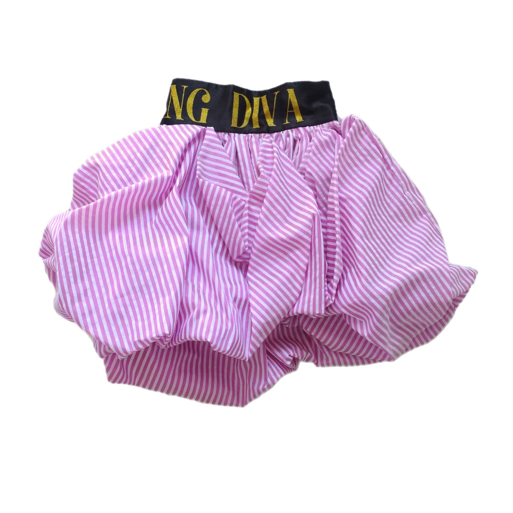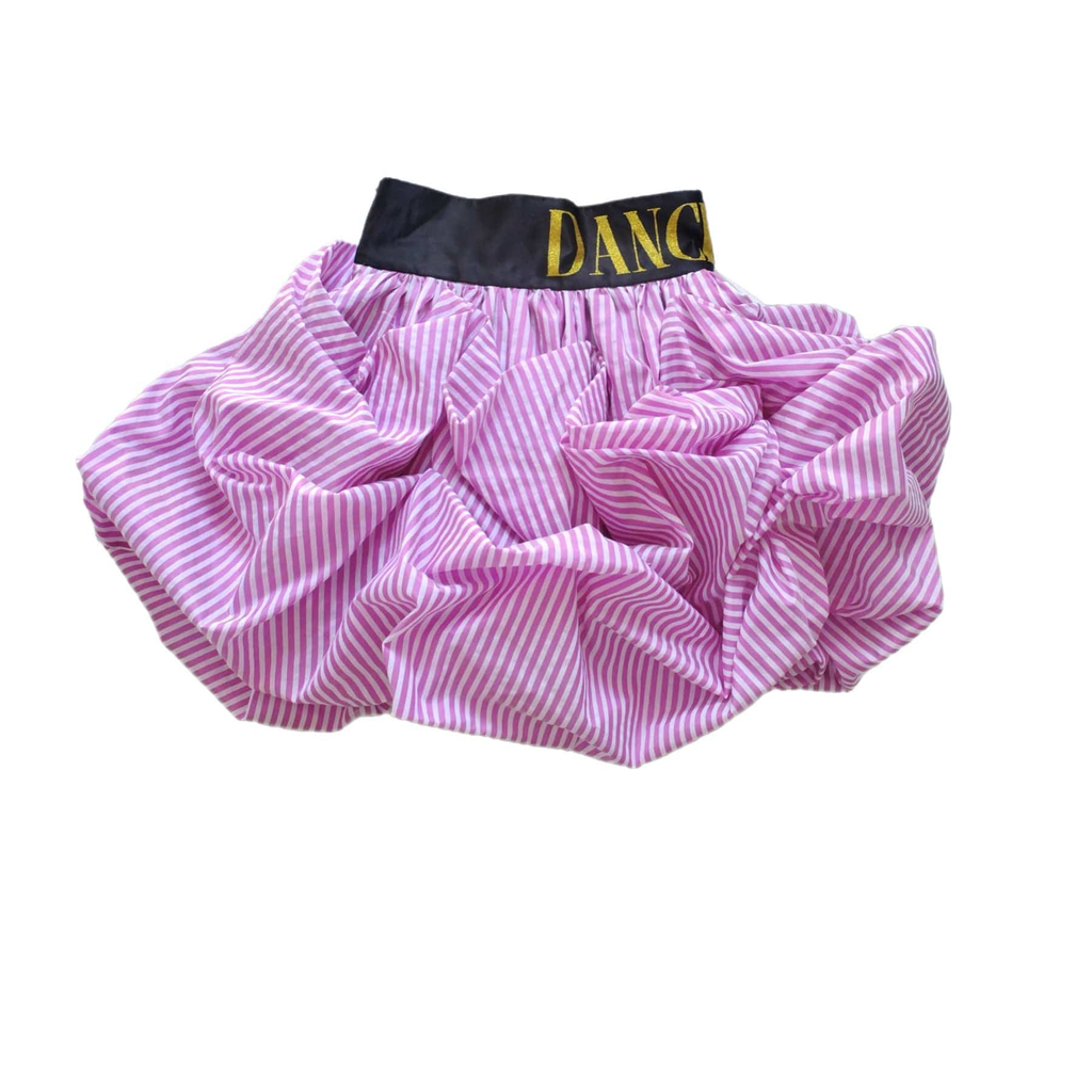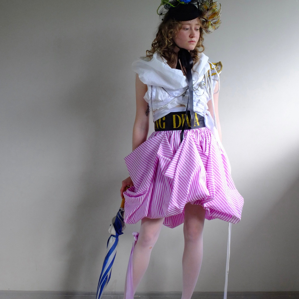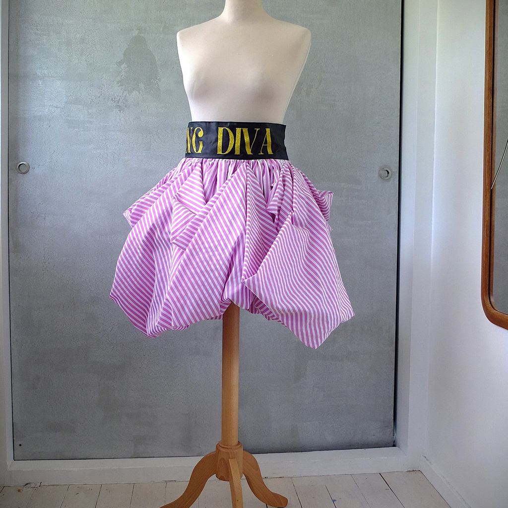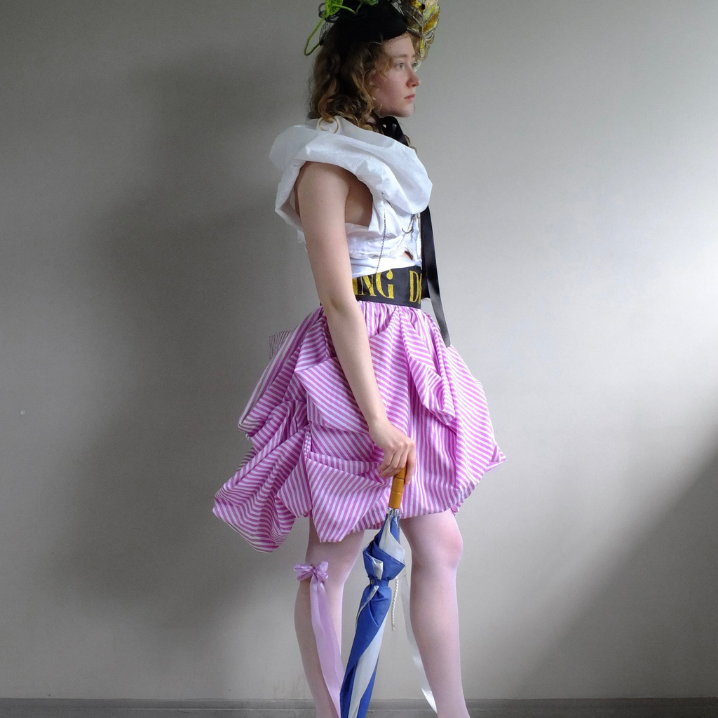 A voluminous cotton striped skirt with a waistband made from a found "Dancing Diva" ribbon