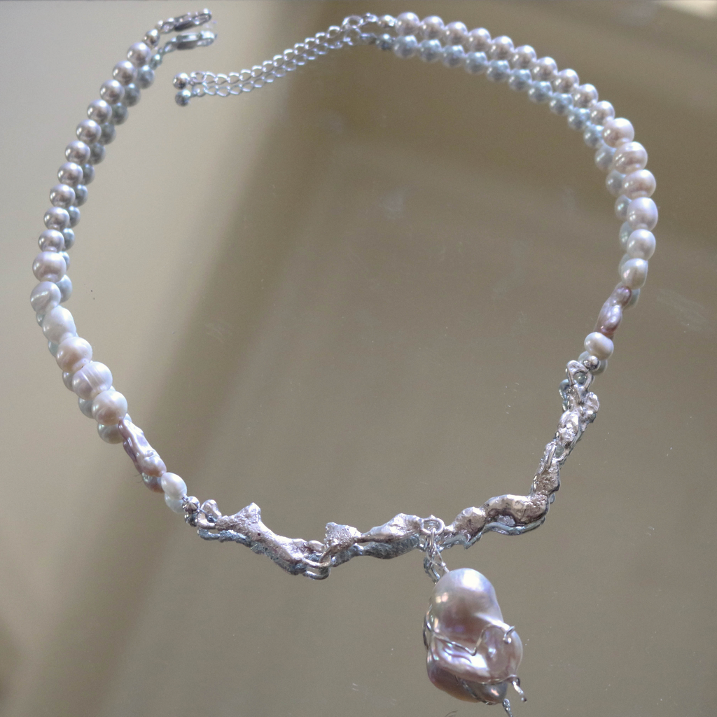 Sterling silver necklace with a statement baroque pearl wrapped in sterling silver wire. Chain includes organic shaped sterling silver links and freshwater pearls.
