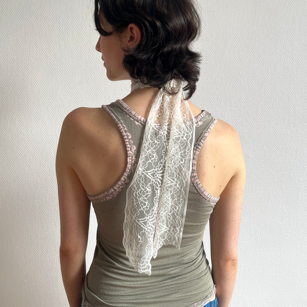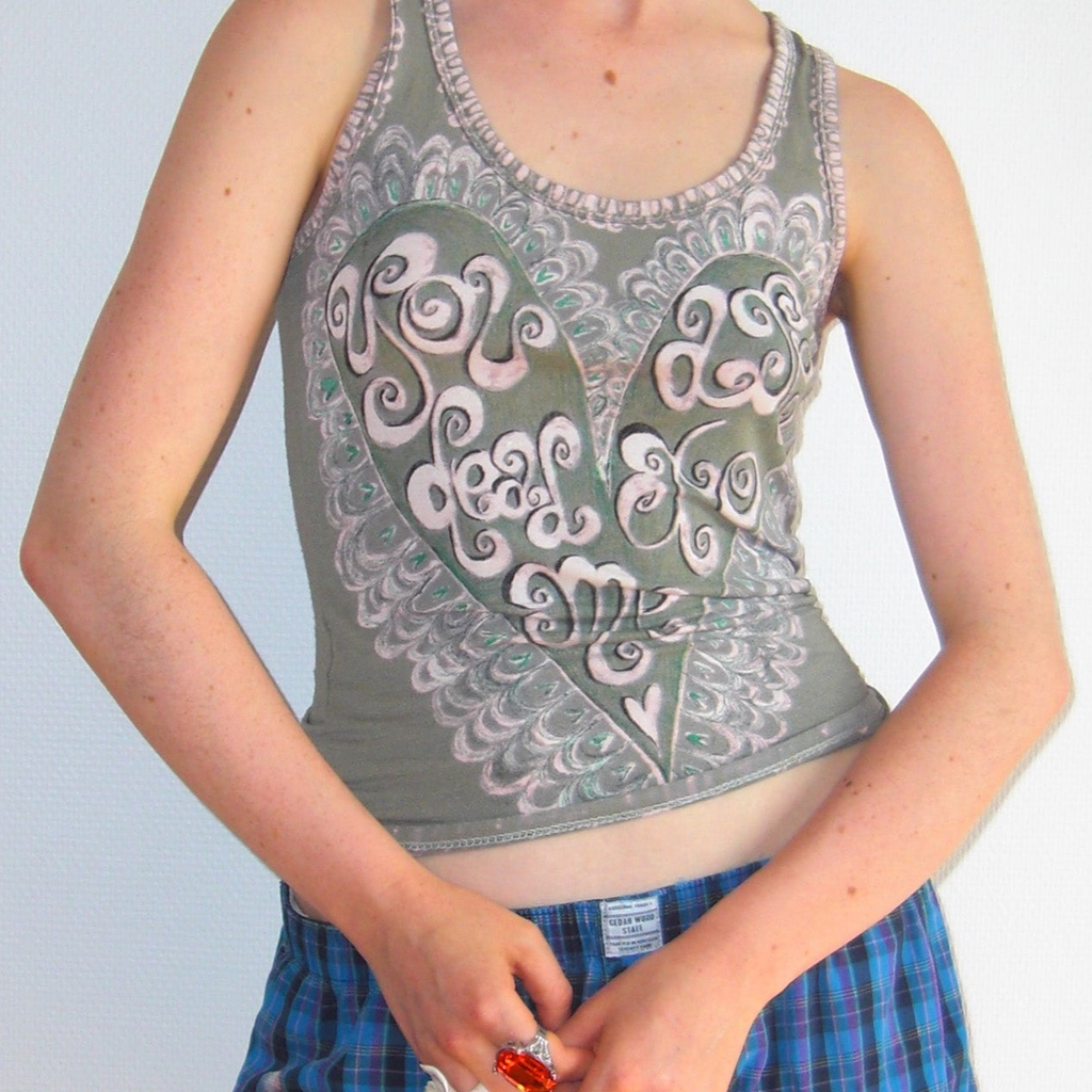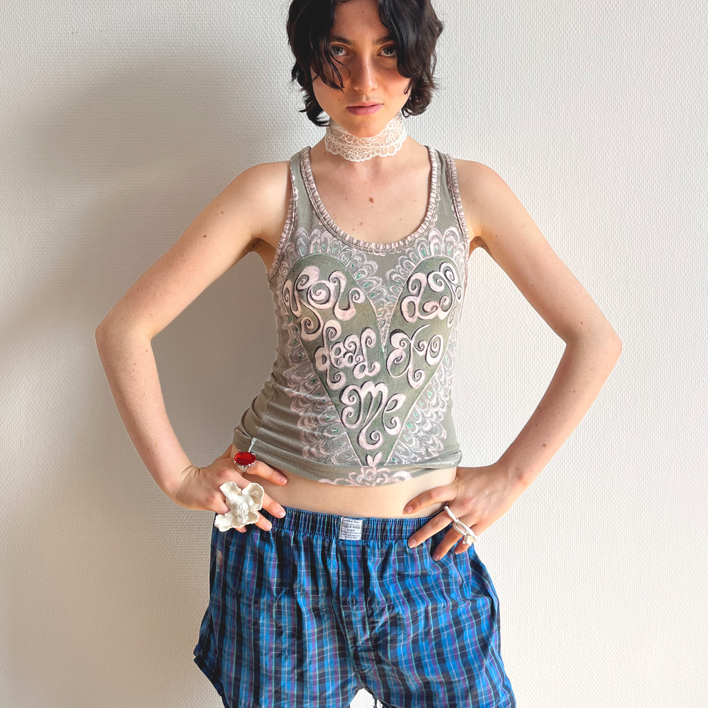 Kaki tank top with a heart pattern.