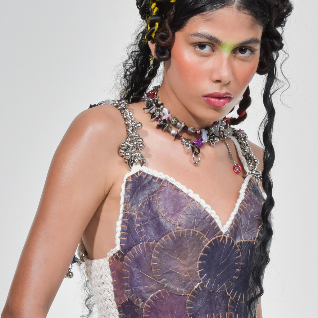 Handmade crochet skirt with natural Cerrado leaves and organic cotton. Garment has adjustable side tie closure.