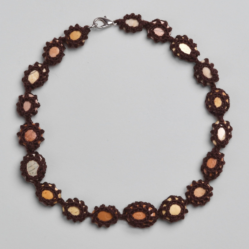 20 ceramic pebbles covered by hand in a crochet knit cage and attached to each other.