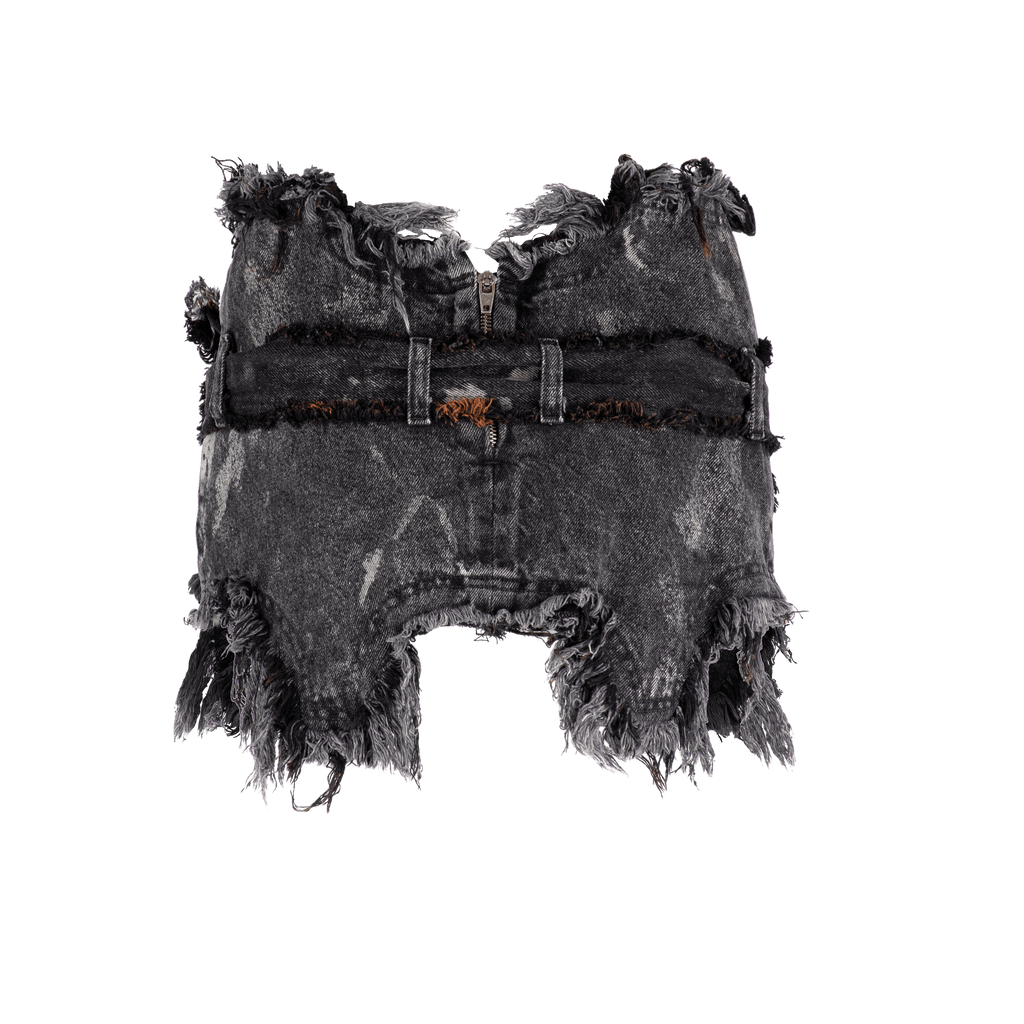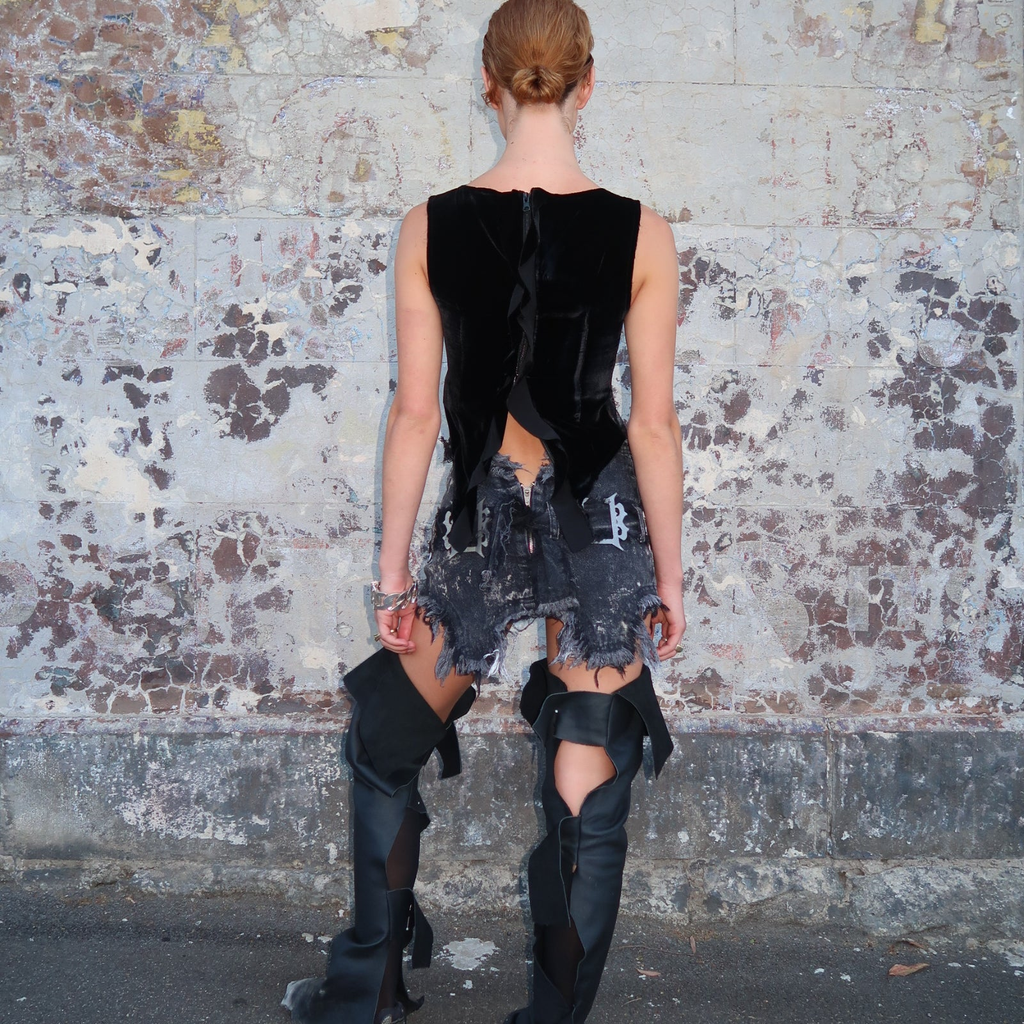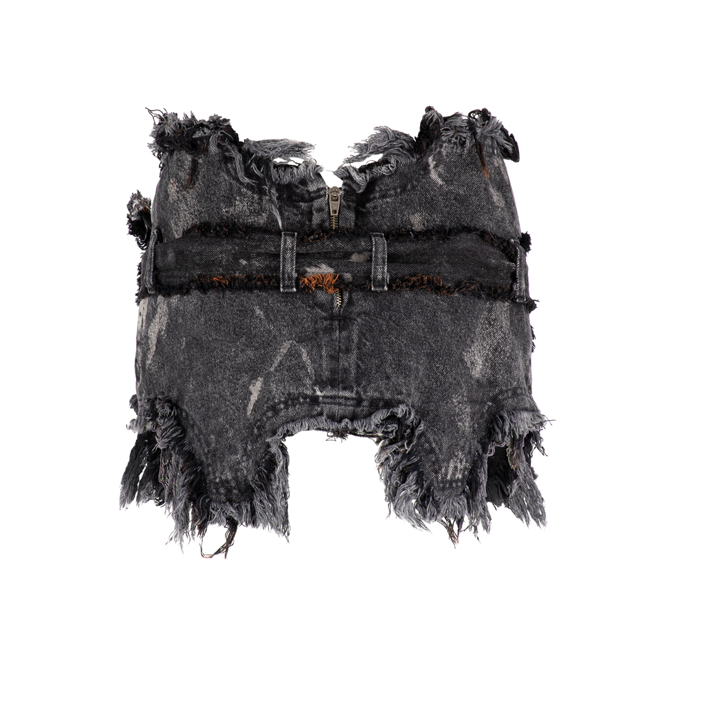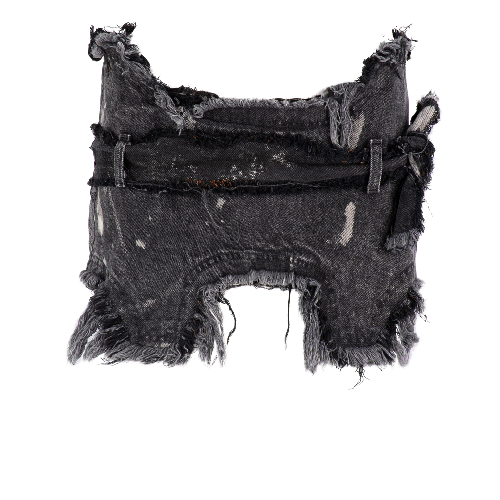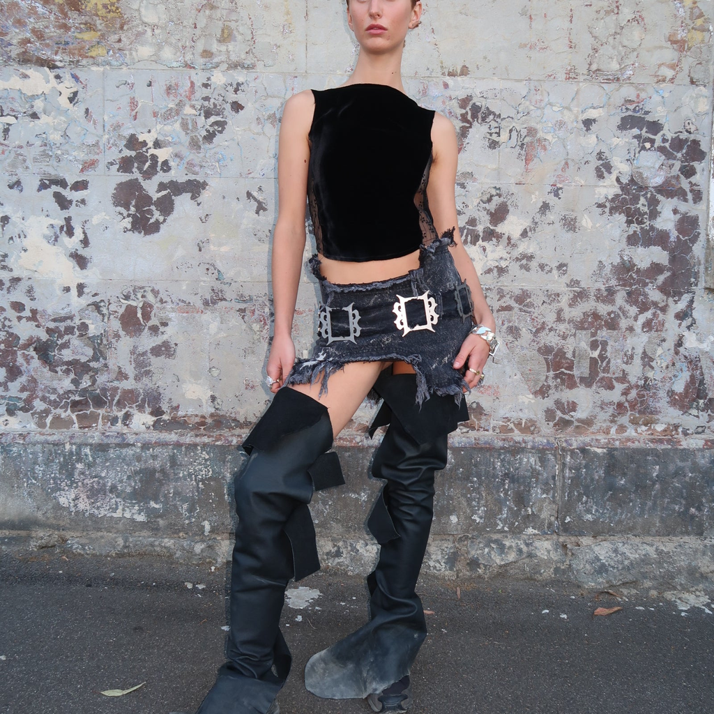 Black acid low rise skirt, with dipped front and back waist. Side sits higher on waist. Optional K buckle on belt. Garter inspired hemline with a mix of bubble skirt and pleats. All raw seams. Back zip closure. K buckles do not come with skirt.