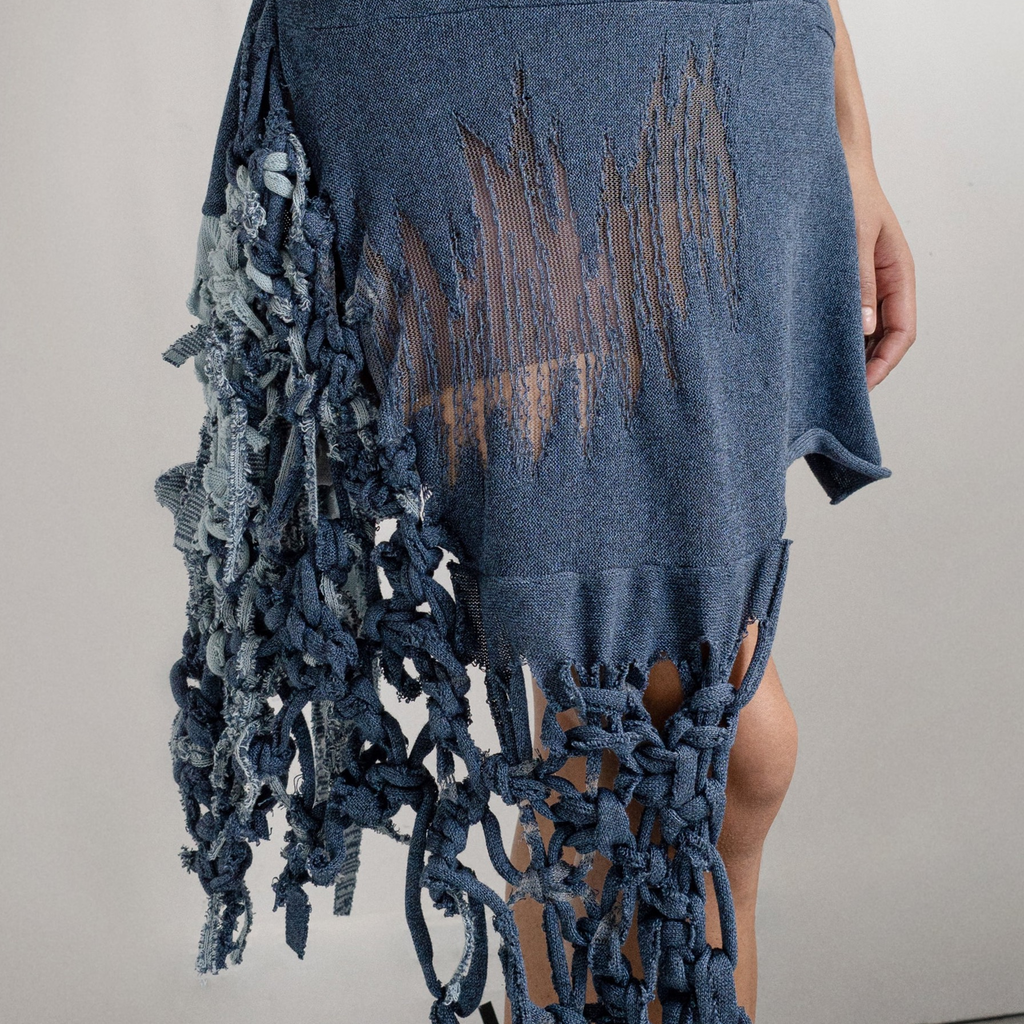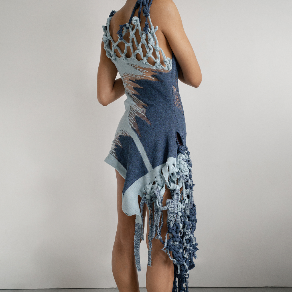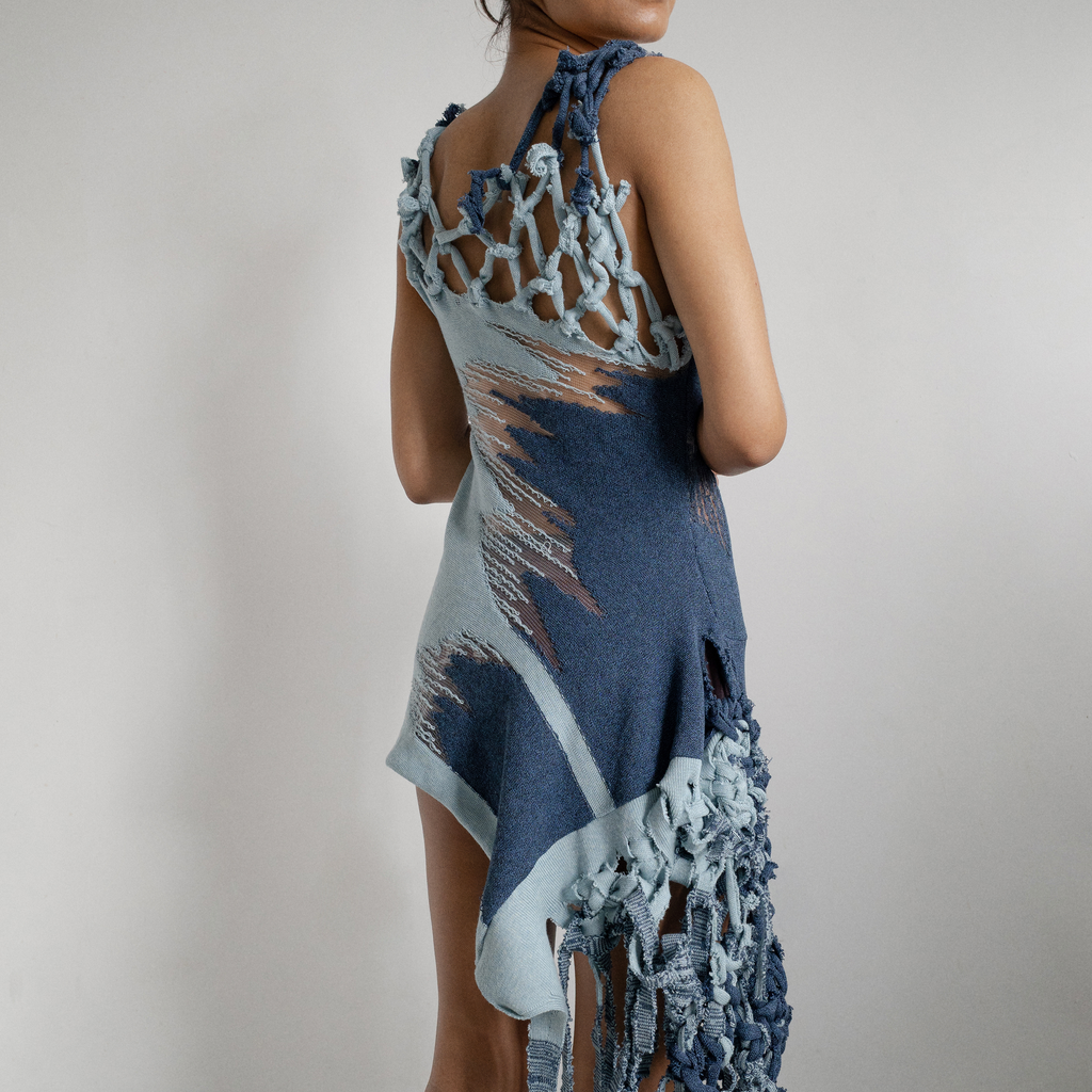 Denim dress with a trompe l’ceil ripped effect, with handcrafted macrame straps by Khanh Brice Nguyen.