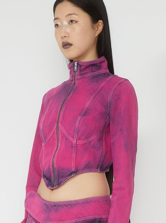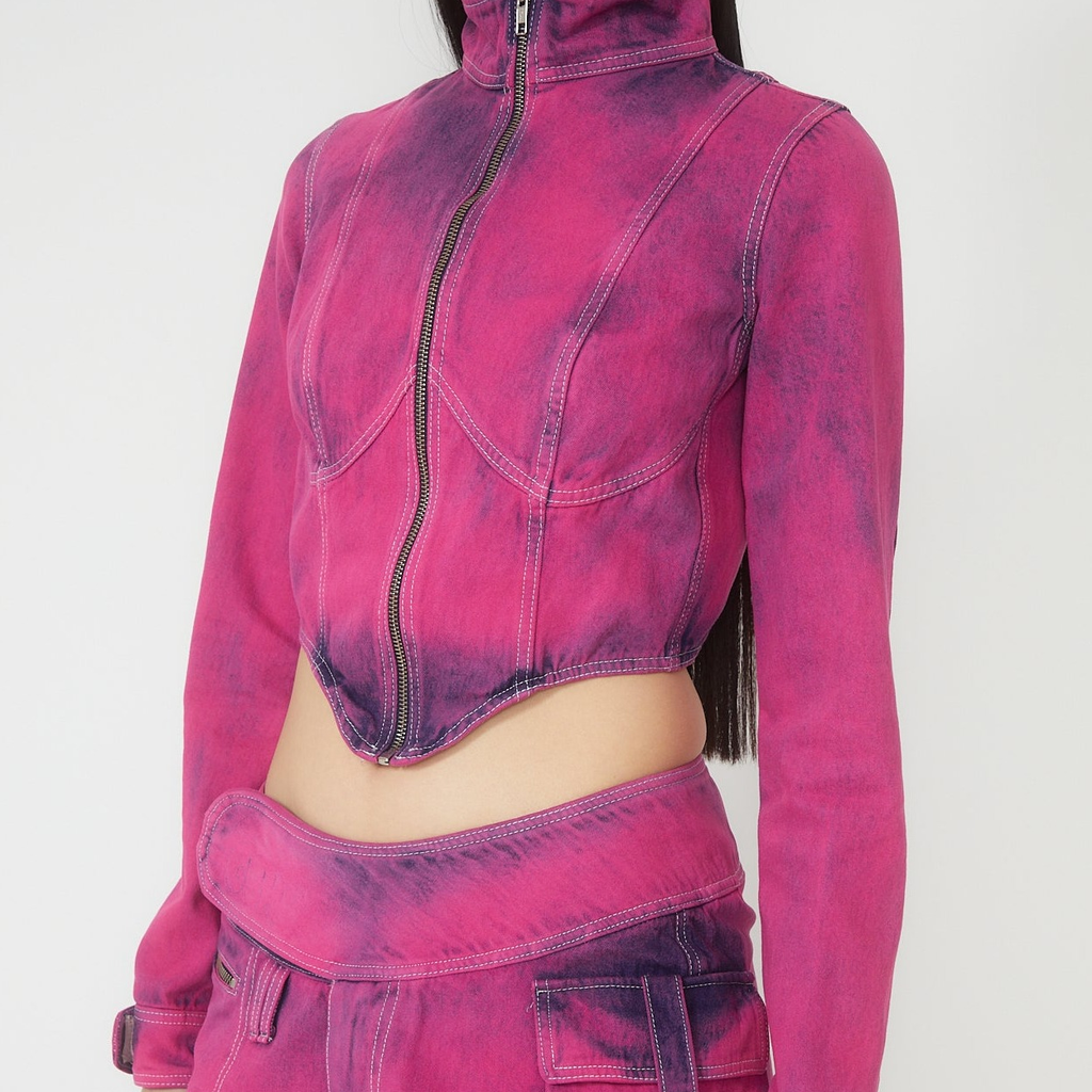 Pink washed denim jacket with corset-like style lines. Stand up collar with front metal zip closure. Long sleeves with velcro cuffs. Curved hem at the front
