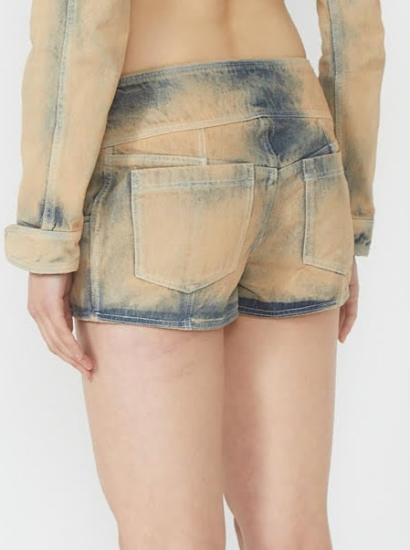 Beige washed denim mini shorts. Low rise waistband rising at back. Front zip closure with asymmetrical velcro waistband closure. Rounded front side pockets and patch pockets at back.