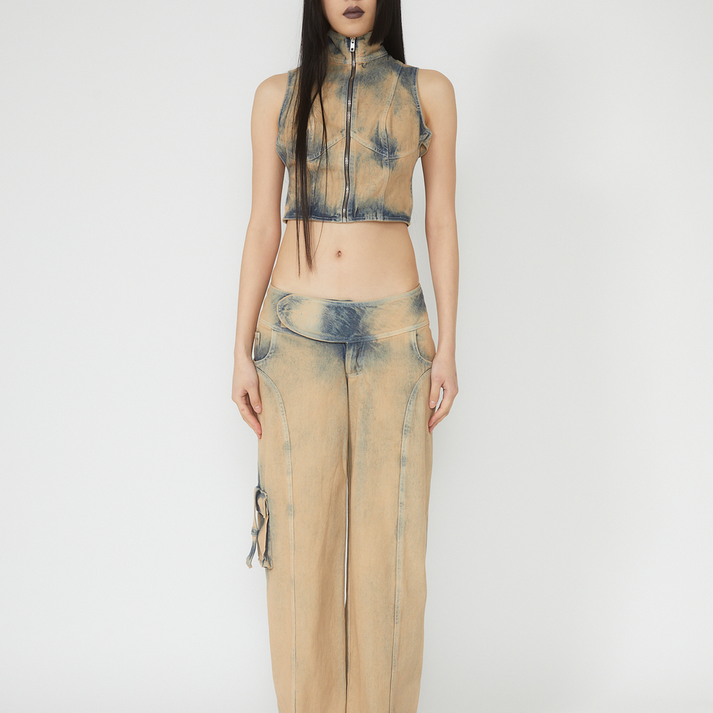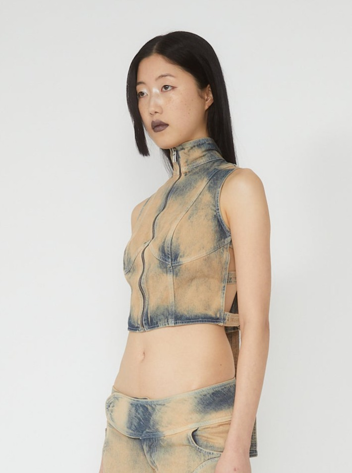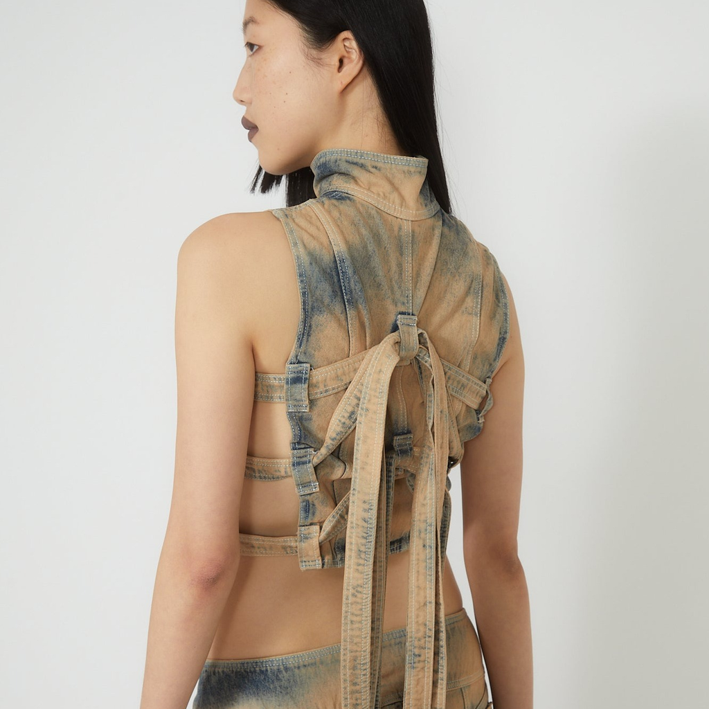 Beige washed denim vest top with corset-like style lines and stand up collar. Front metal zip closure and adjustable ties at back.