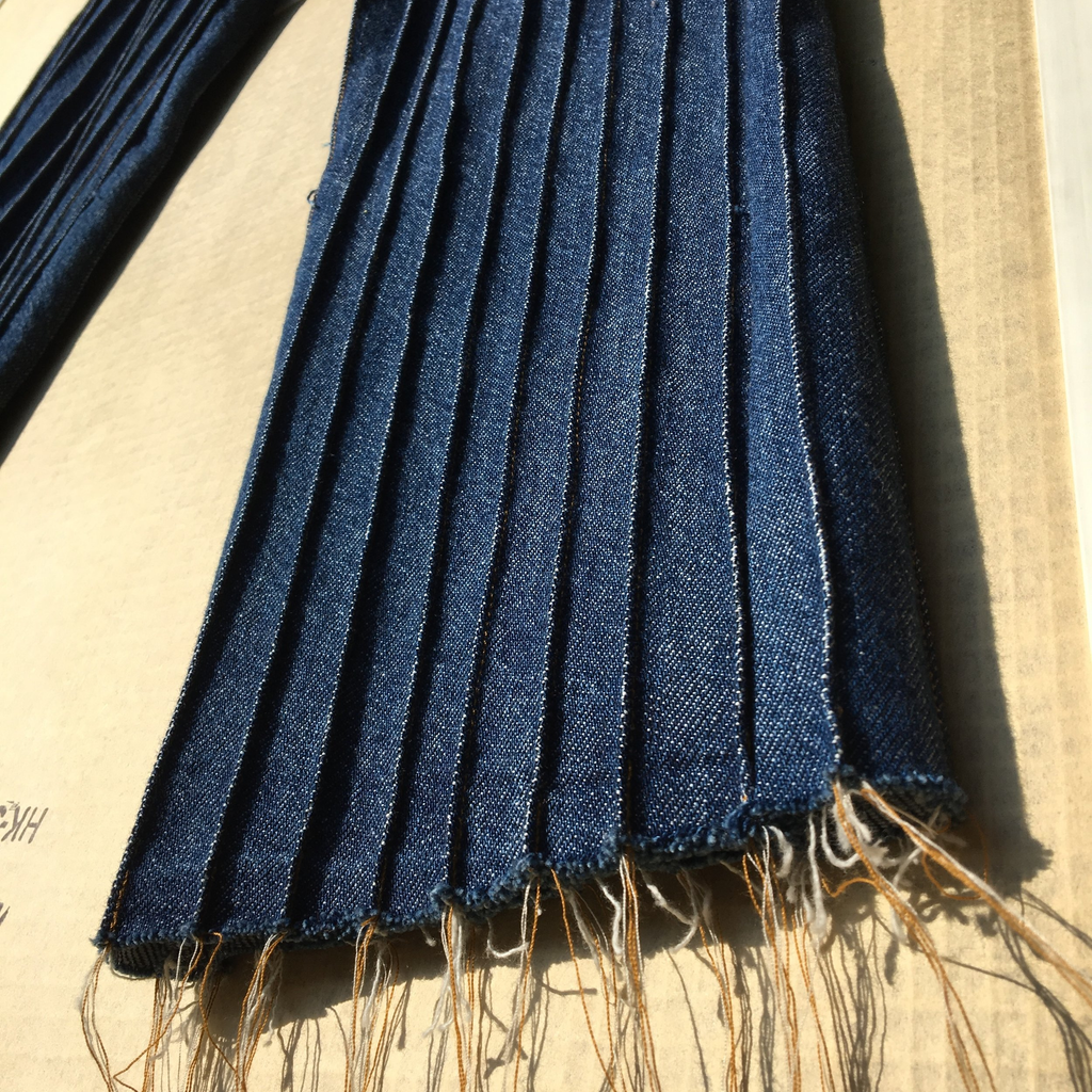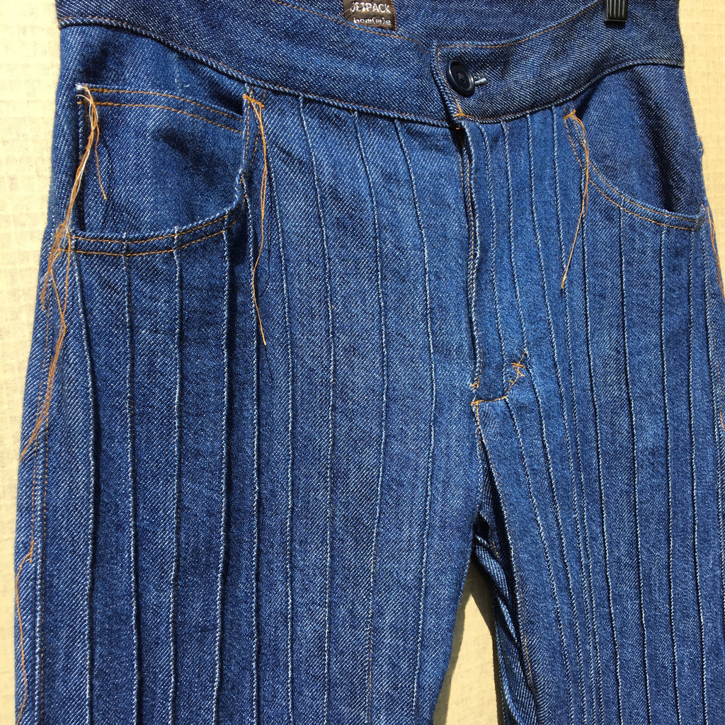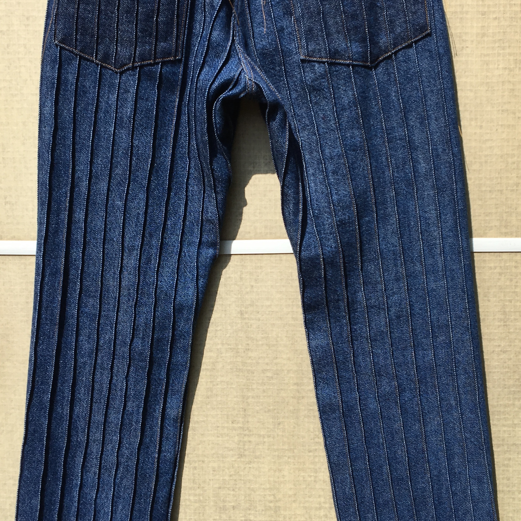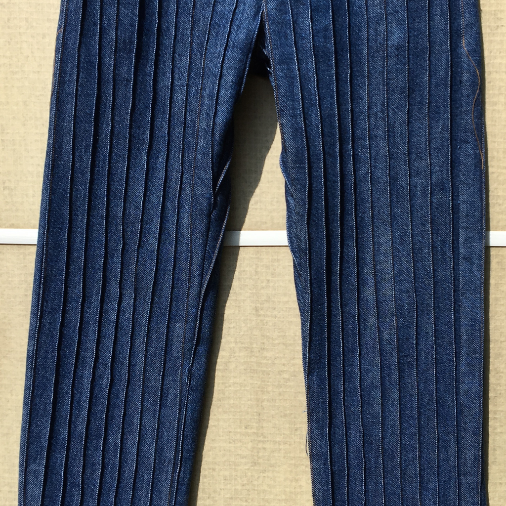 Indigo denim, 5-pocket jean design, entirely tuck stitched with french seam finish.