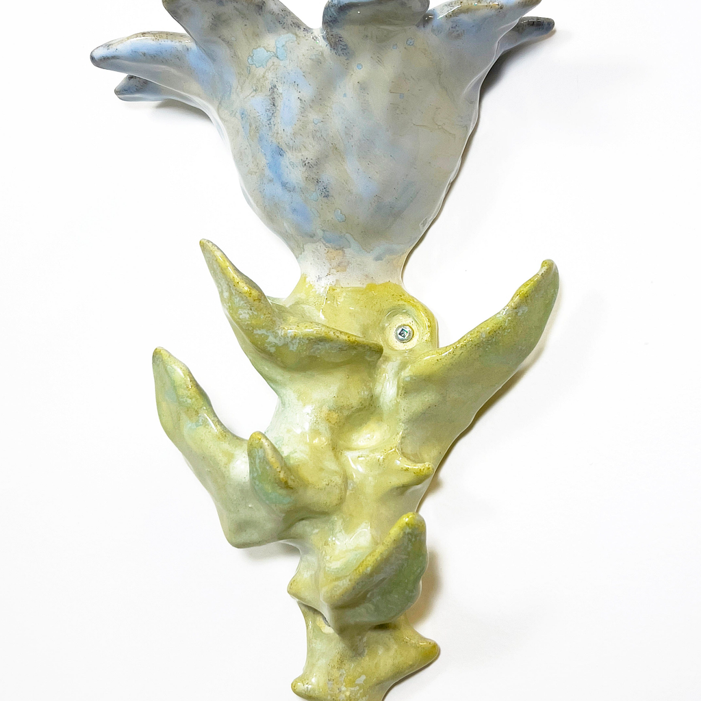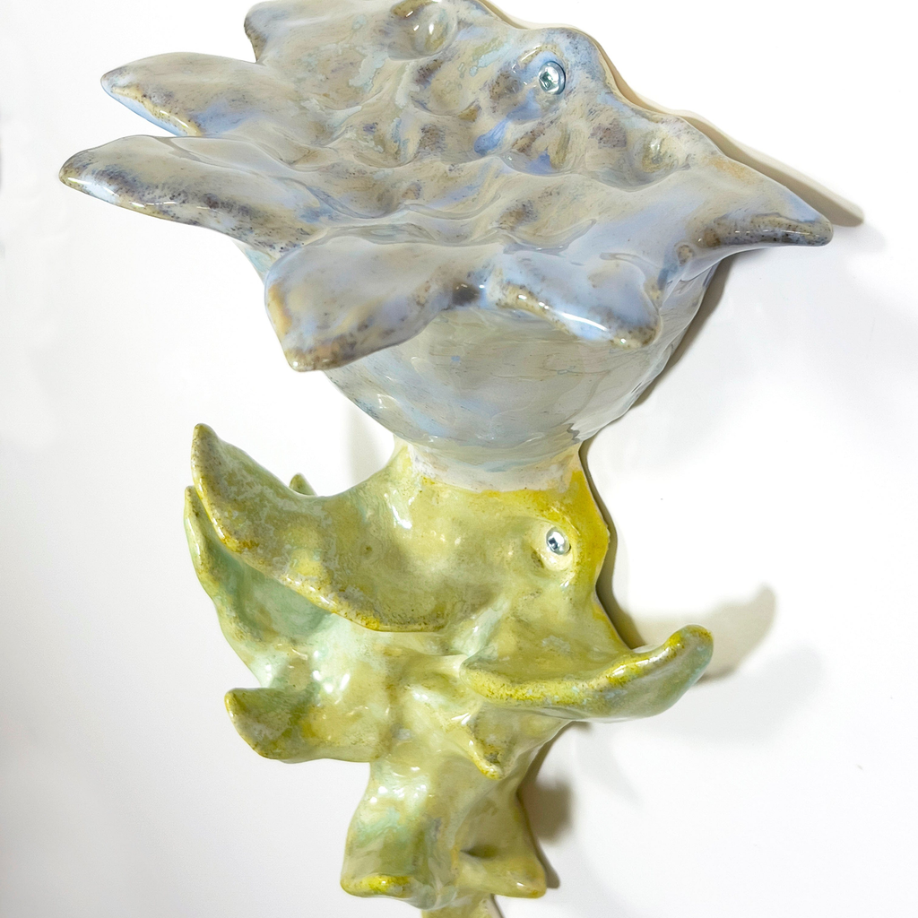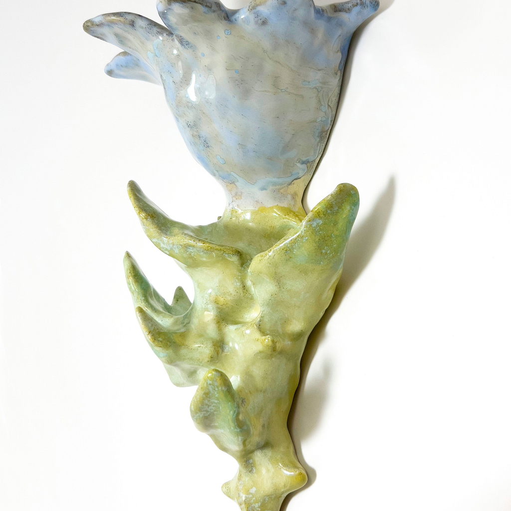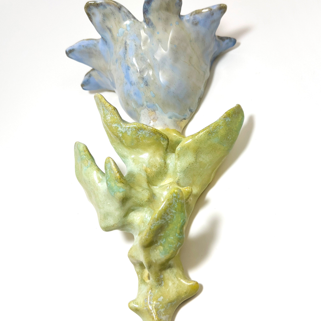 Hand-sculpted ceramic wall sculpture glazed in crystalline powder blue and mottled minty green. Designed as a functional hook or to enjoy on its own. Items like jewelry, handbags and light jackets can be hung by the flower’s leaves. Each piece is individually crafted to order; subtle variations in form and finish make every piece uniquely yours.