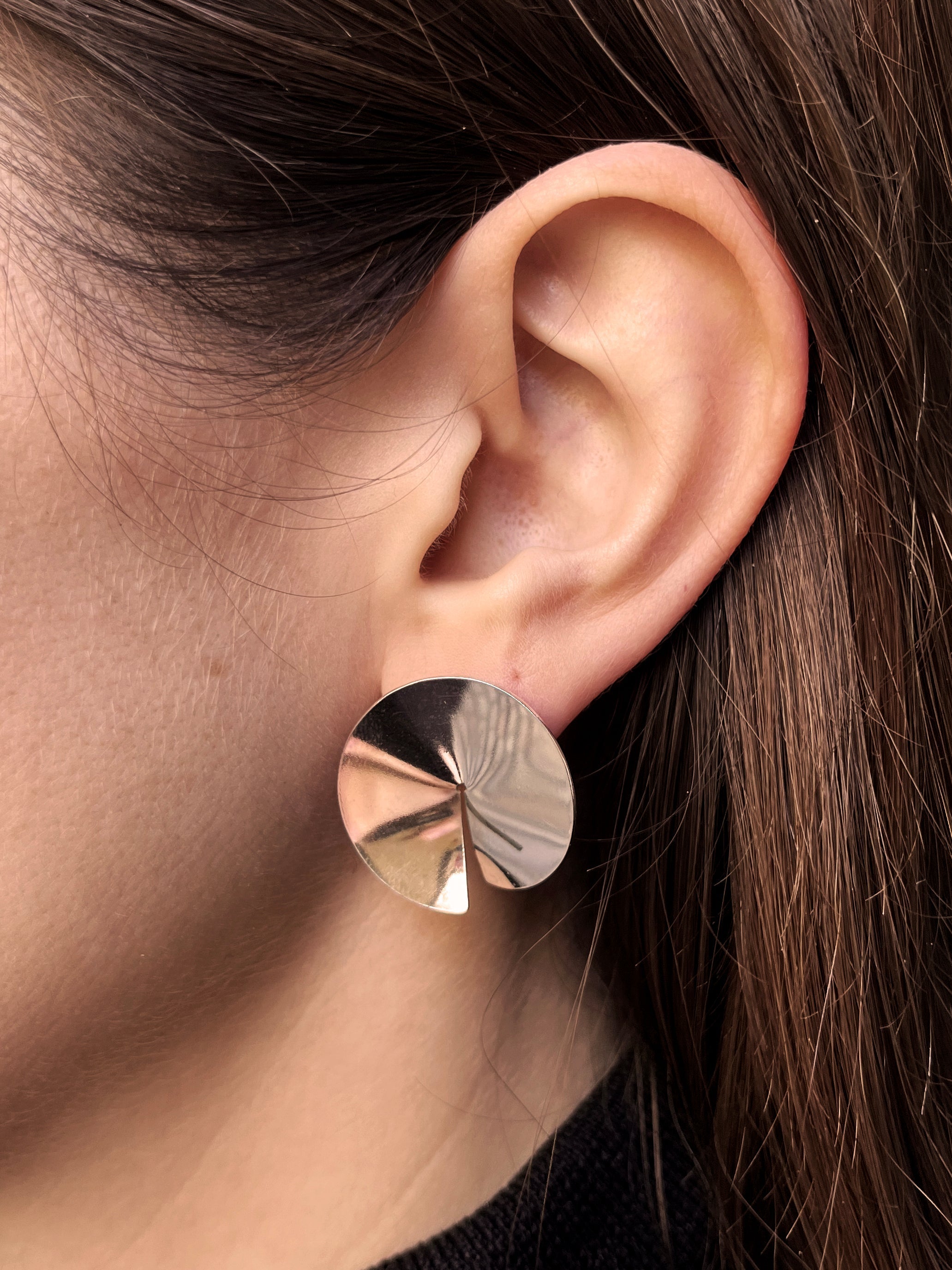 100 % recycled sterling silverHandmade earrings crafted from recycled sterling silver, featuring a sculptural disc with a sleek twisted detail. The reflective finish catches the light beautifully, creating a modern yet timeless statement piece.