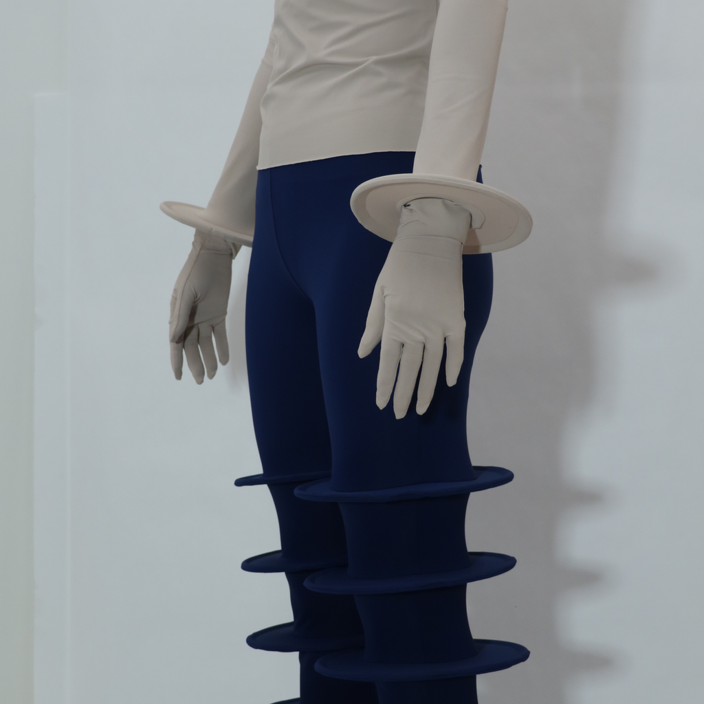 Midnight blue discs trousers with wire inside by Sun Woo. Made from technical and recycled nylon jersey fabric. The trousers are fitted to body, high waisted and contain a concealed zip closure at side-seam. Its shape is created through the pop-up method and circular pattern cutting. The piece is flat laying down and transforms once it opens.