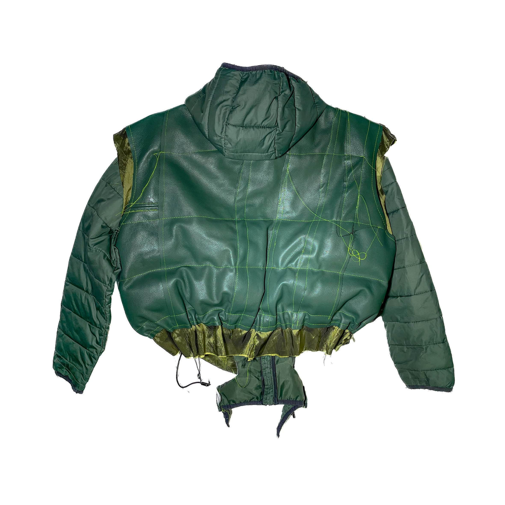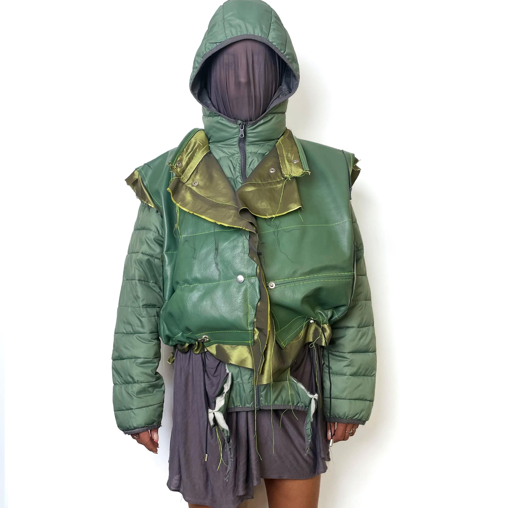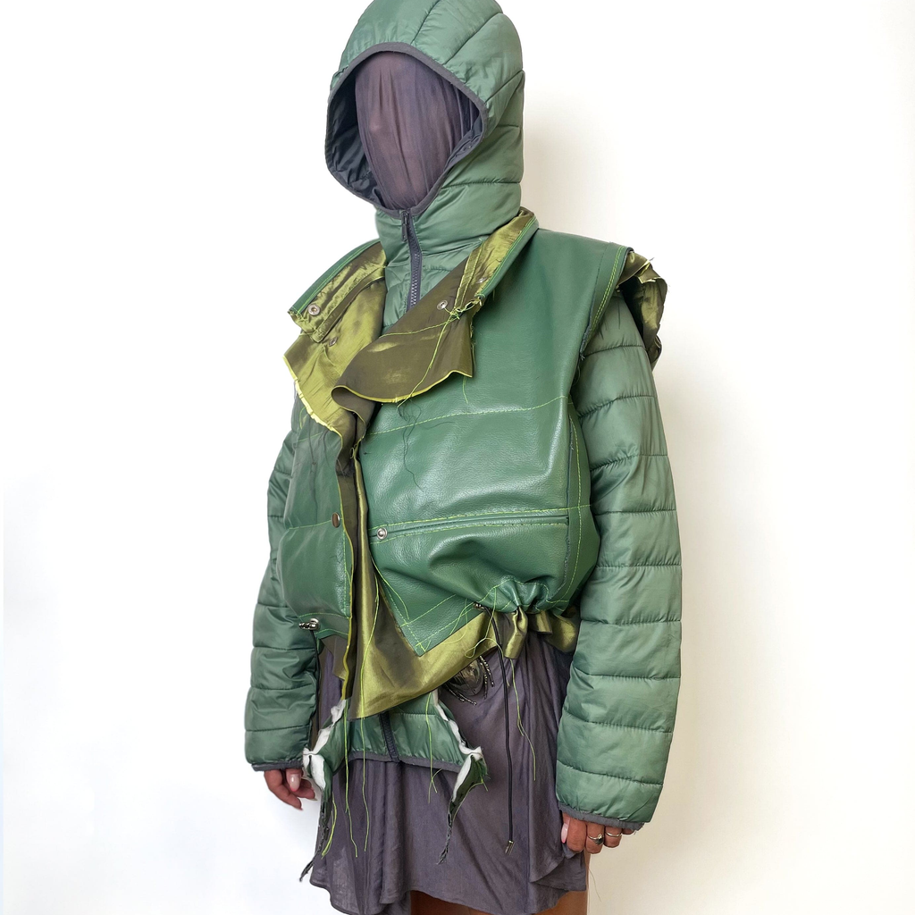 Padded leather jacket with attached sleeves and hood, extended front zipper, snap buttons and adjustable waist.