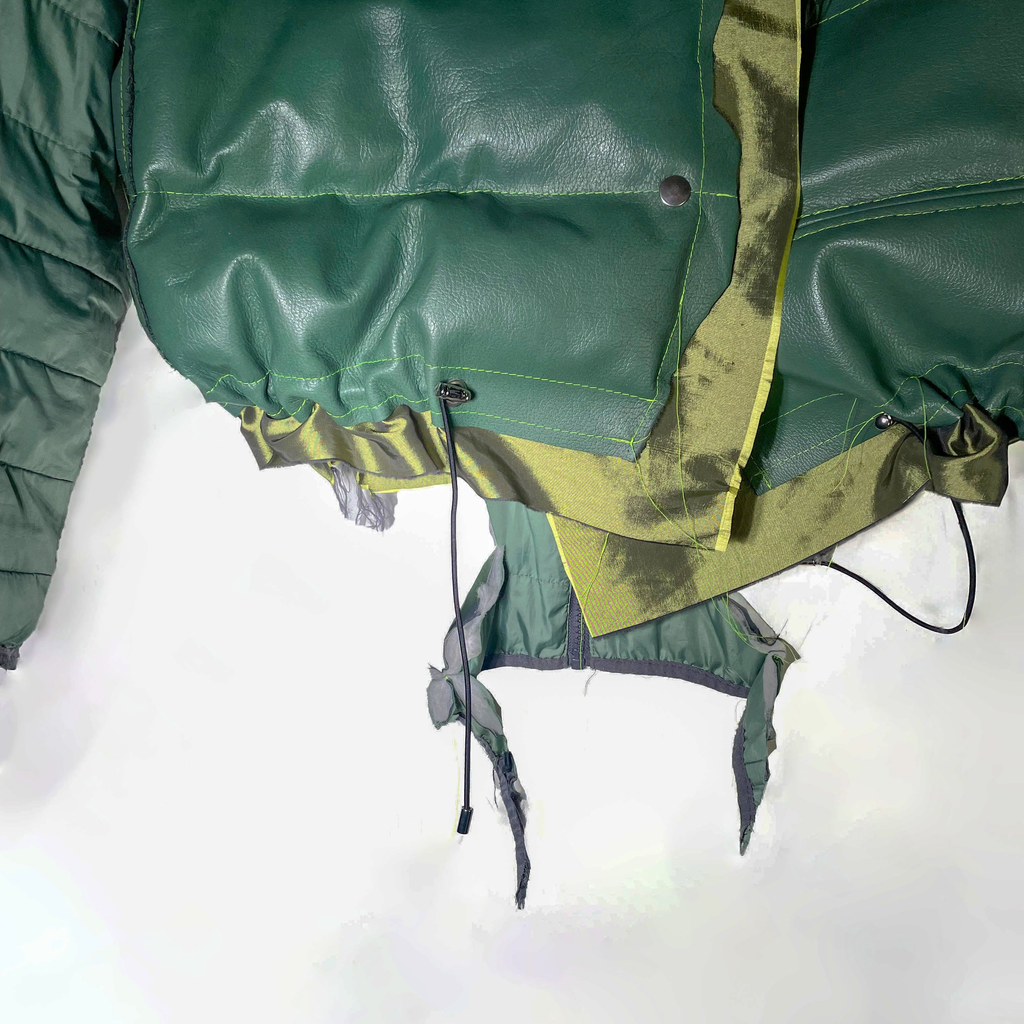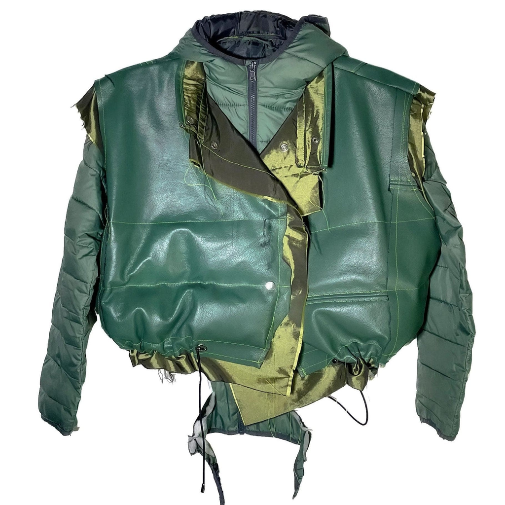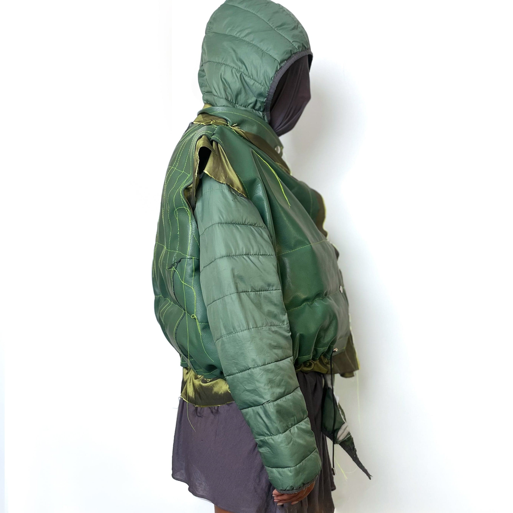 Padded leather jacket with attached sleeves and hood, extended front zipper, snap buttons and adjustable waist.