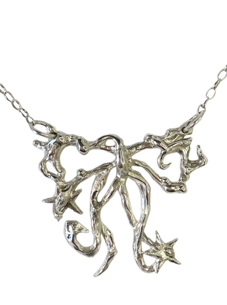 Pendant necklace version of Definition of Divine. Handcarved, solid sterling silver ribbon pendant with star details.