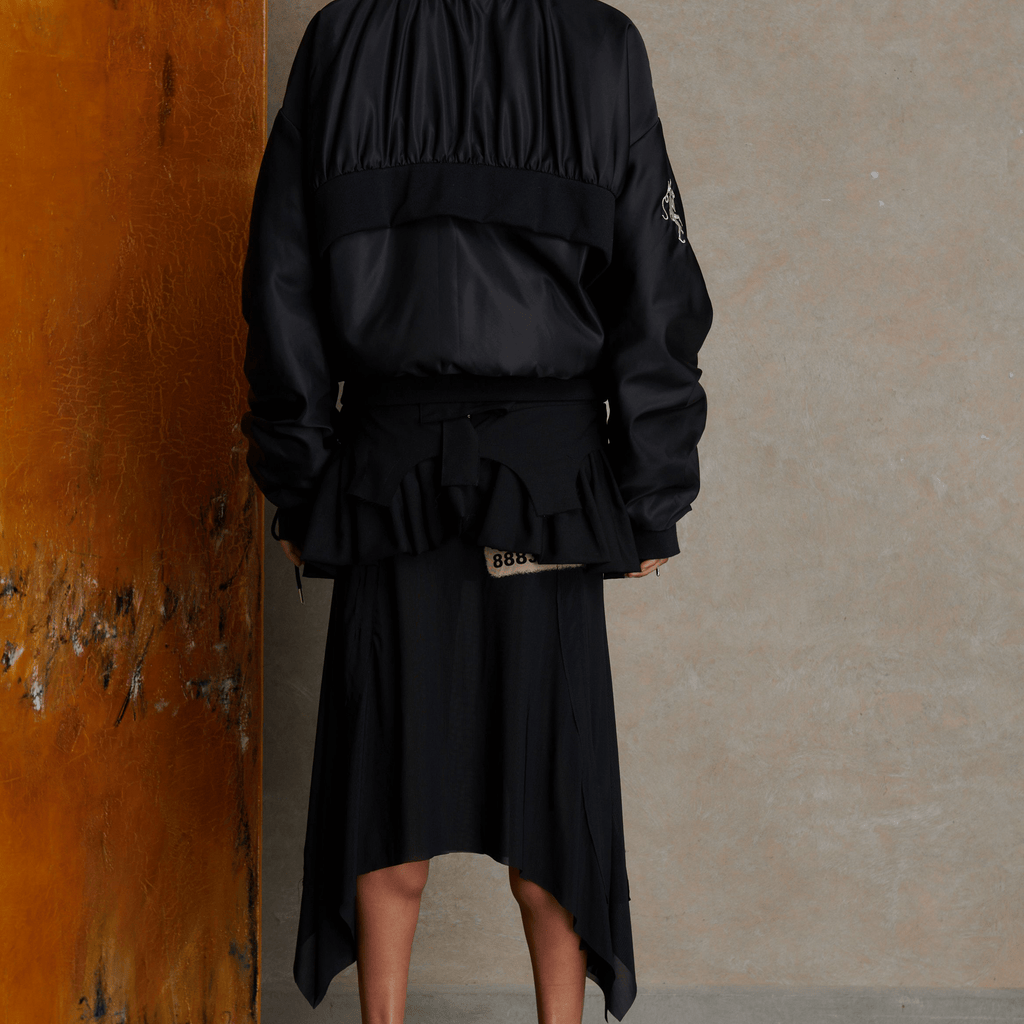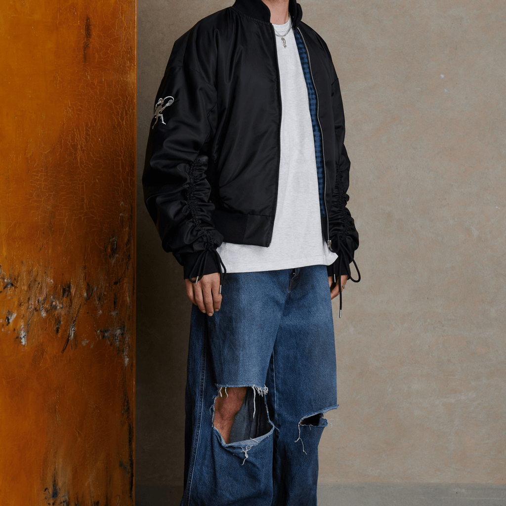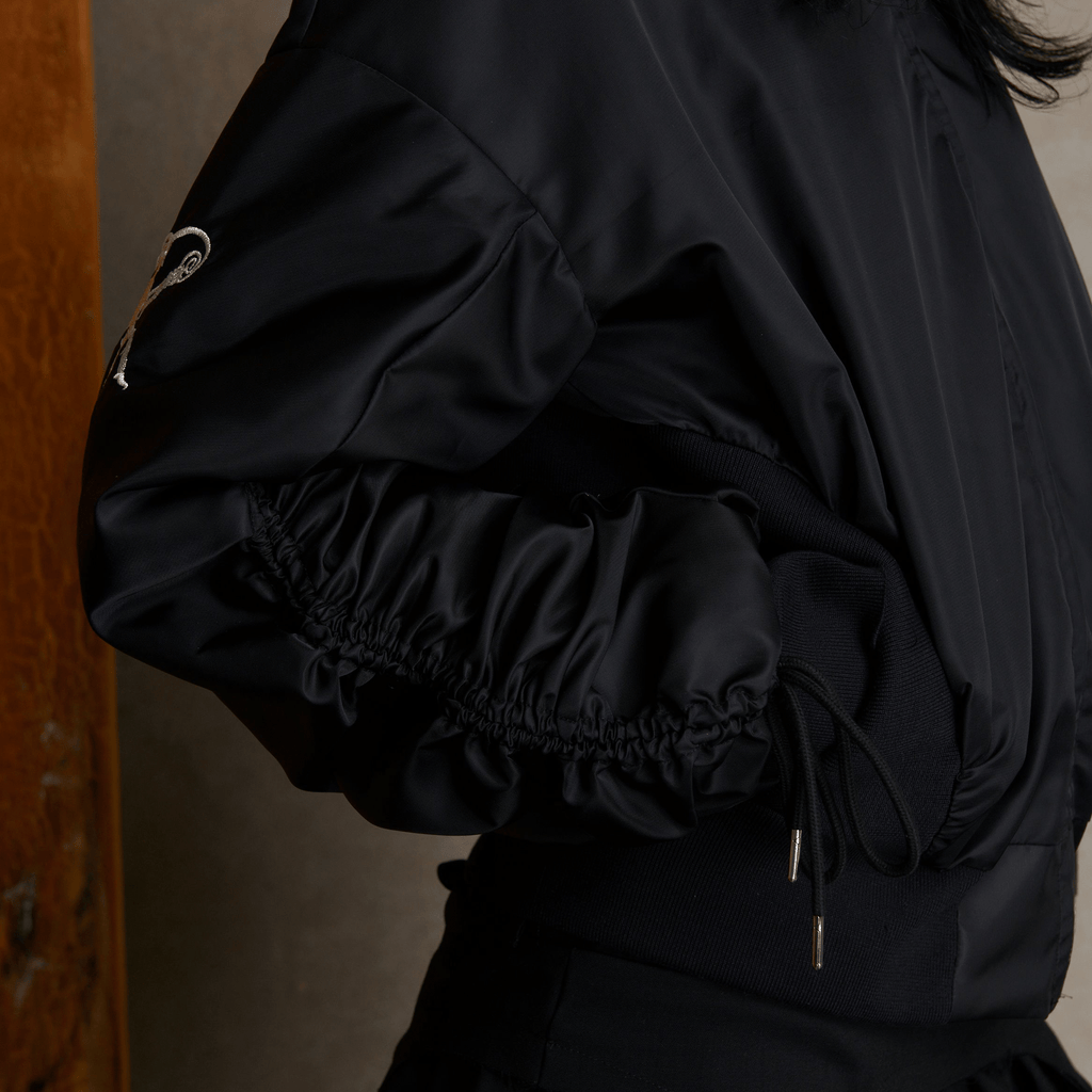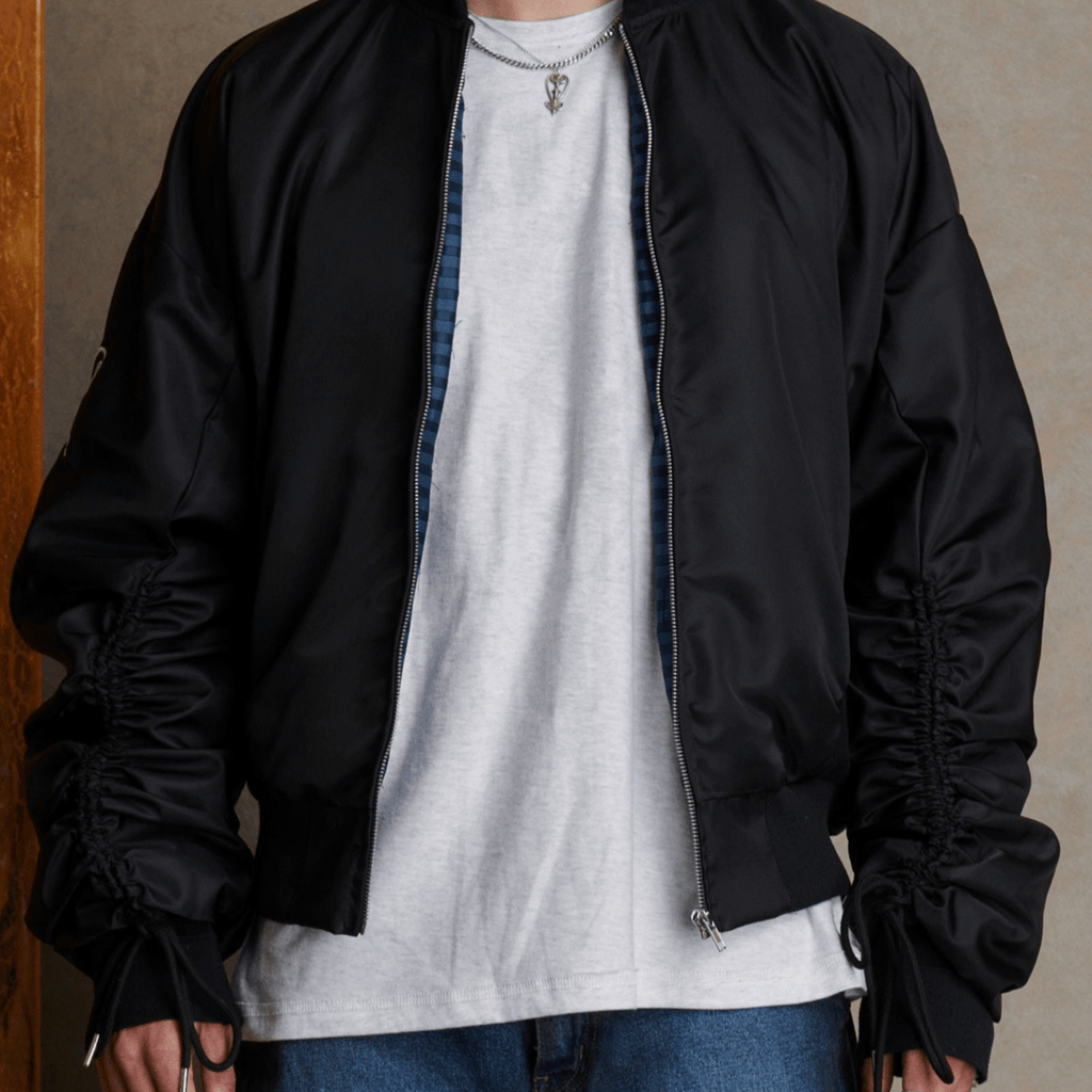 Two ruched channels at the lower arm with cords to shorten or lengthen the length