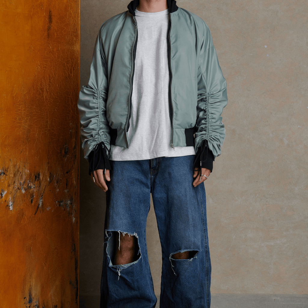 Two ruched channels at the lower arm with cords to shorten or lengthen the length