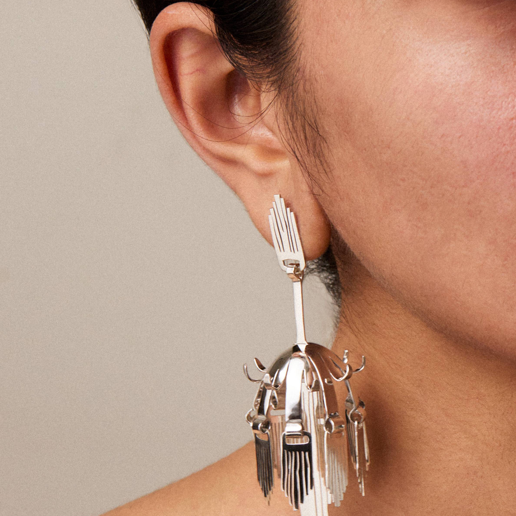 Handcrafted in-house, the top of each jhumka features a carefully shaped dome, intricately cut into strands that curve upward, echoing the flowing lines found in architectural forms. Below, two irregularly hand-drawn sheets of silver are shaped, curved, and joined through loops, creating a dynamic, windchime-like effect with each movement.