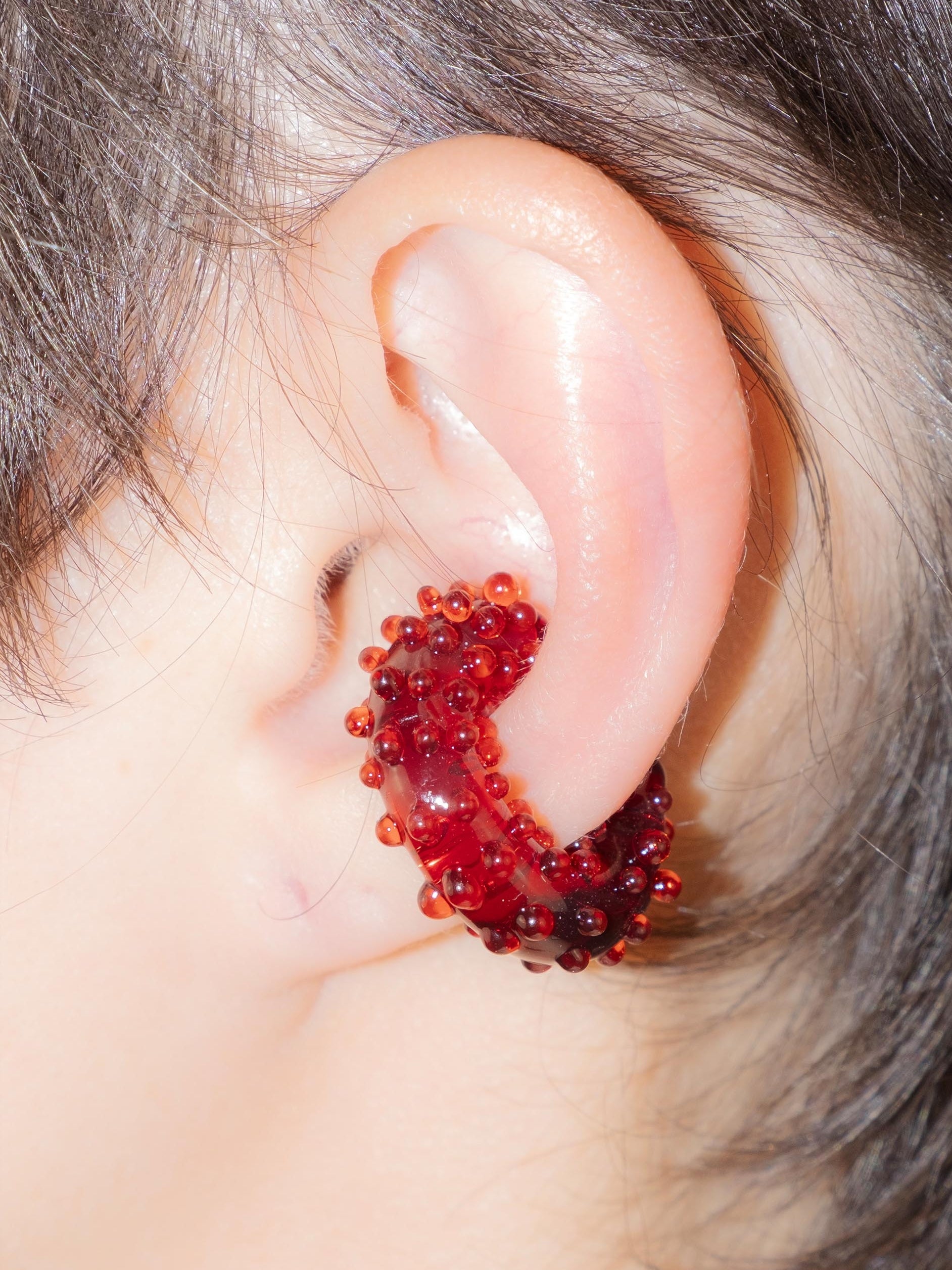 This ear cuff is made from red borosilicate glass and is decorated with small spheres and dots. The pattern forms naturally along the curve, concentrating toward the inner edge. The sculptural surface adds texture without adding weight. The cuff fits securely on the ear without requiring a piercing. Each piece is handmade.