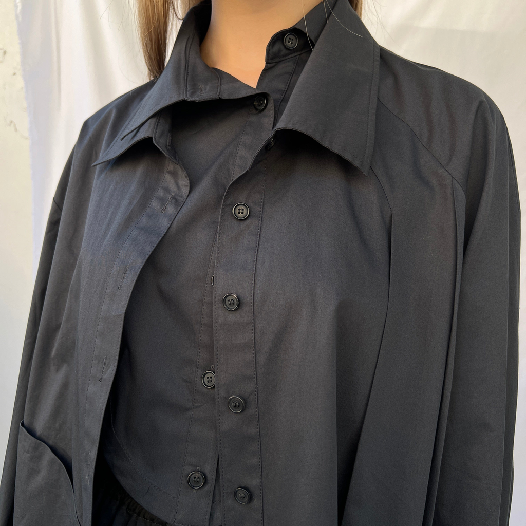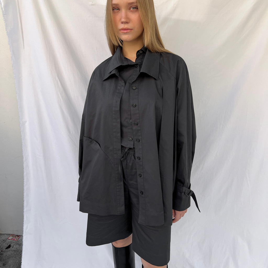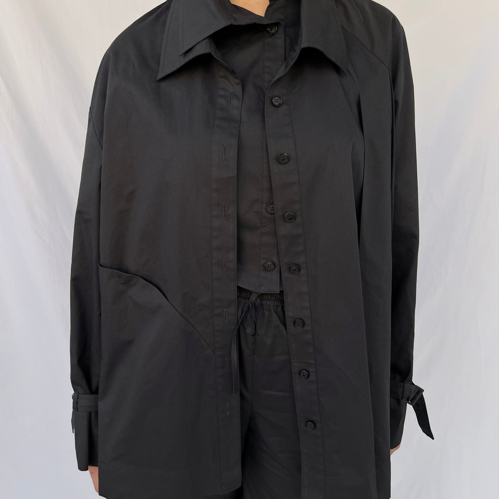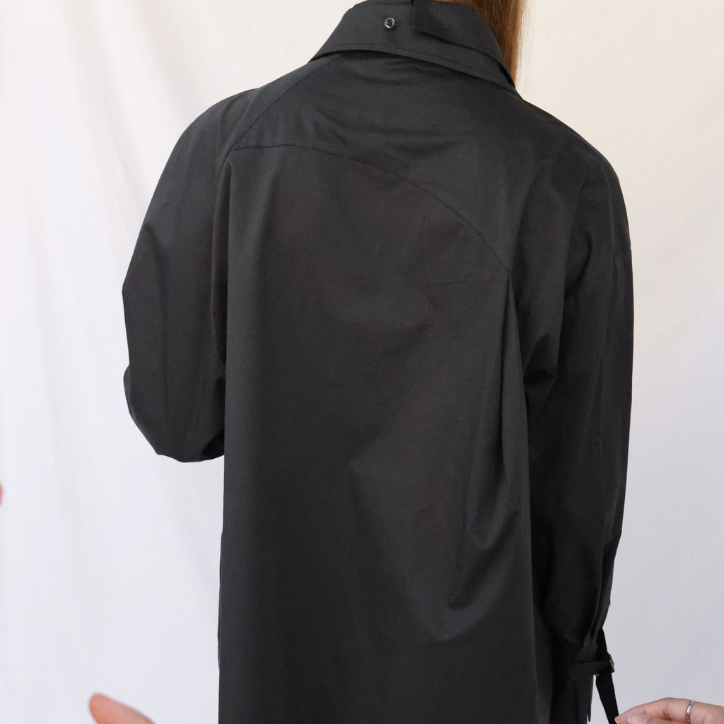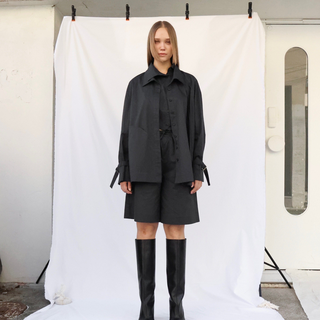 The back collar has a slit, allowing the inner collar to be styled in various ways. The front closure features natural matte horn buttons. Made from 100% cotton twill fabric, it also includes pleated detailing on the sleeves. The buckle on the sleeves gives it a jacket-like feel. The front pockets and back yoke incorporate curves reminiscent of hills.