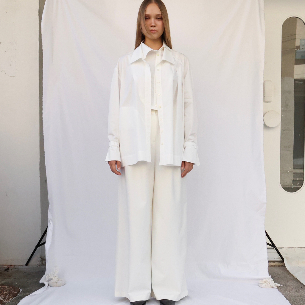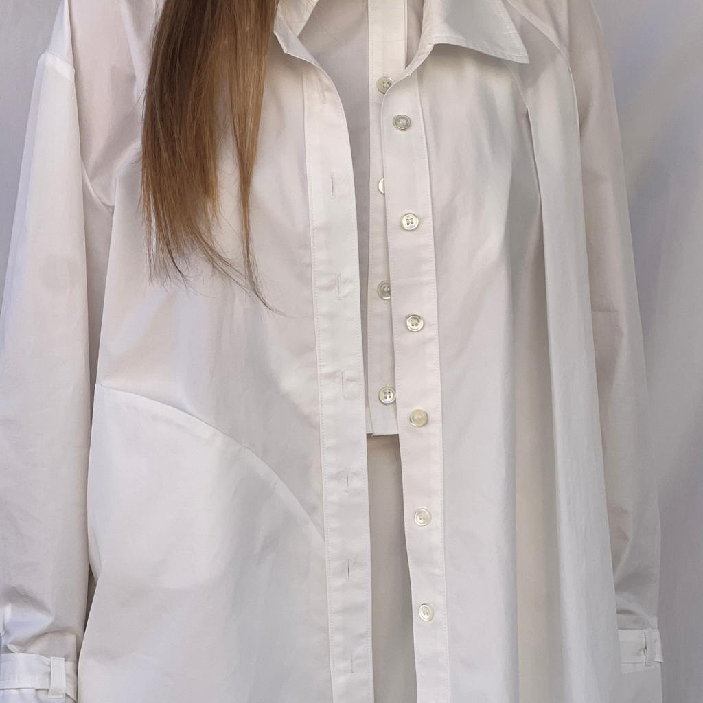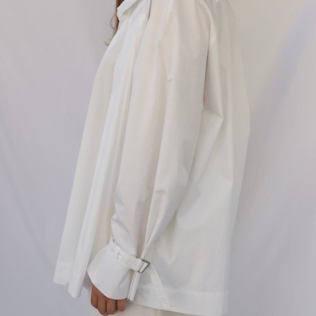 The back collar has a slit, allowing the inner collar to be styled in various ways. The front closure features natural matte horn buttons. Made from 100% cotton twill fabric, it also includes pleated detailing on the sleeves. The buckle on the sleeves gives it a jacket-like feel. The front pockets and back yoke incorporate curves reminiscent of hills.