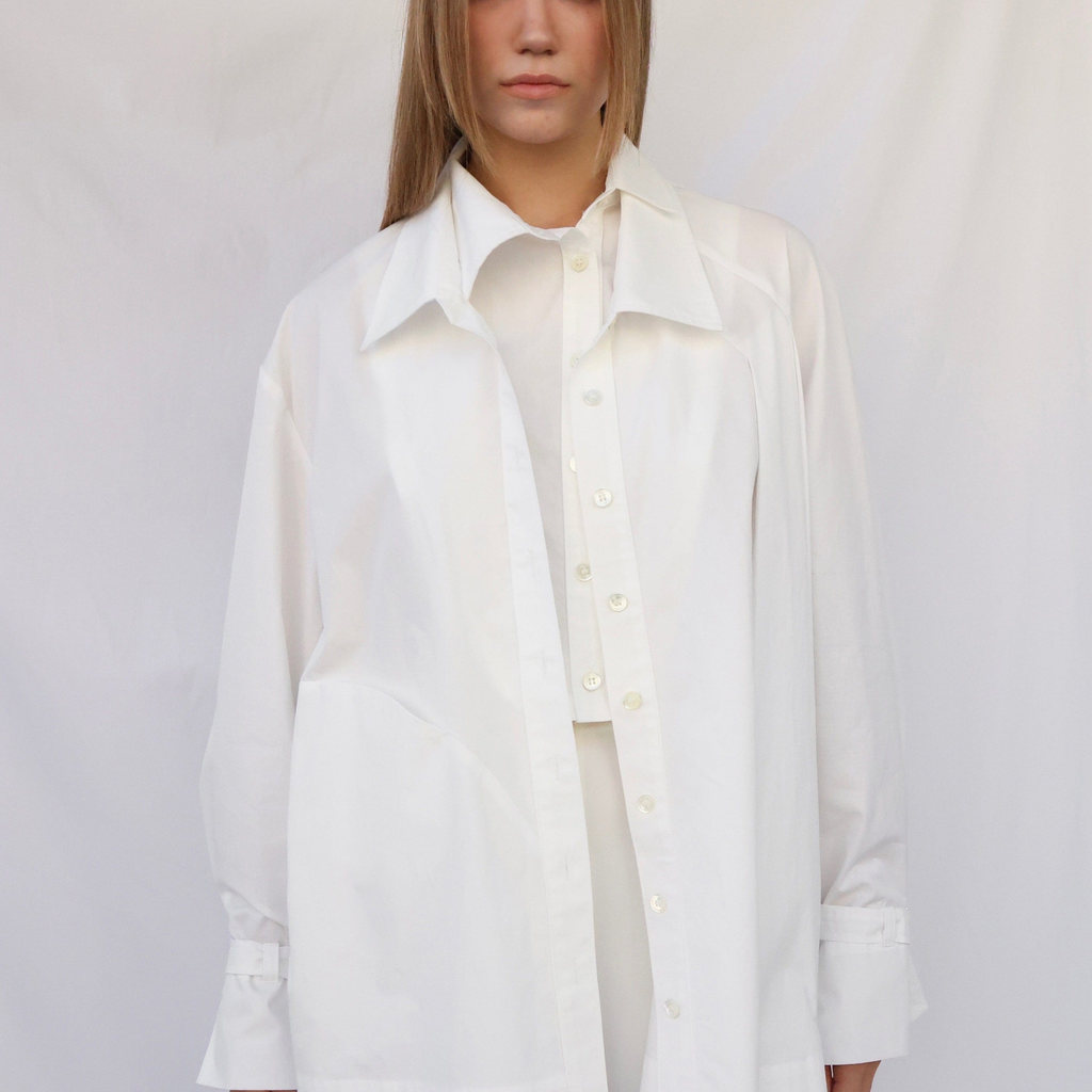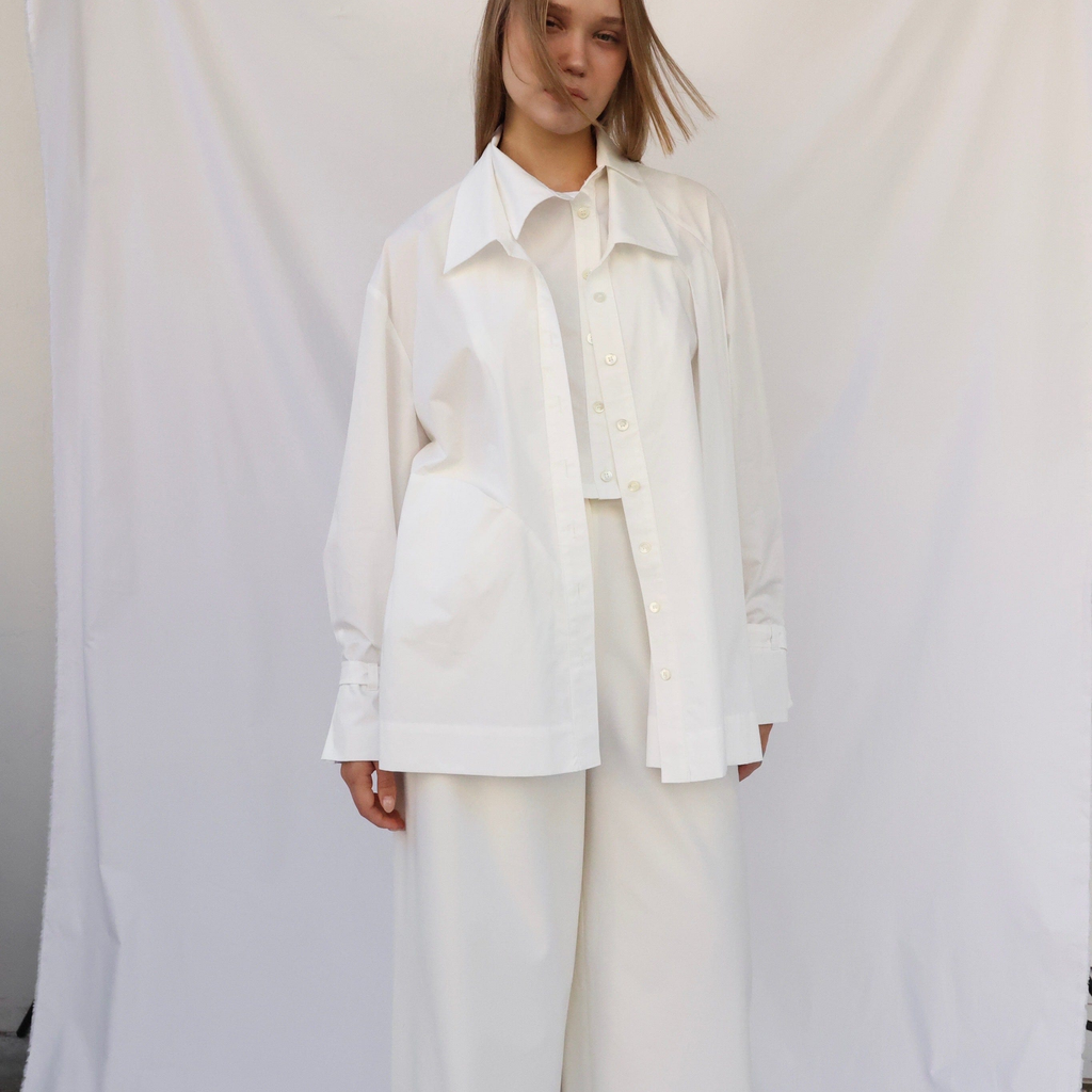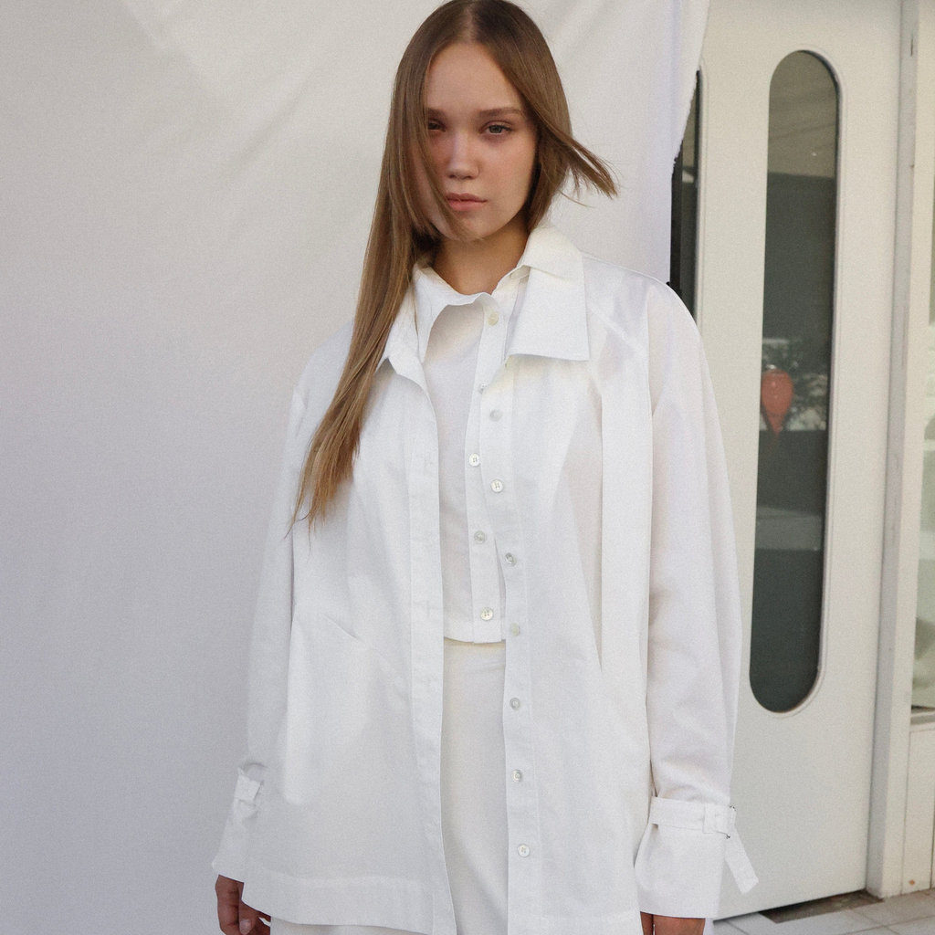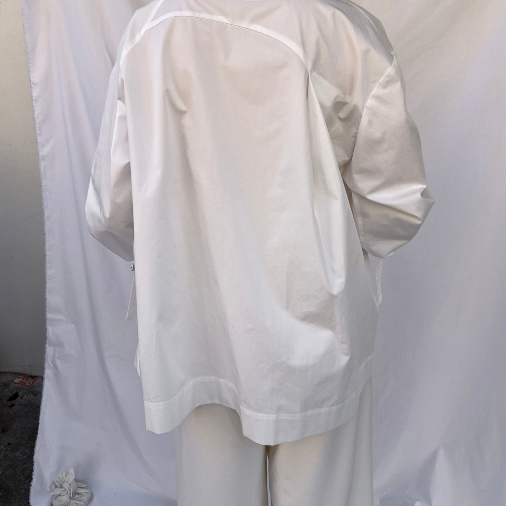 The back collar has a slit, allowing the inner collar to be styled in various ways. The front closure features natural matte horn buttons. Made from 100% cotton twill fabric, it also includes pleated detailing on the sleeves. The buckle on the sleeves gives it a jacket-like feel. The front pockets and back yoke incorporate curves reminiscent of hills.