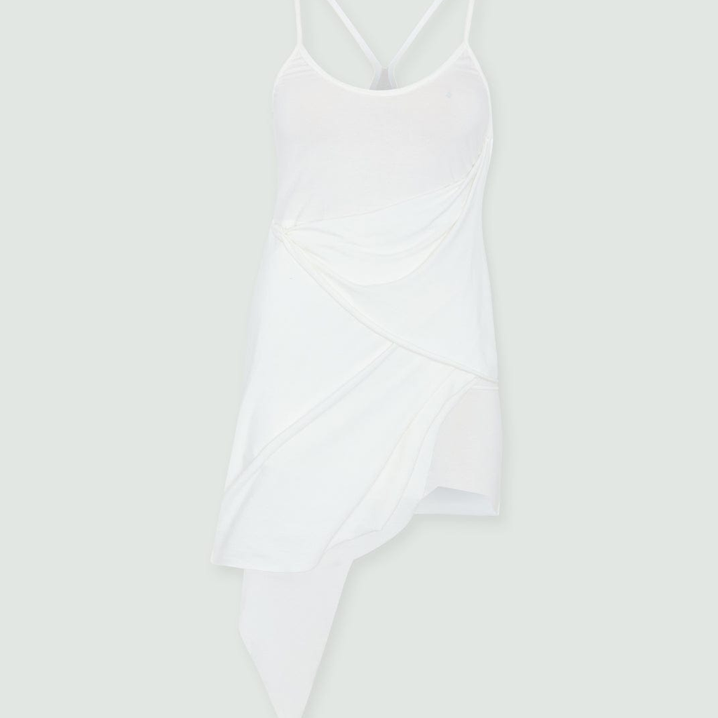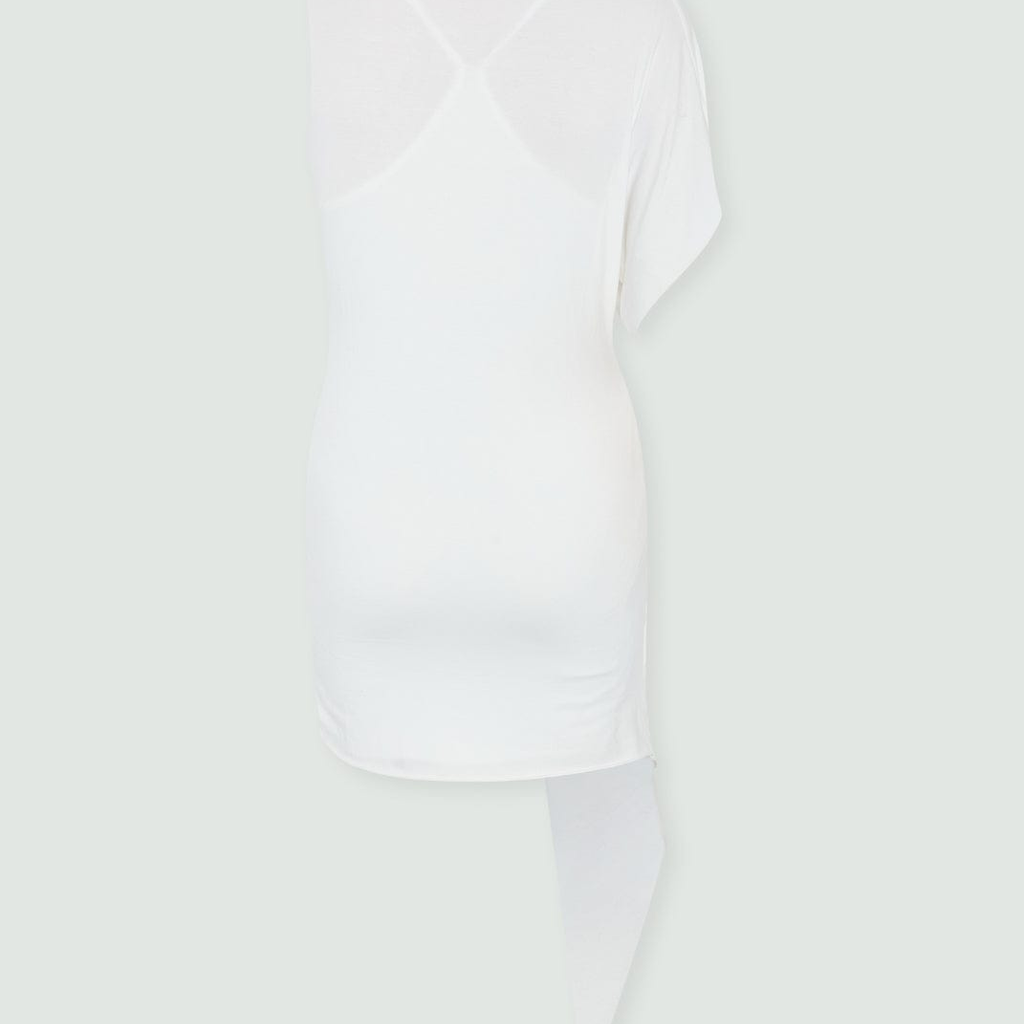 Asymmetric length draped dress in white cotton with twisted side gather. Double layered cowl neckline. Slim fit.