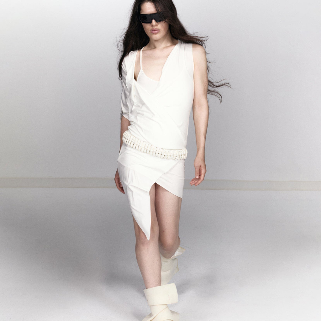 ONRUSHW23FH, a Spanish experimental design brand founded in September 2020 by Albert Sánchez and Sebastian Cameras. Sánchez and Cameras initiate their design journey with a curated amalgamation of influences—movies, images, words, sounds—that coalesce into a substantial mood board. At the core of the duo's creative process lies a seamless integration of digital craftsmanship. 3D prototypes, initially draped over mannequins like canvases, undergo a transformative journey of modification and distortion.