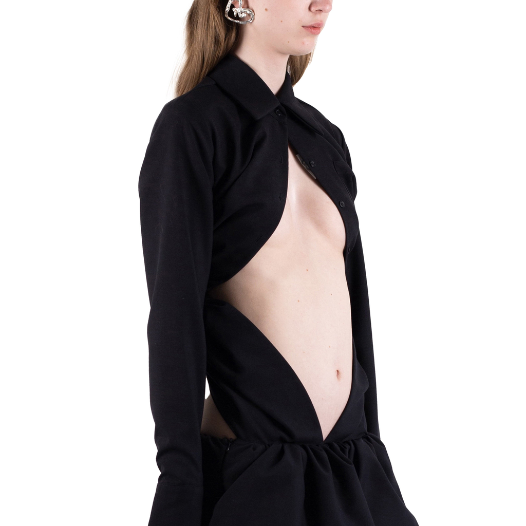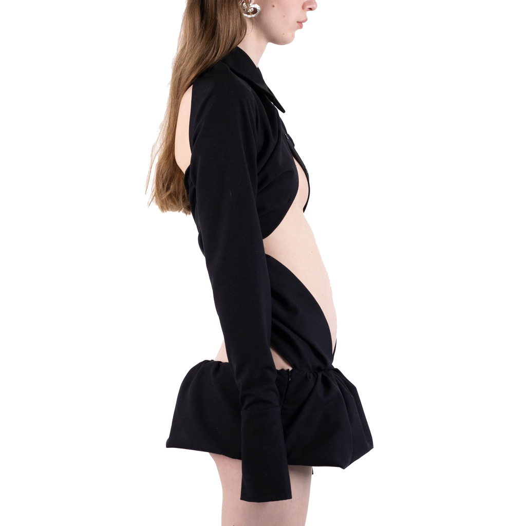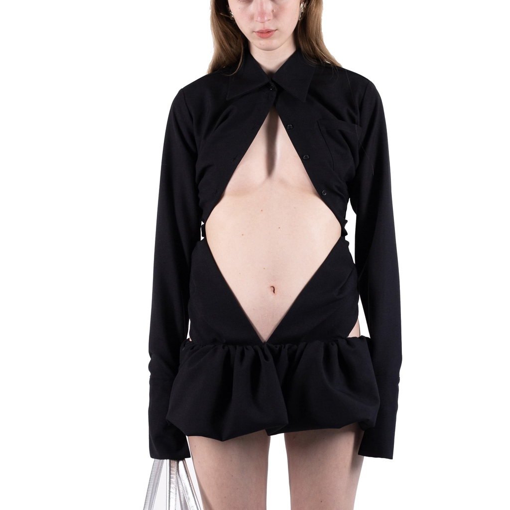 Draped, long sleeve cotton mix dress with a bubble mini skirt. Spread collar. Singular front pocket. Button closure at front. Hidden zipper closure at skirt side.
