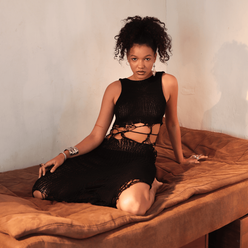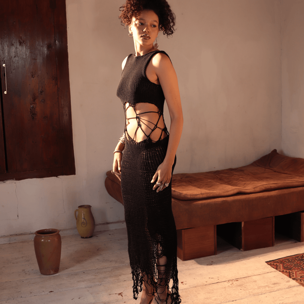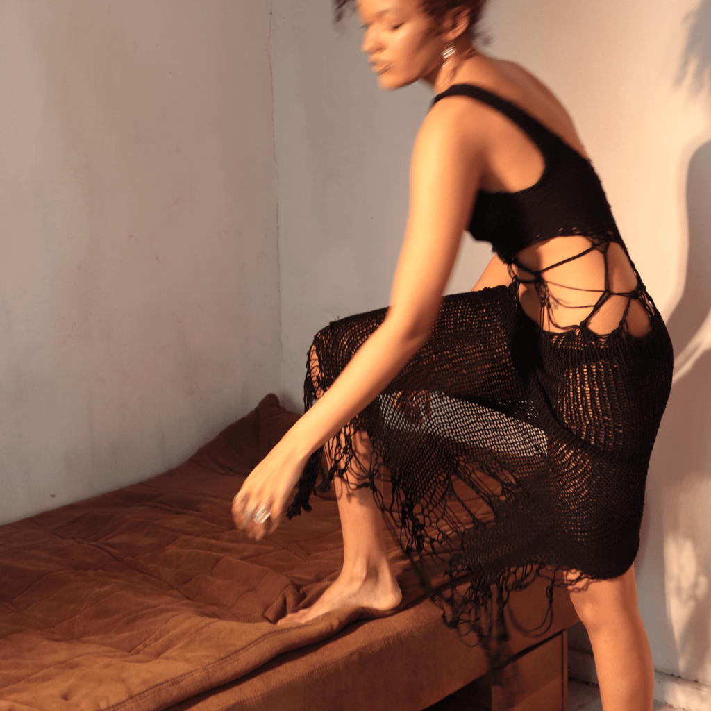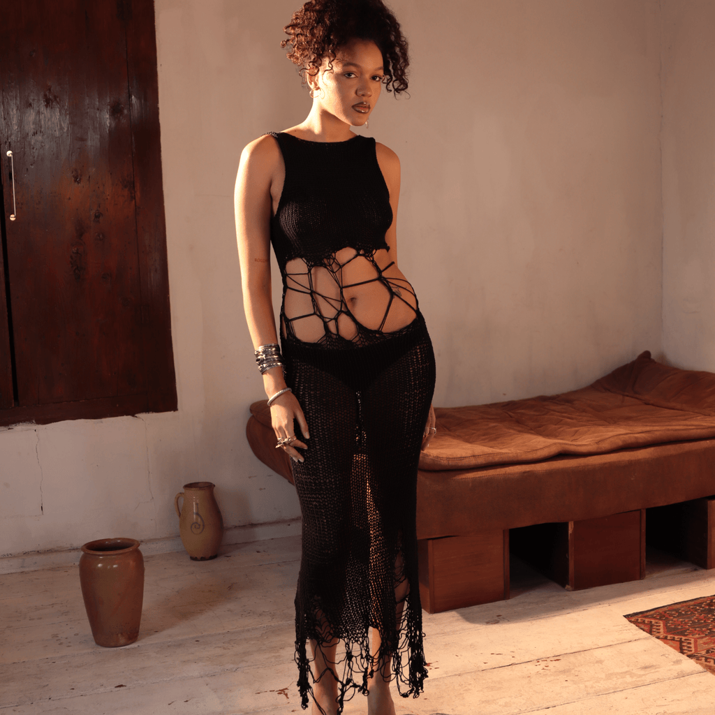 Maxi dress with asymmetric bottom line. Easily stretches. Open back.