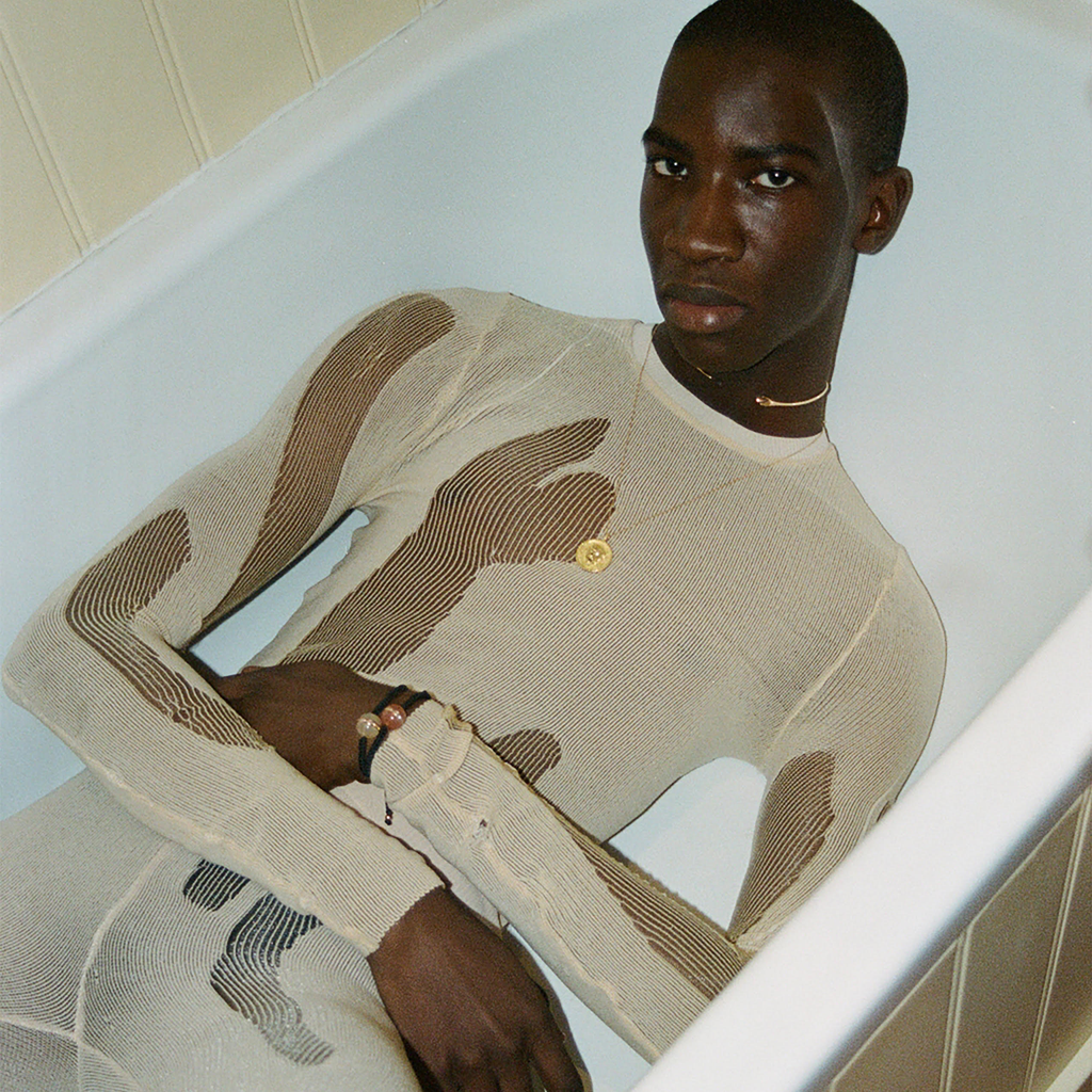 Khanh Brice Nguyen is a London based knitwear brand which offers a wardrobe of intimate and gender fluid garments. Inspired by contemporary dance, the label’s knits are draped directly onto the body, playfully enhancing the silhouette. Renowned for its signature 'drop stitch' top, each piece contours the wearer’s body in a new light.