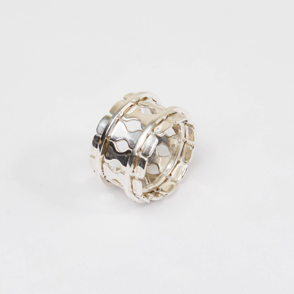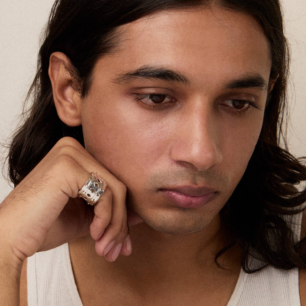 The Drum Ring is a fusion of two signature designs—the Crest Ring and the Kanta Ring—reimagined with a bold, rhythmic structure. Handcrafted in-house, it features a double-band framework that is carefully shaped to hold curved silver sheets, reminiscent of the staves of a drum. These inserts are slotted between the bands, allowing for subtle movement that gives the piece a dynamic quality.