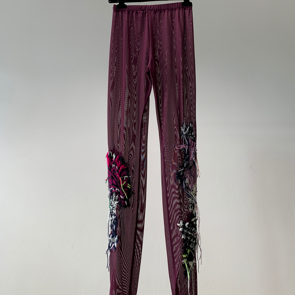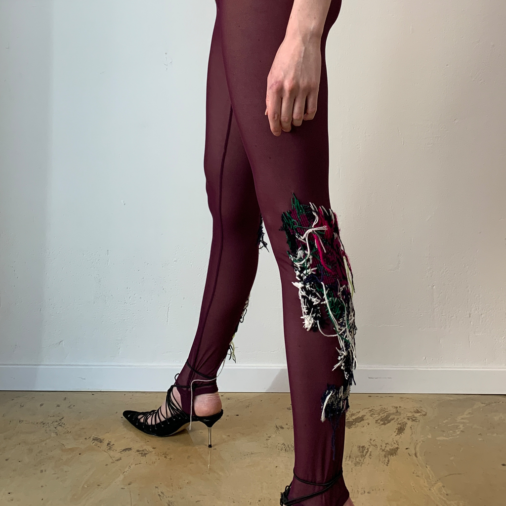 High-waisted see-through burgundy leggings with hand embroidered details