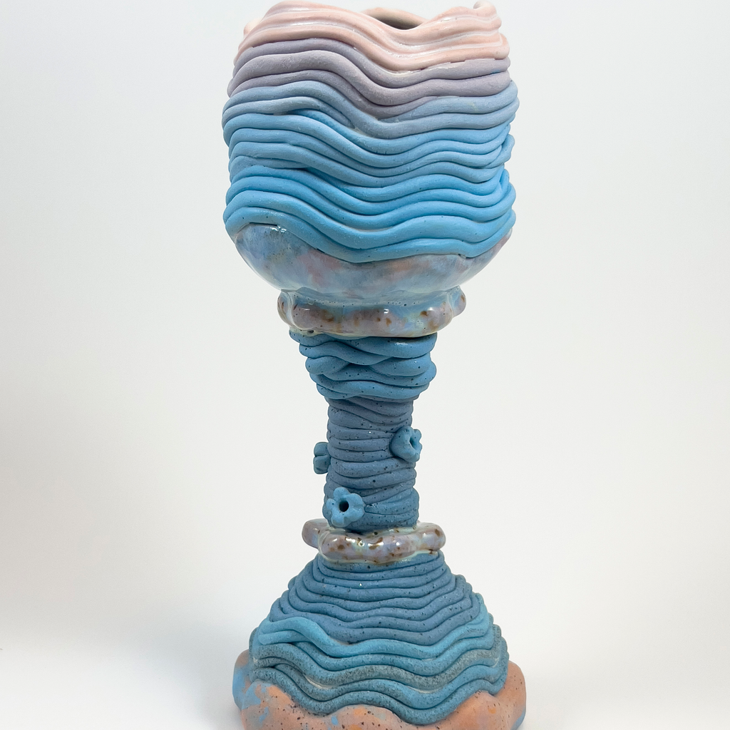 Exposed coiled goblet with flowers in blue, pink and purple tones. Holds 6 oz. Food safe, hand wash only.