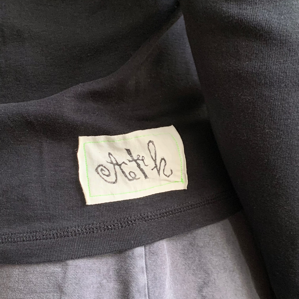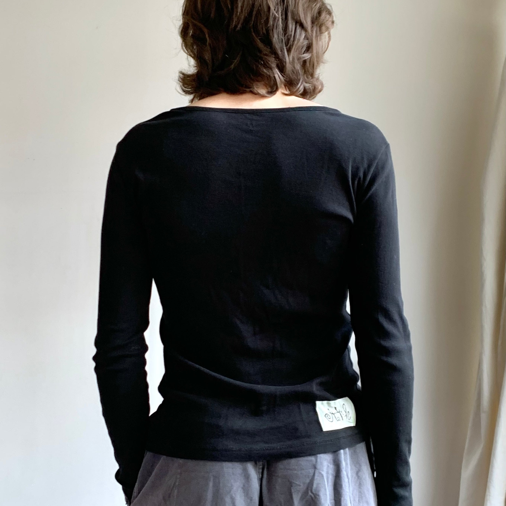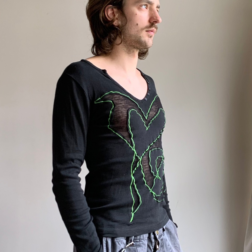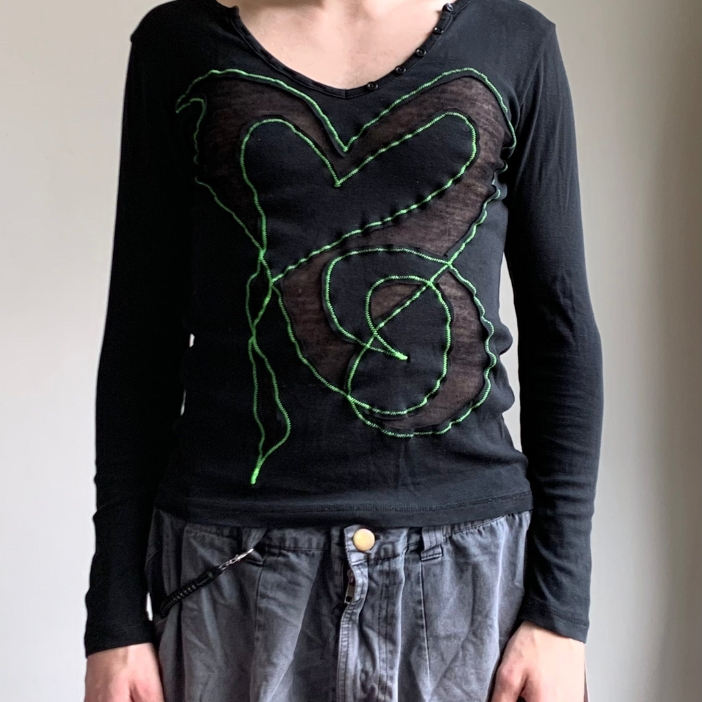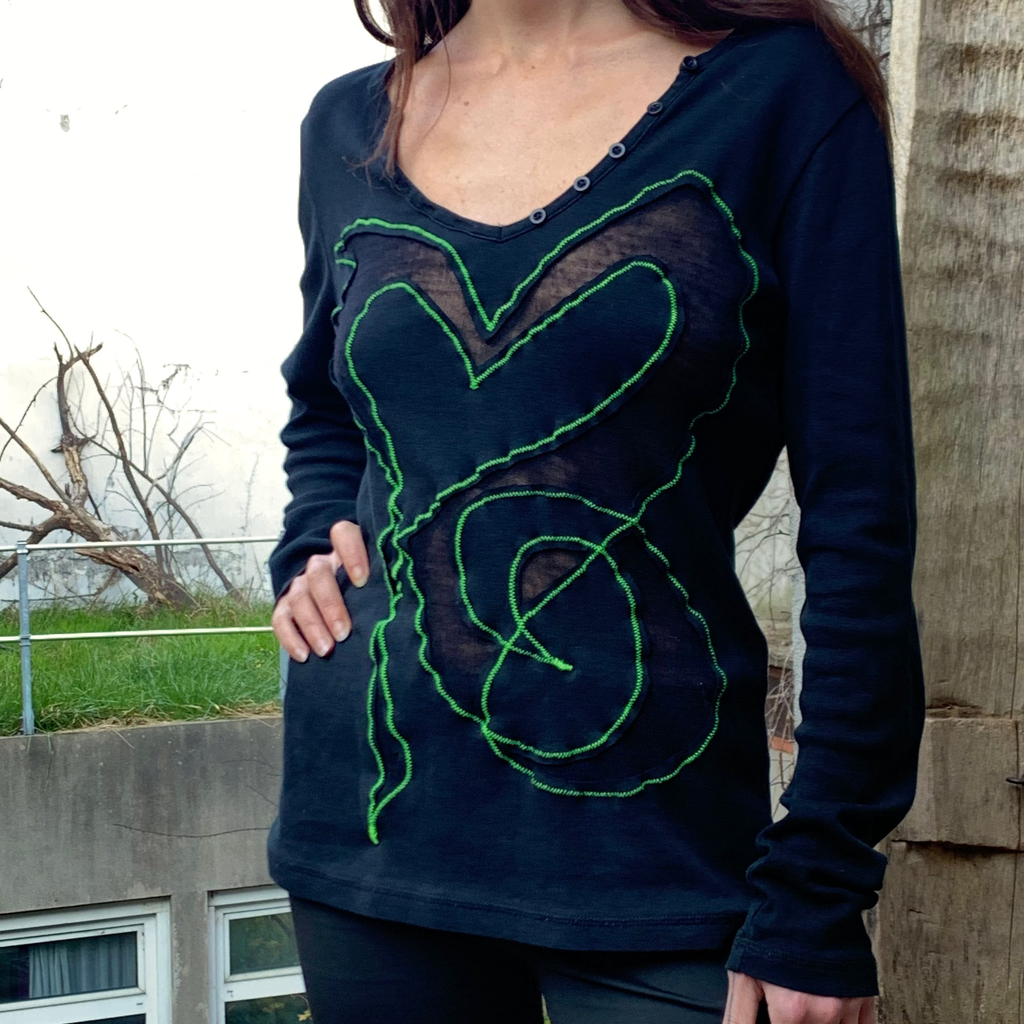 1 of 1 top embroidered with black woolen transparent jersey. Fluo green stitches.
