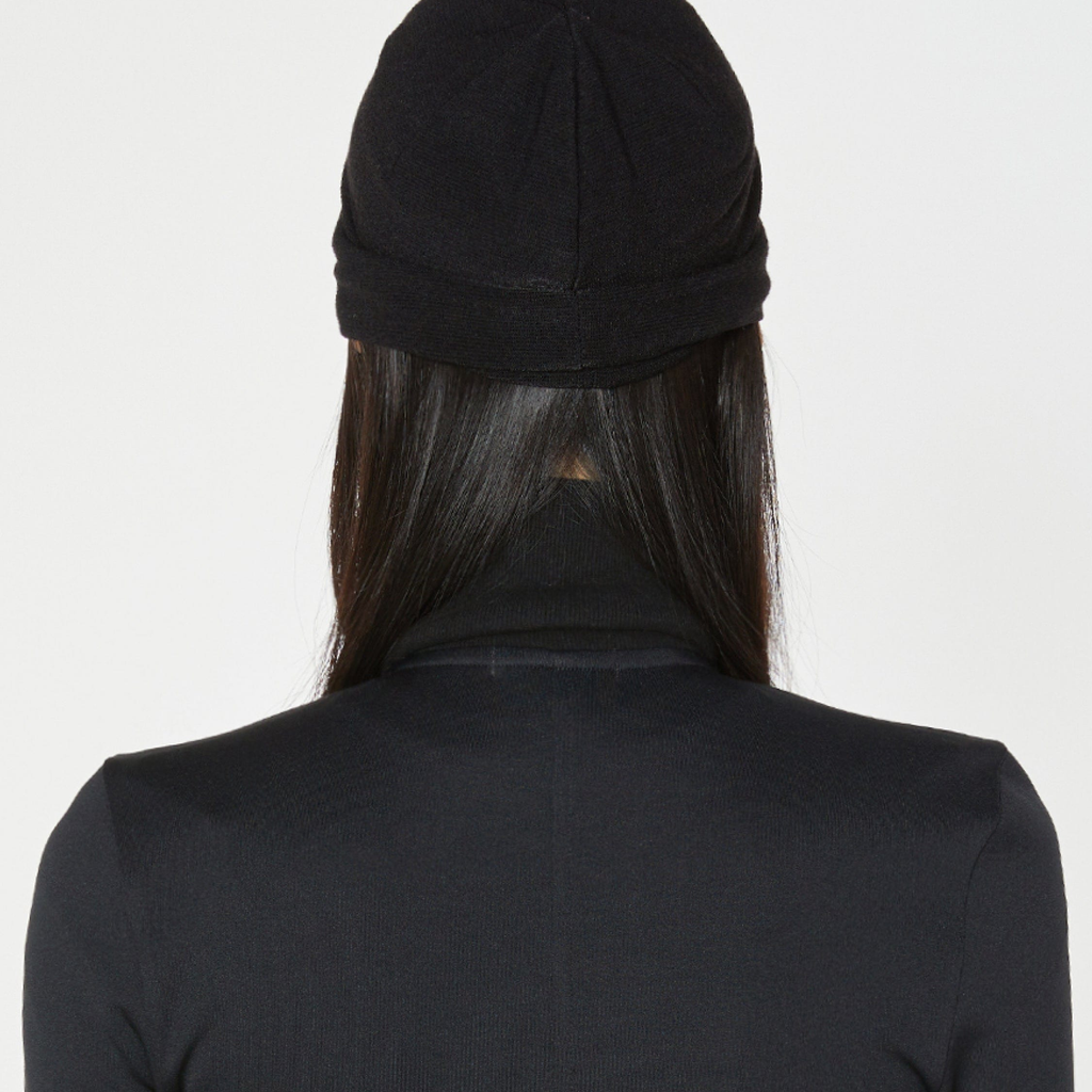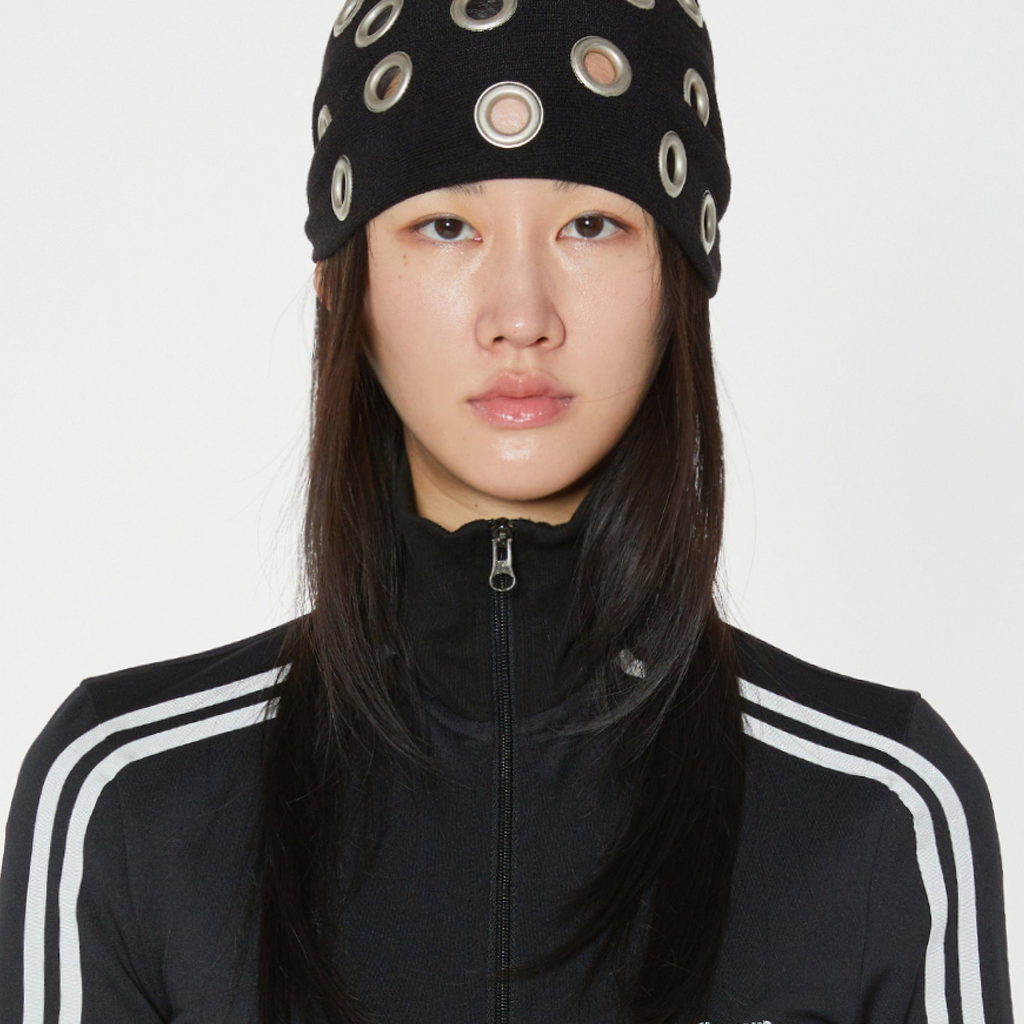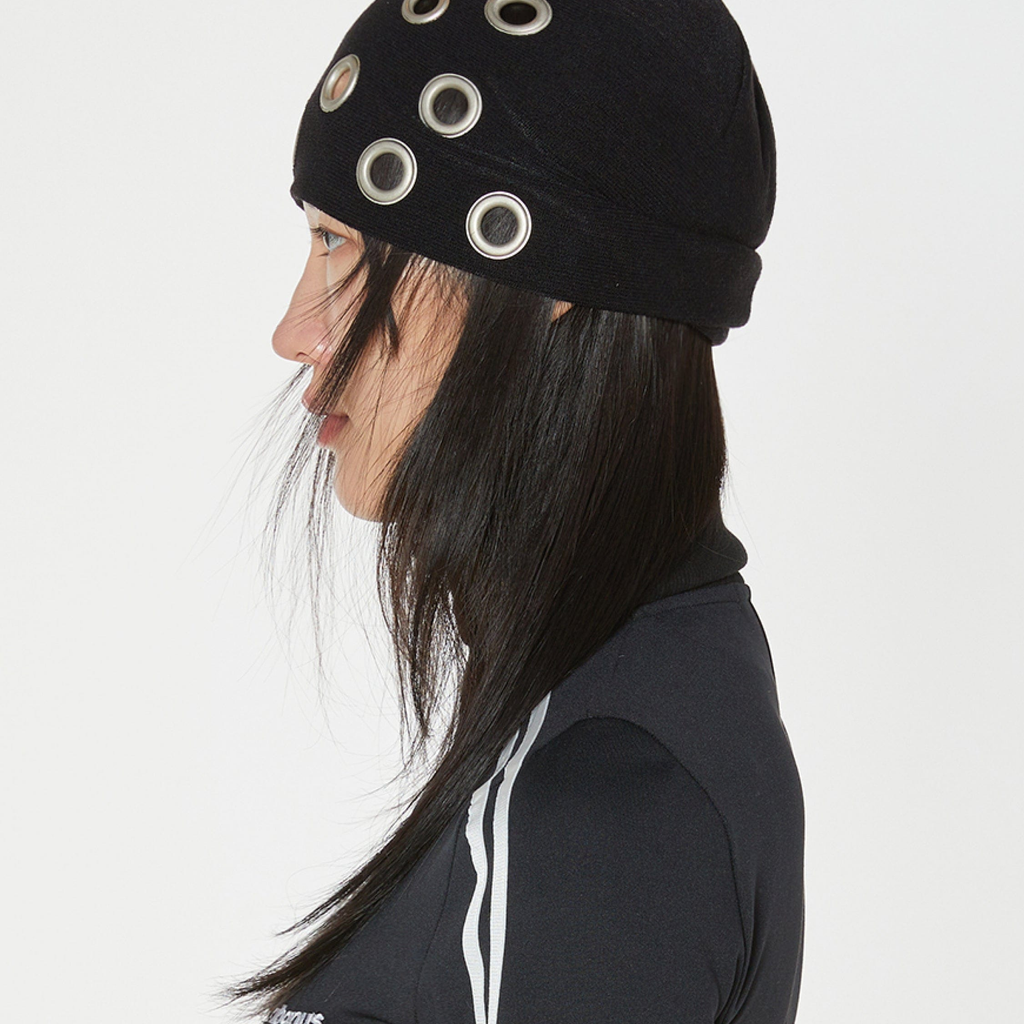 Fabric beanie with eyelets. Fold the back to fit your head size or wear it loose.
