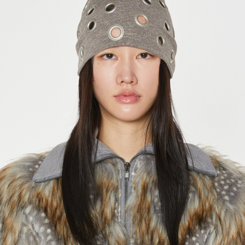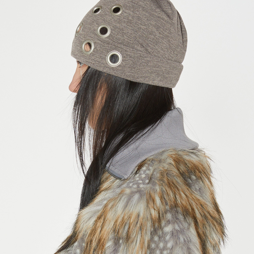 Fabric beanie with eyelets. Fold the back to fit your head size or wear it loose.