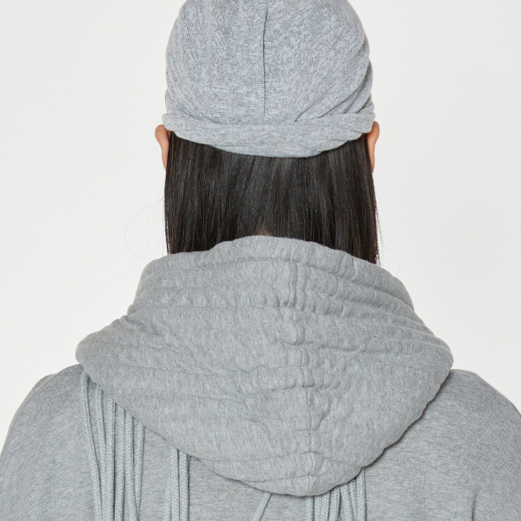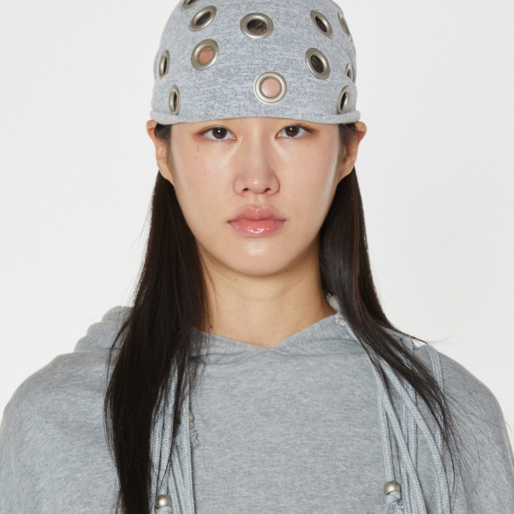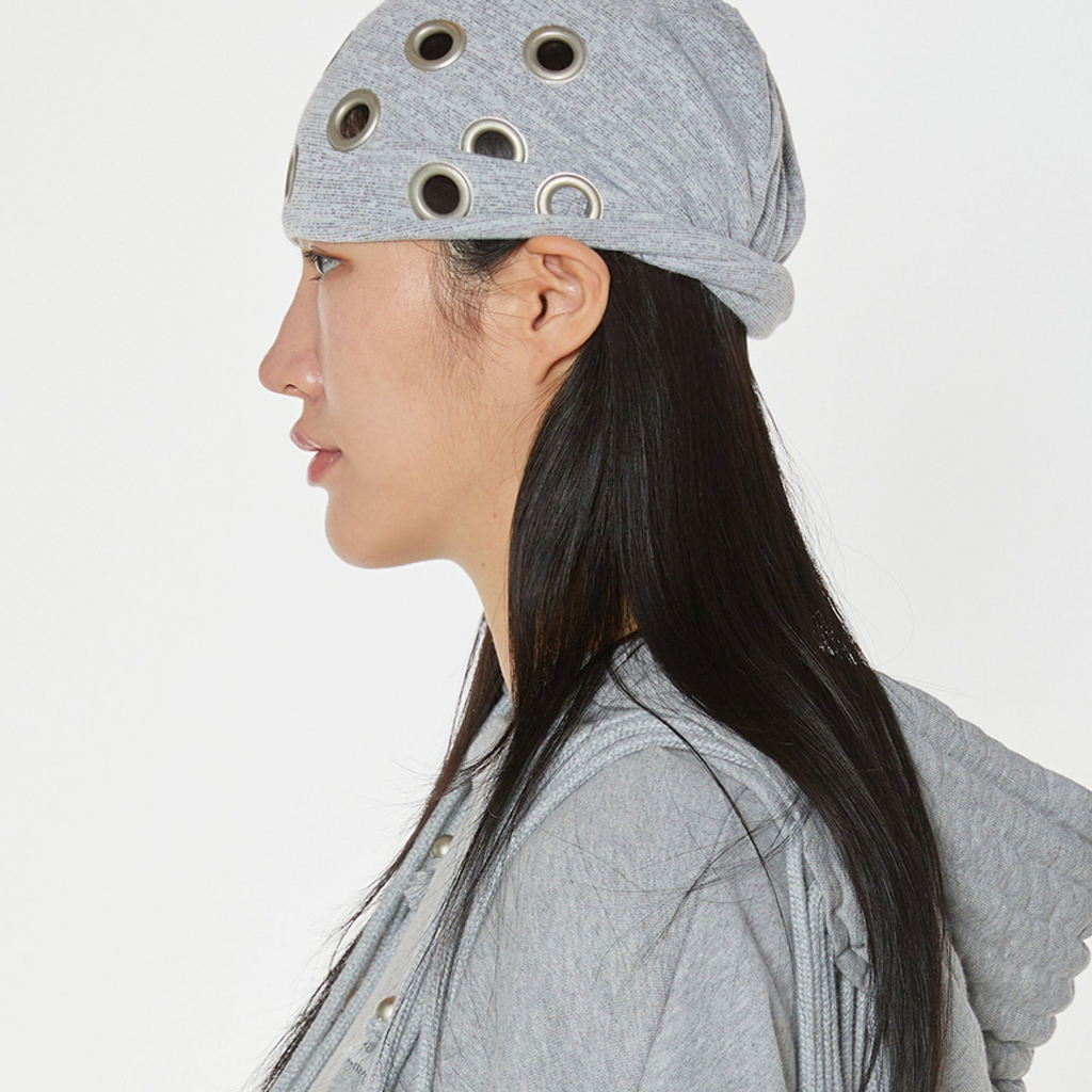 Fabric beanie with eyelets. Fold the back to fit your head size or wear it loose.