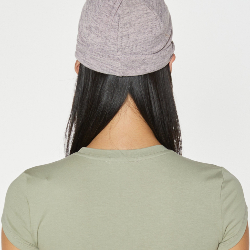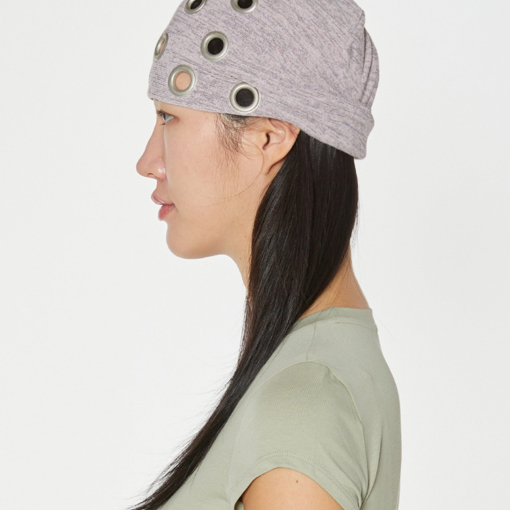 Fabric beanie with eyelets. Fold the back to fit your head size or wear it loose.