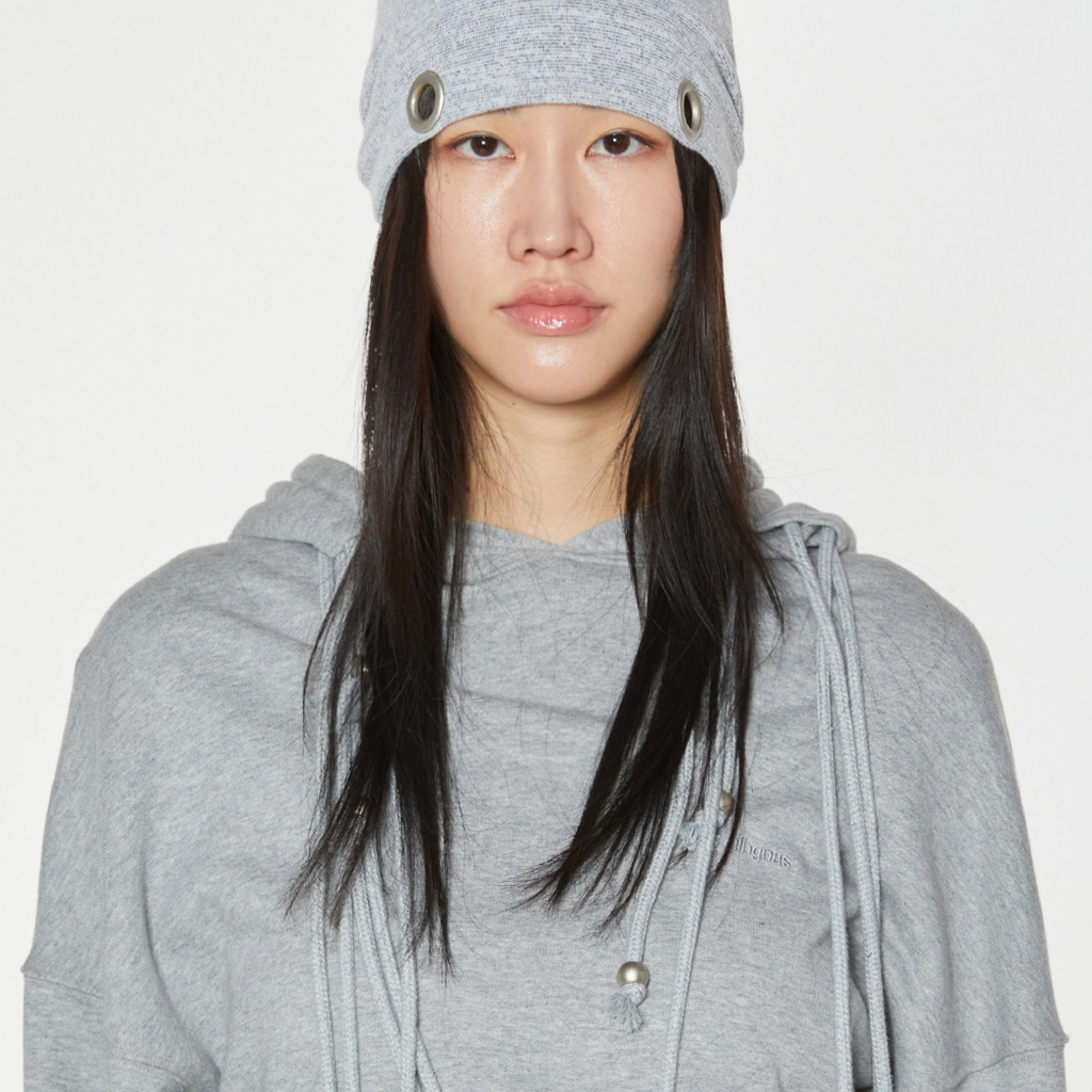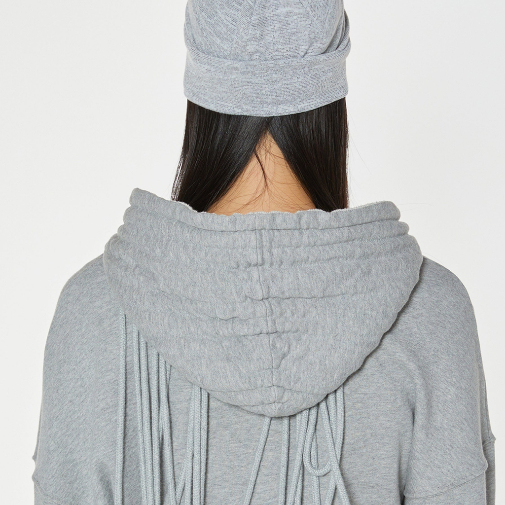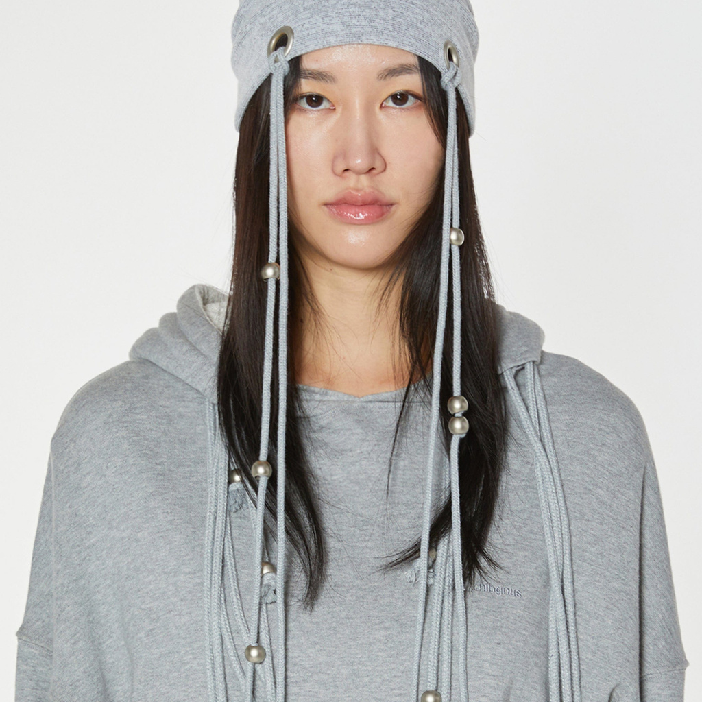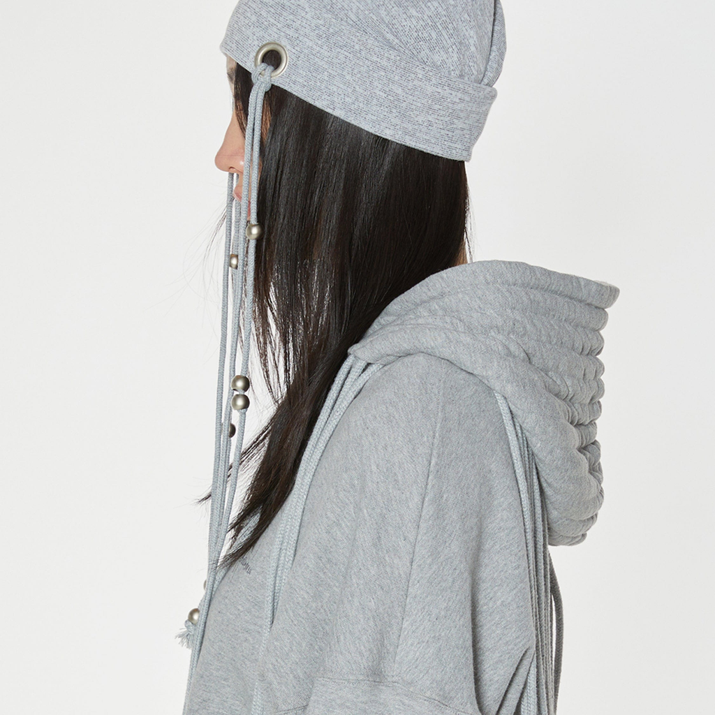 Fabric beanie with 2 detachable strings. Fold the back to fit your head size or wear it loose.