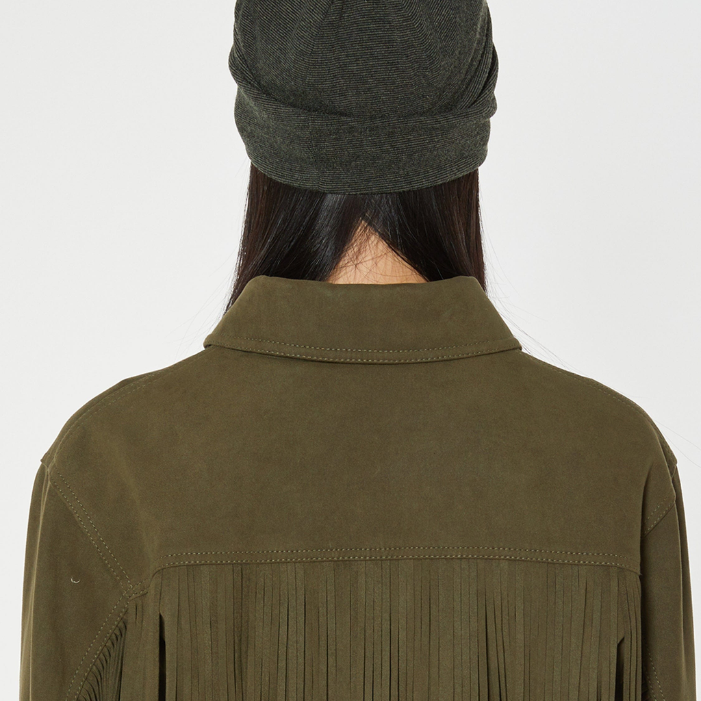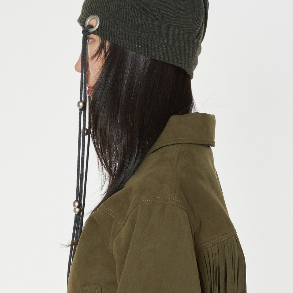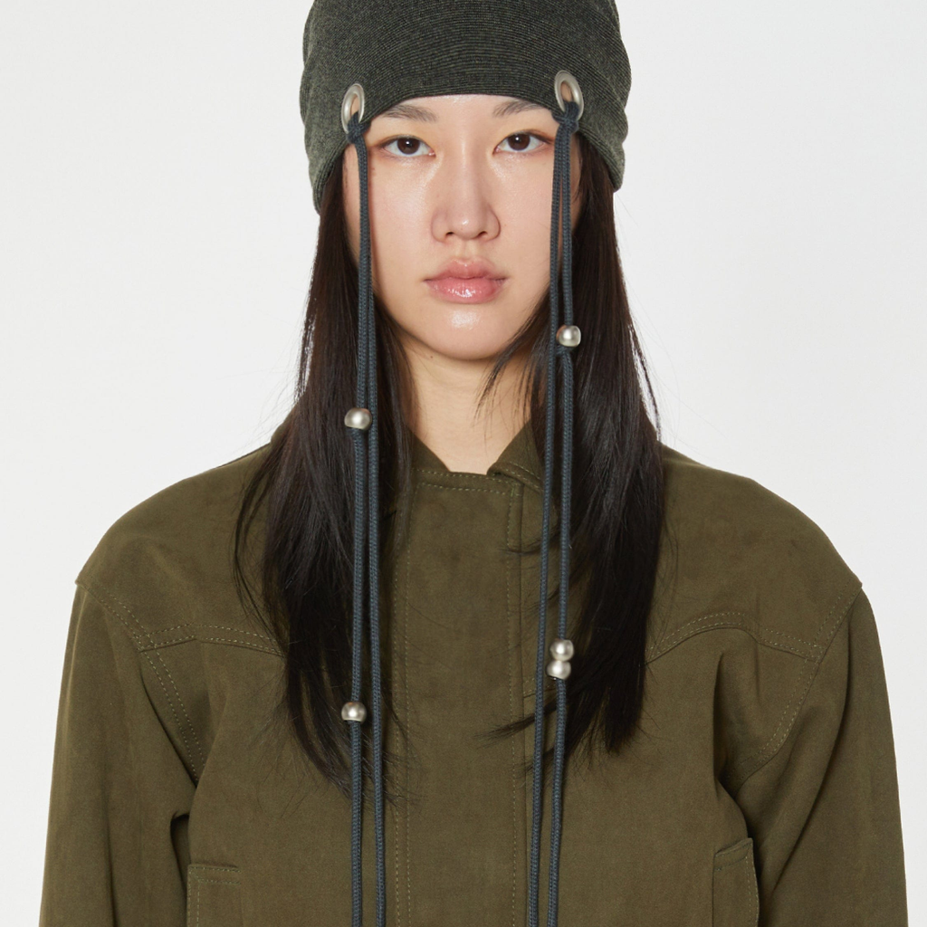 Fabric beanie with 2 detachable strings. Fold the back to fit your head size or wear it loose.