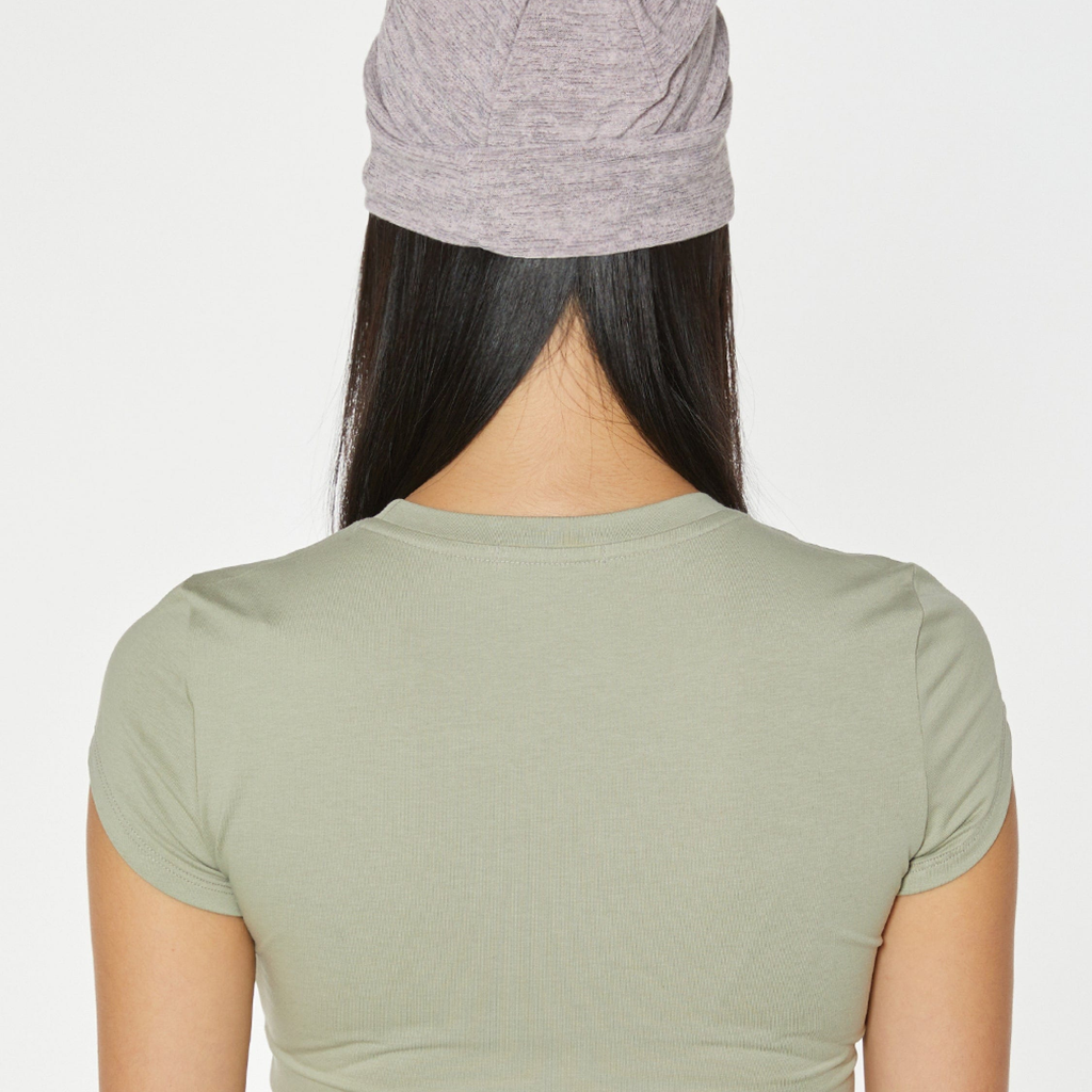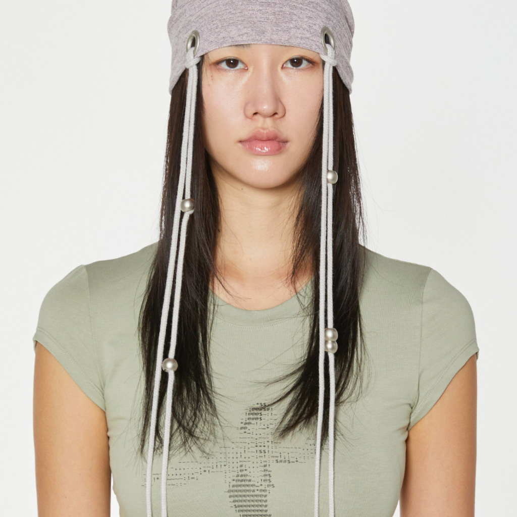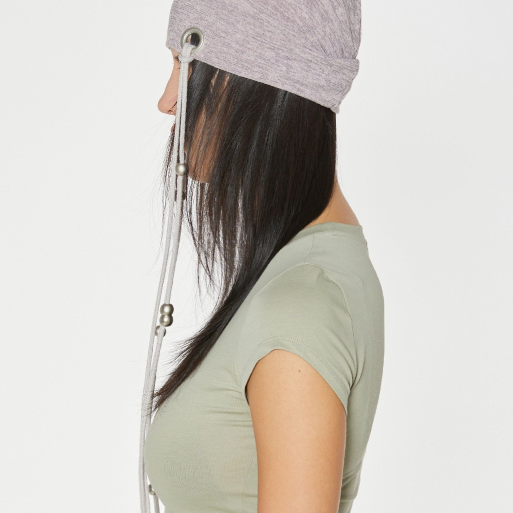Fabric beanie with 2 detachable strings. Fold the back to fit your head size or wear it loose.