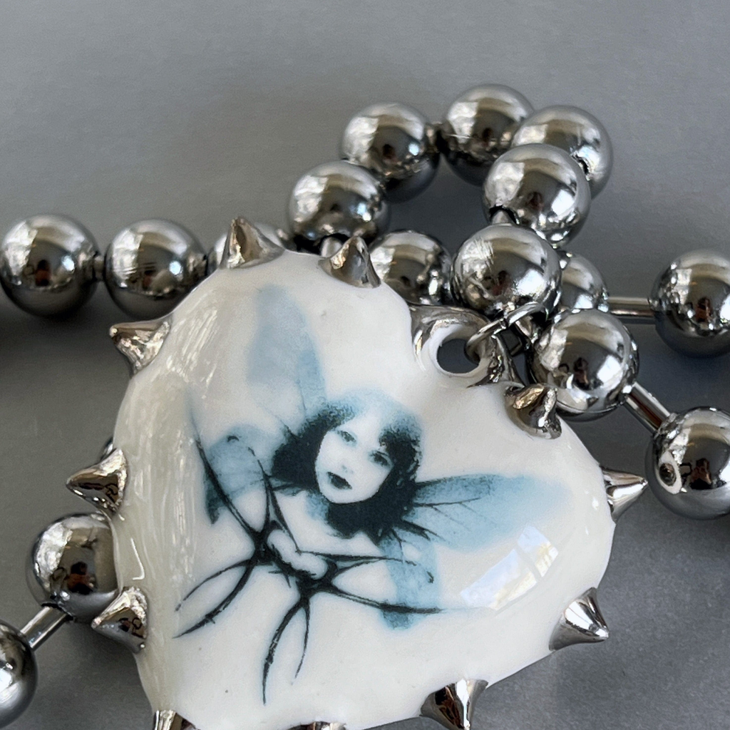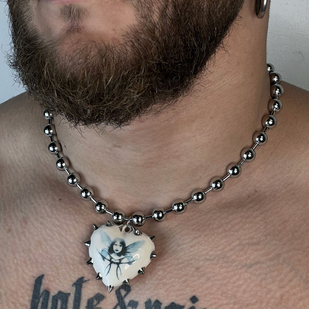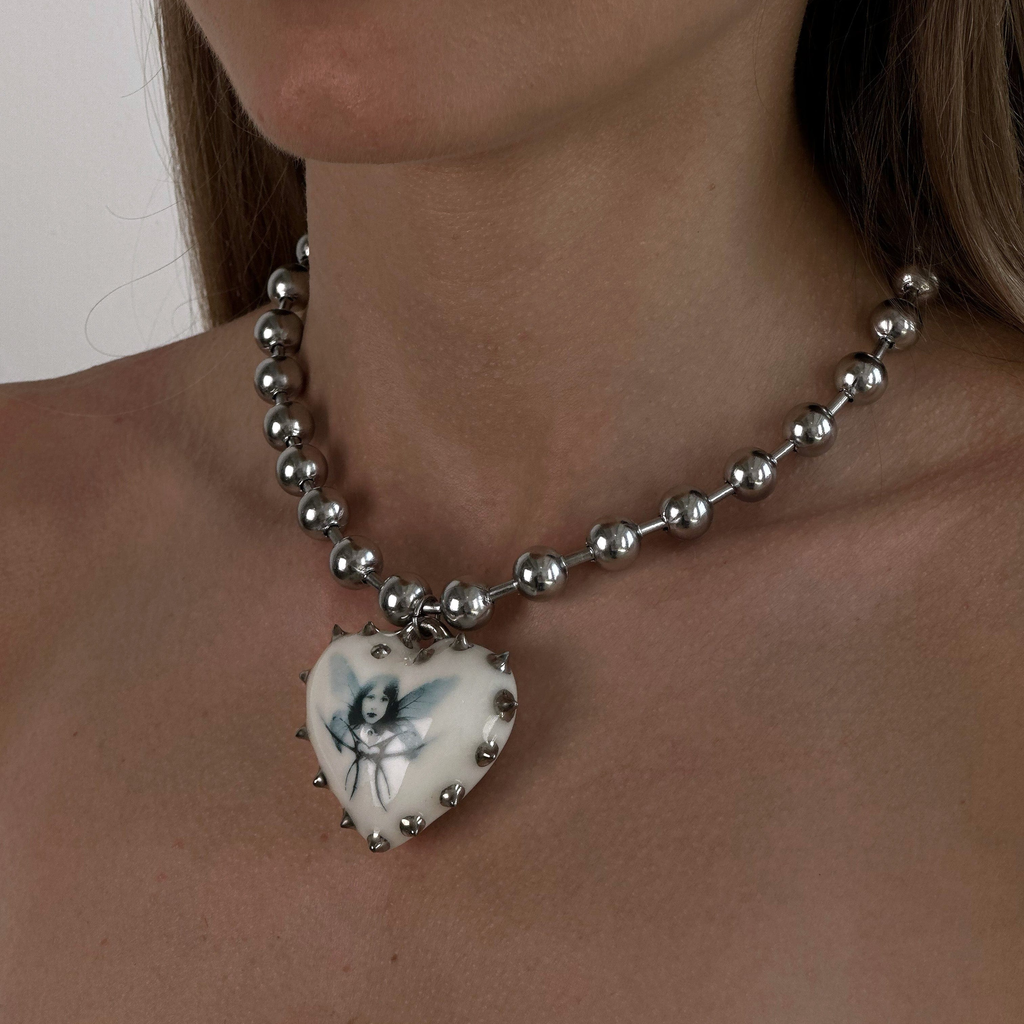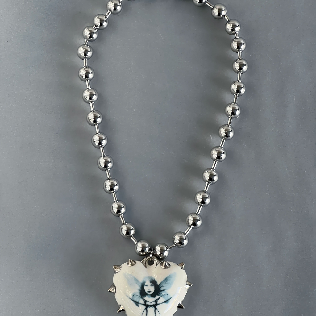 Glazed white porcelain heart pendant is adorned with platinum coated spikes and ceramic decals. Stainless steel 10mm diameter ball chain. The design applied to the porcelain is an original tattoo sketch by the artist 54.43_20.30. The print and platinum elements are applied using special ceramic compositions that are fired at 800 degrees, ensuring high wear resistance.