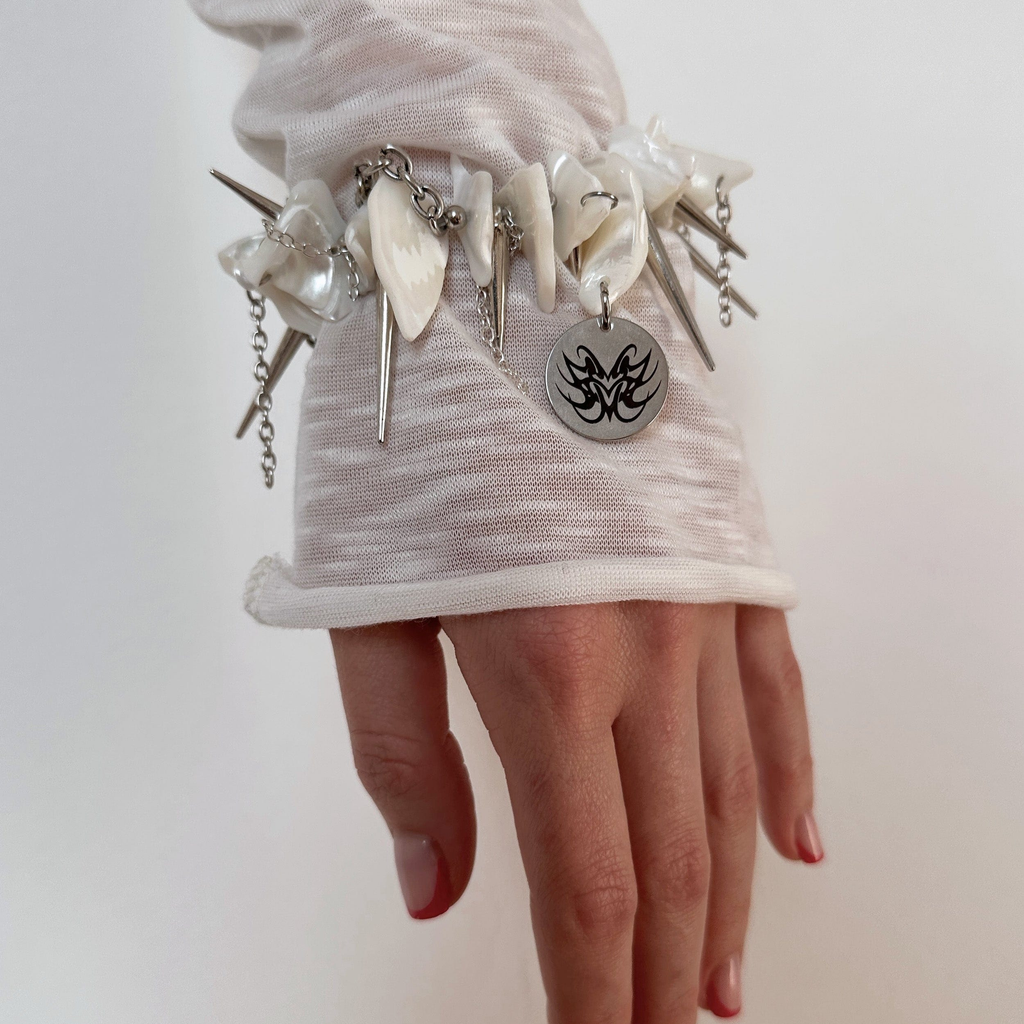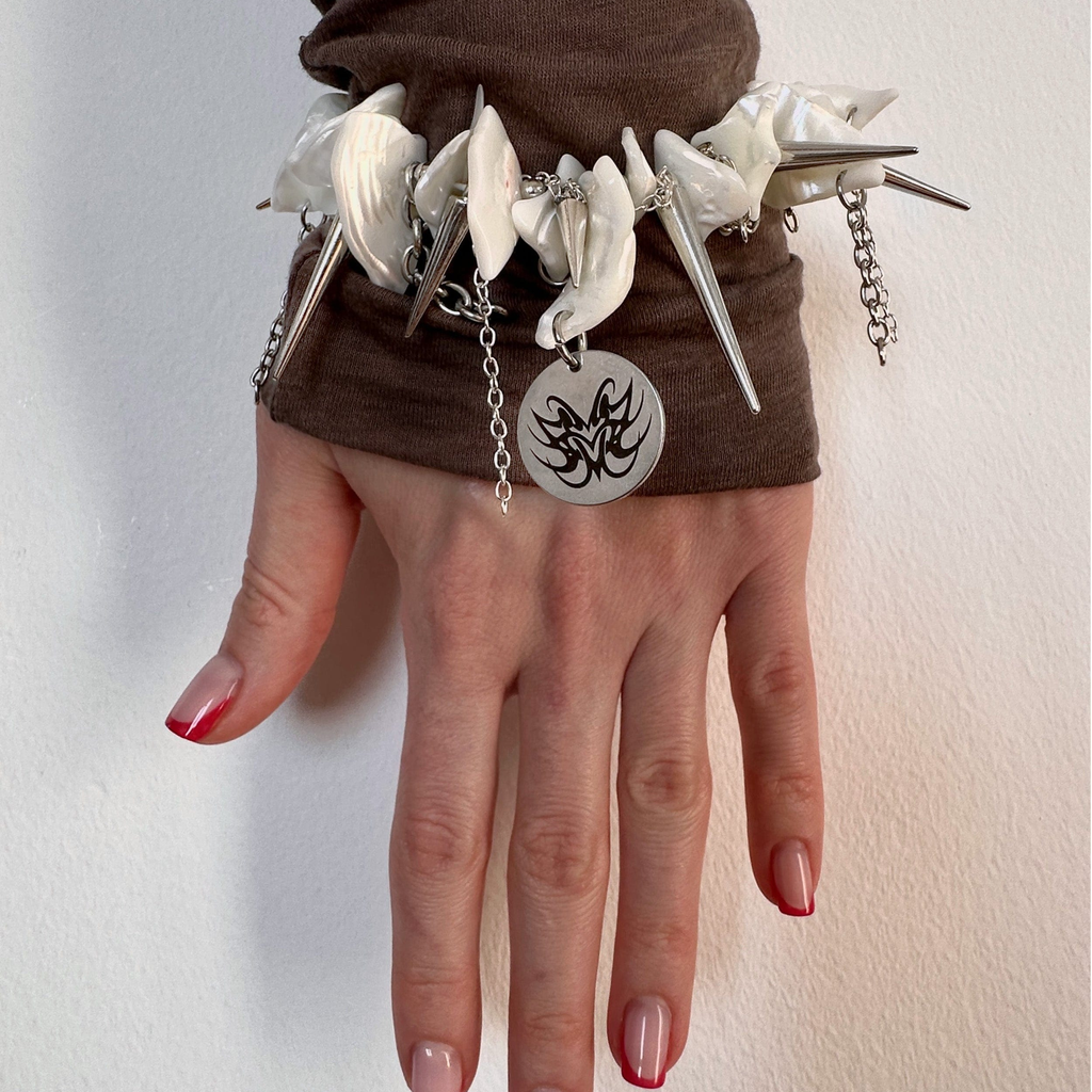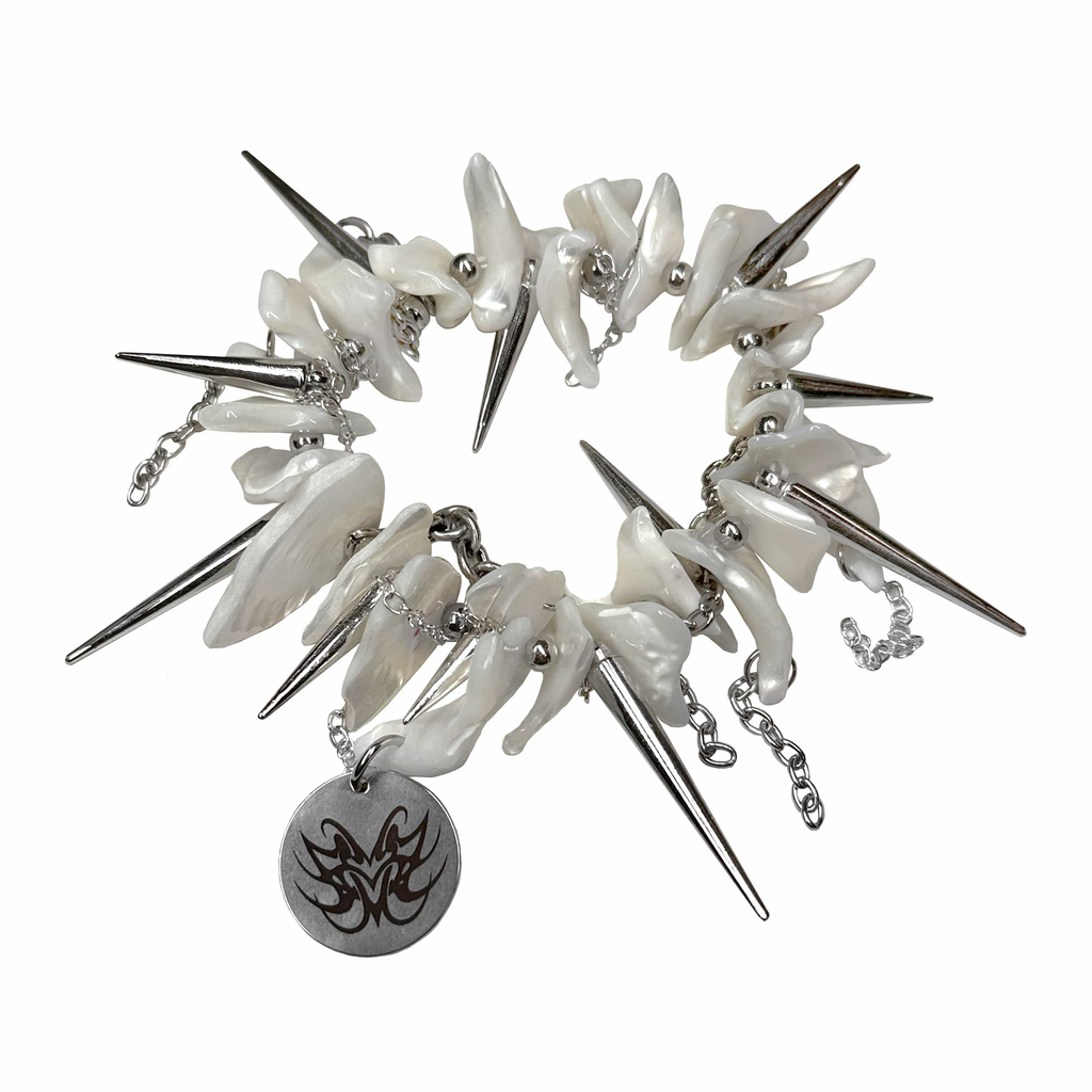 The Fang Bracelet is a bold mix of vintage elegance and 2010s edge, featuring upcycled pearls paired with sharp spikes. Strung on a flexible elastic band, it offers both comfort and statement-making style.
