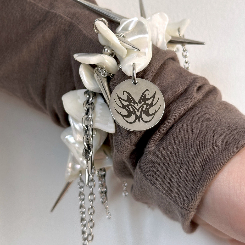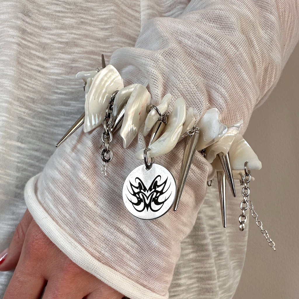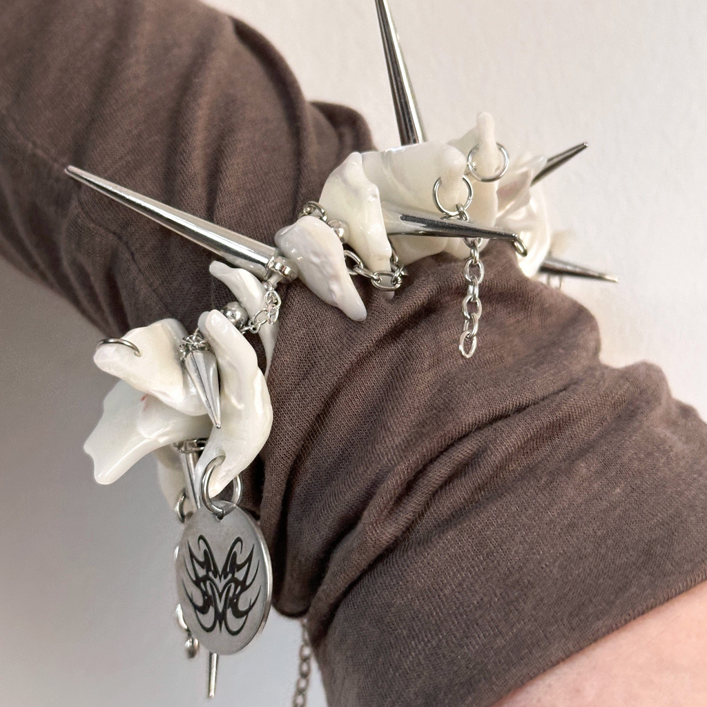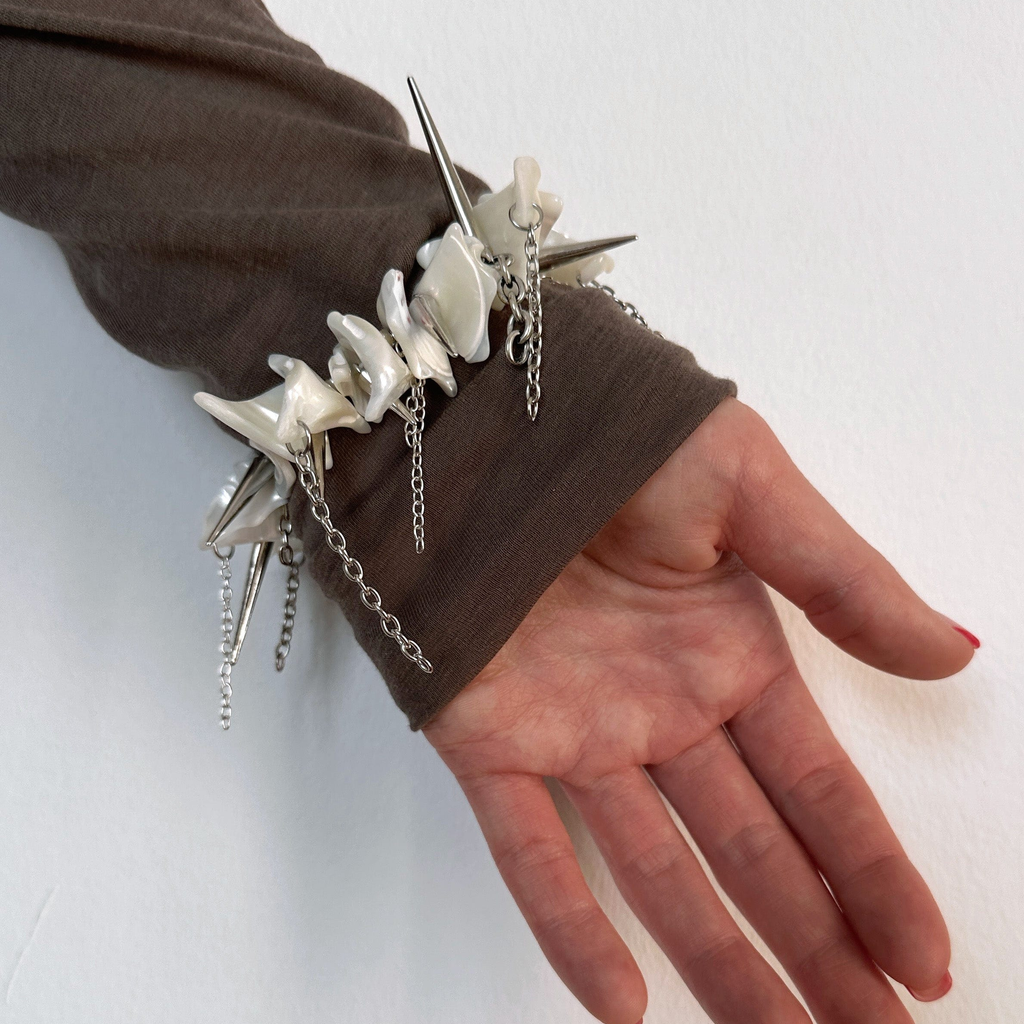 The Fang Bracelet is a bold mix of vintage elegance and 2010s edge, featuring upcycled pearls paired with sharp spikes. Strung on a flexible elastic band, it offers both comfort and statement-making style.