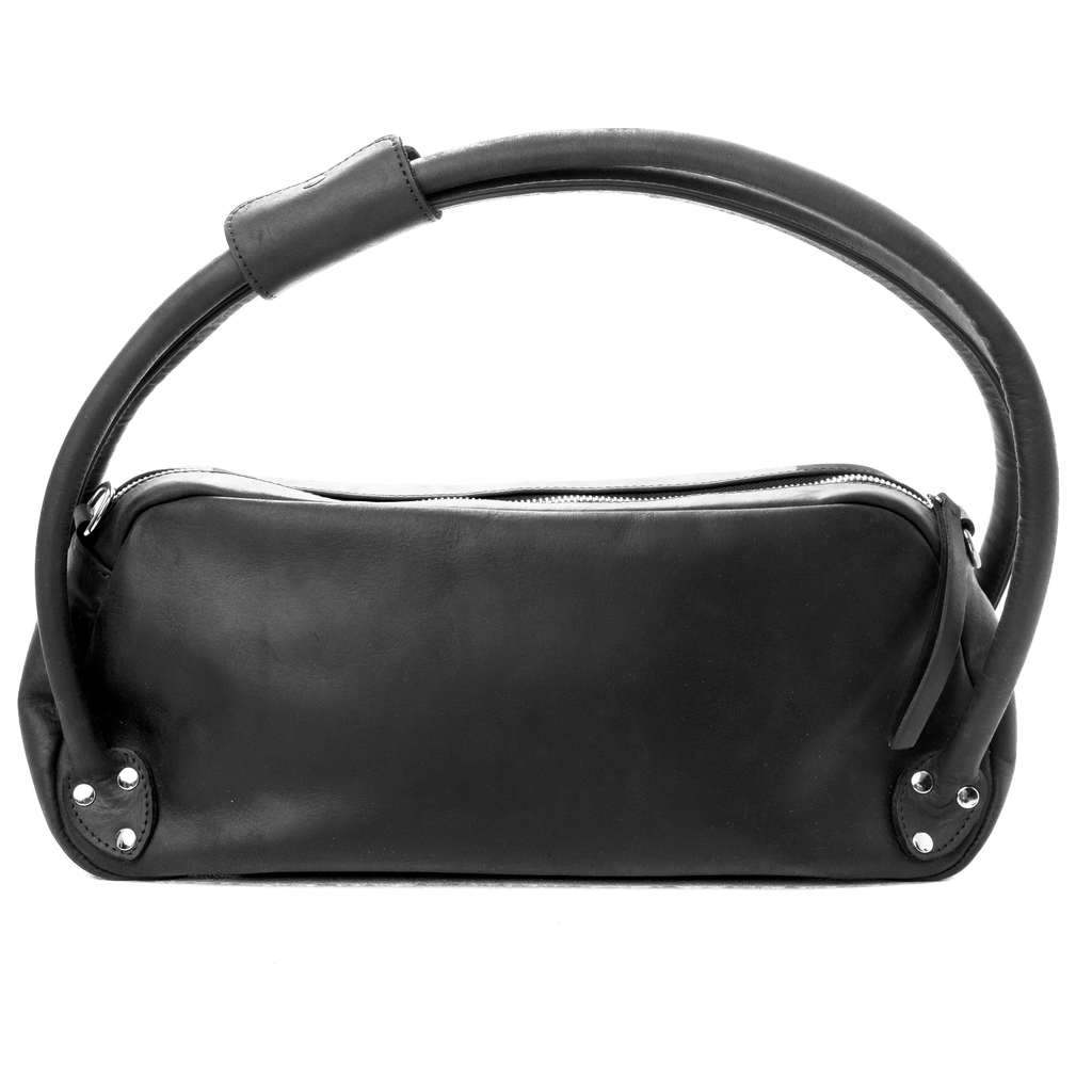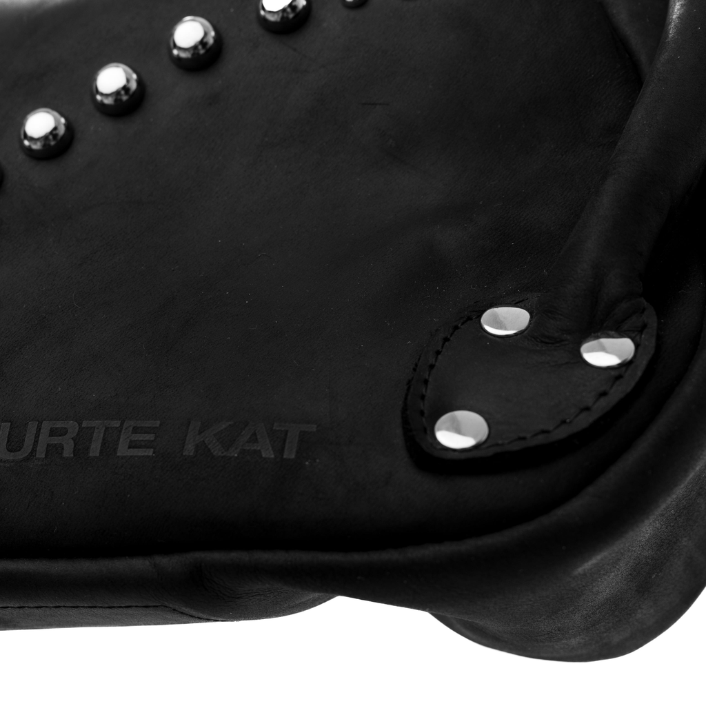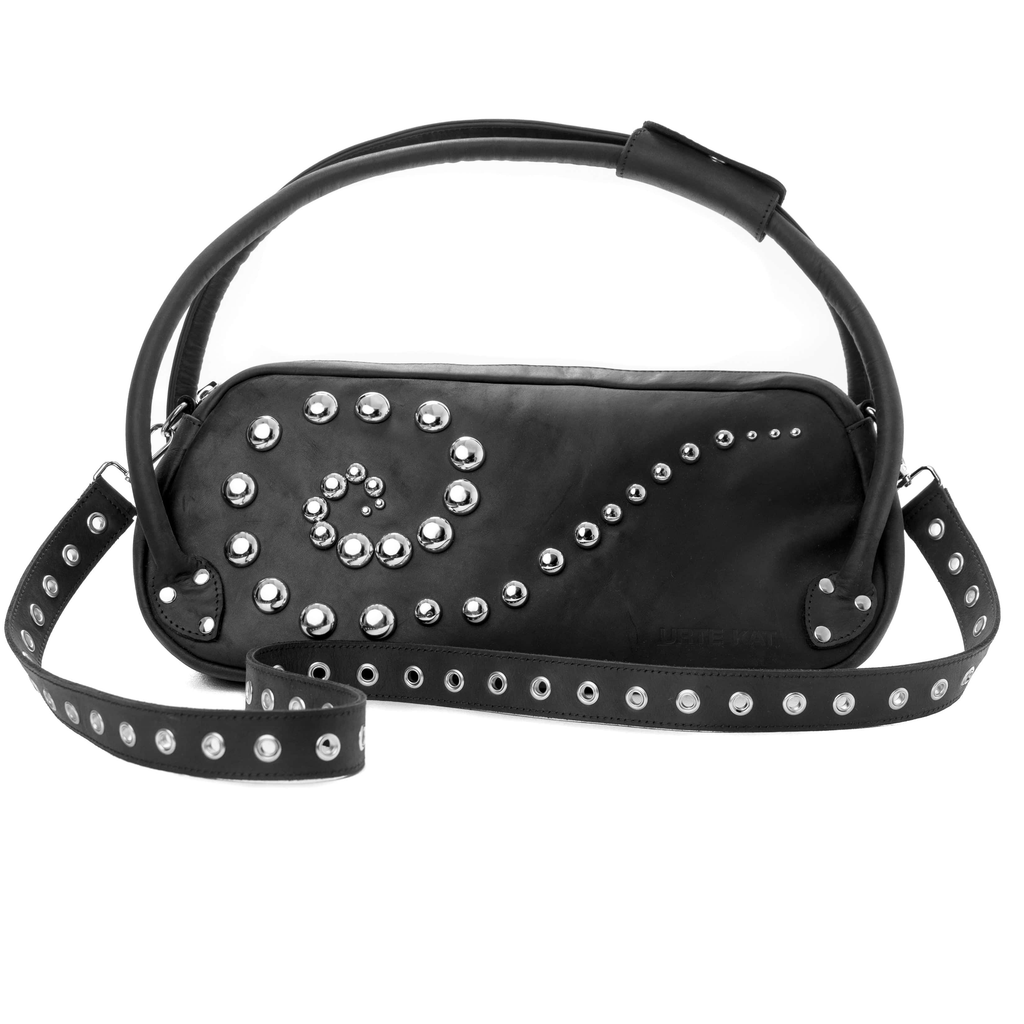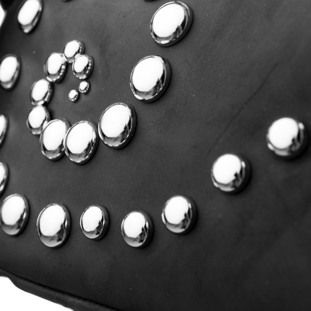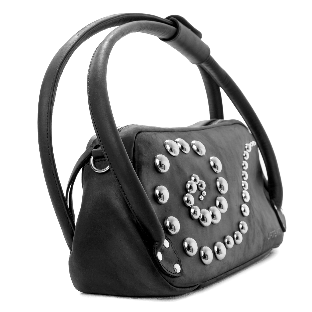 The AVA bag is made in a thick 'crazy horse' leather. The bag features a studded spiral motif. The leather is 1.6 mm thick and has a pull-up and waxy finish. The bag has an aged, rustic look. It has a single compartment with zip closure.