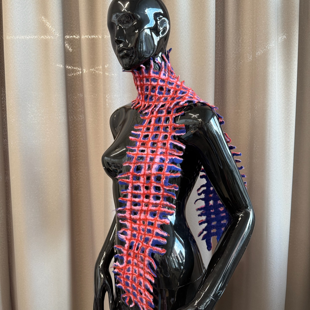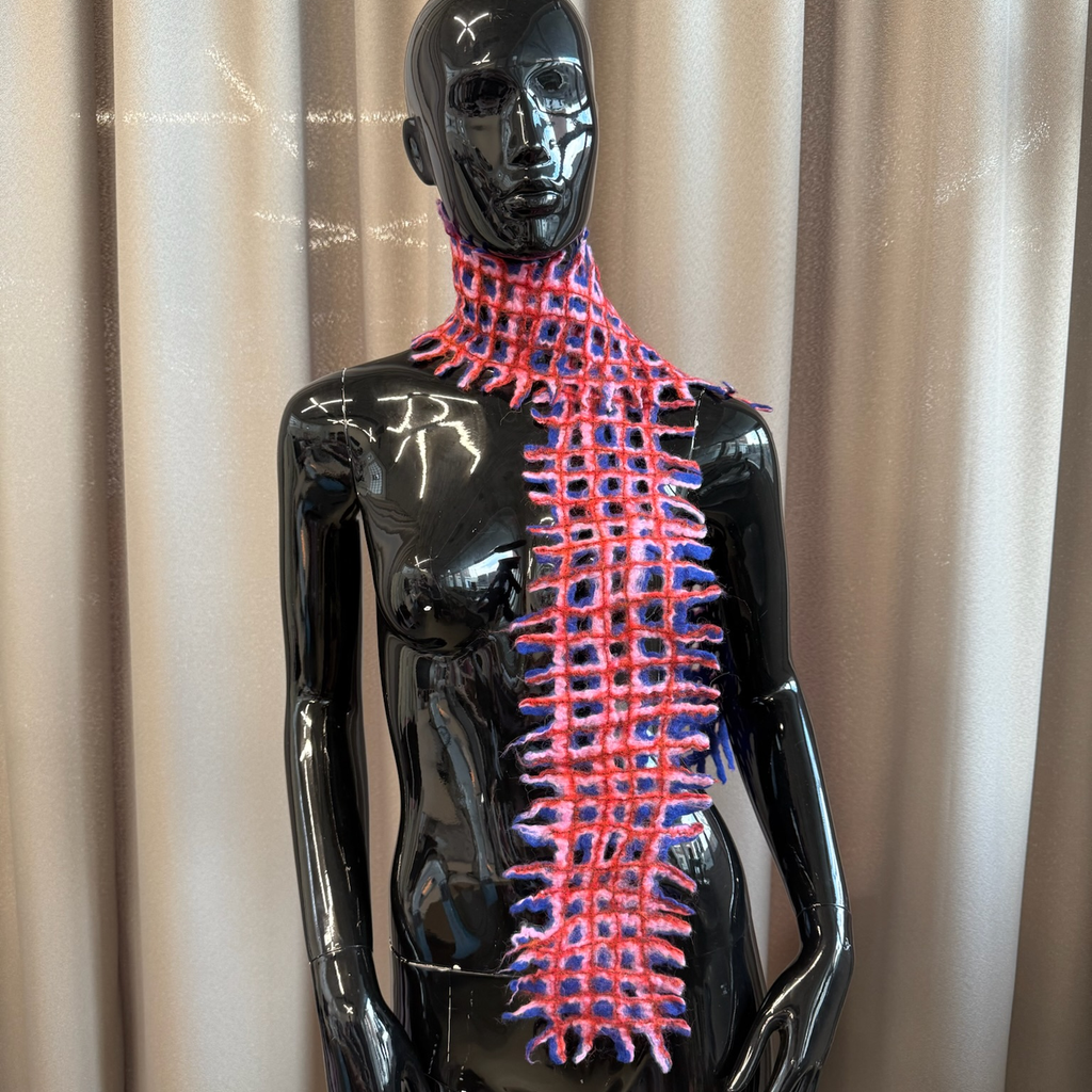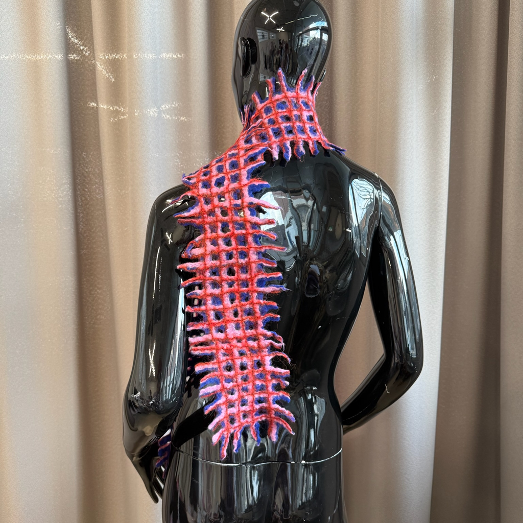Felted long 3-coloured scarf in grit pattern with fringes on the edge