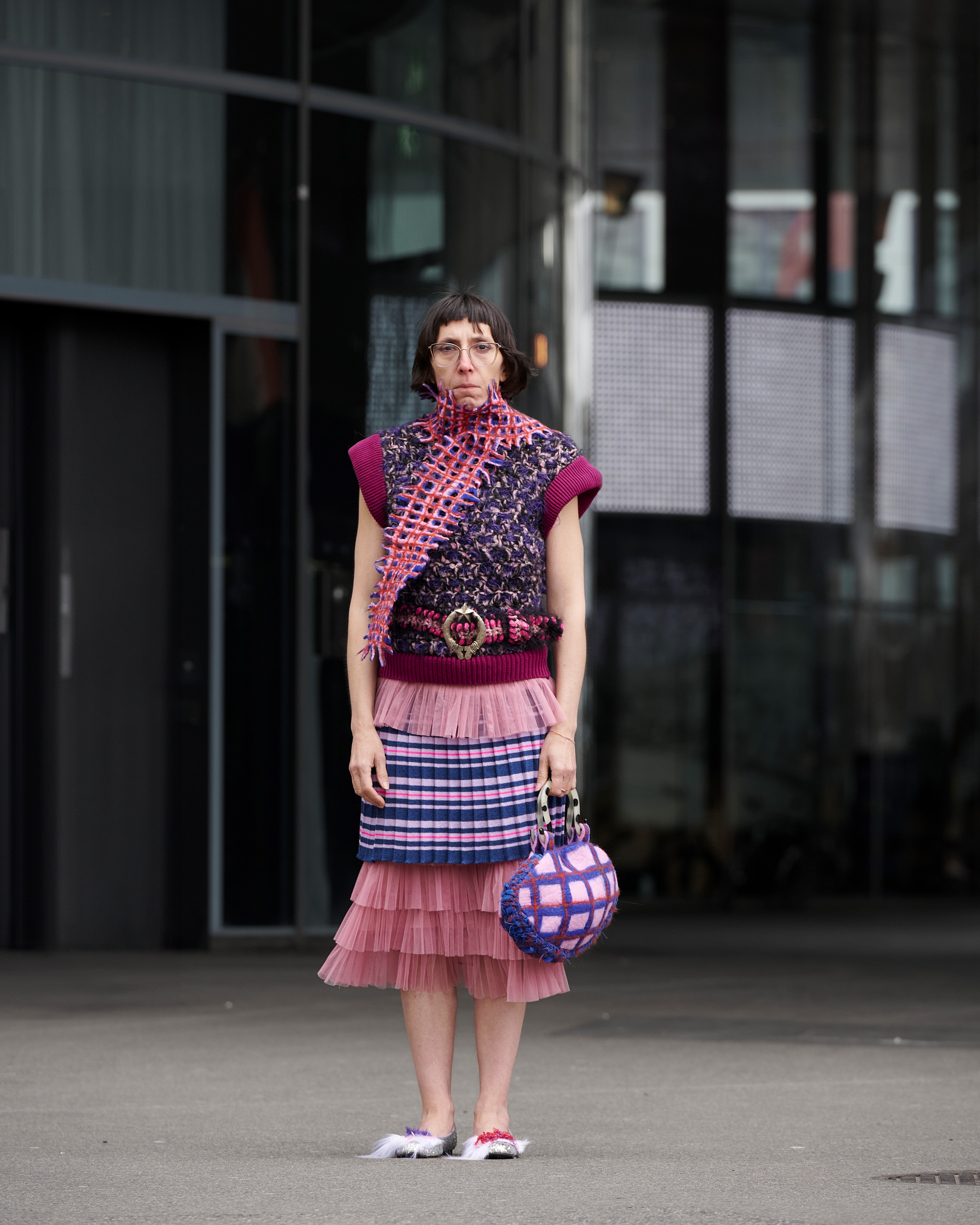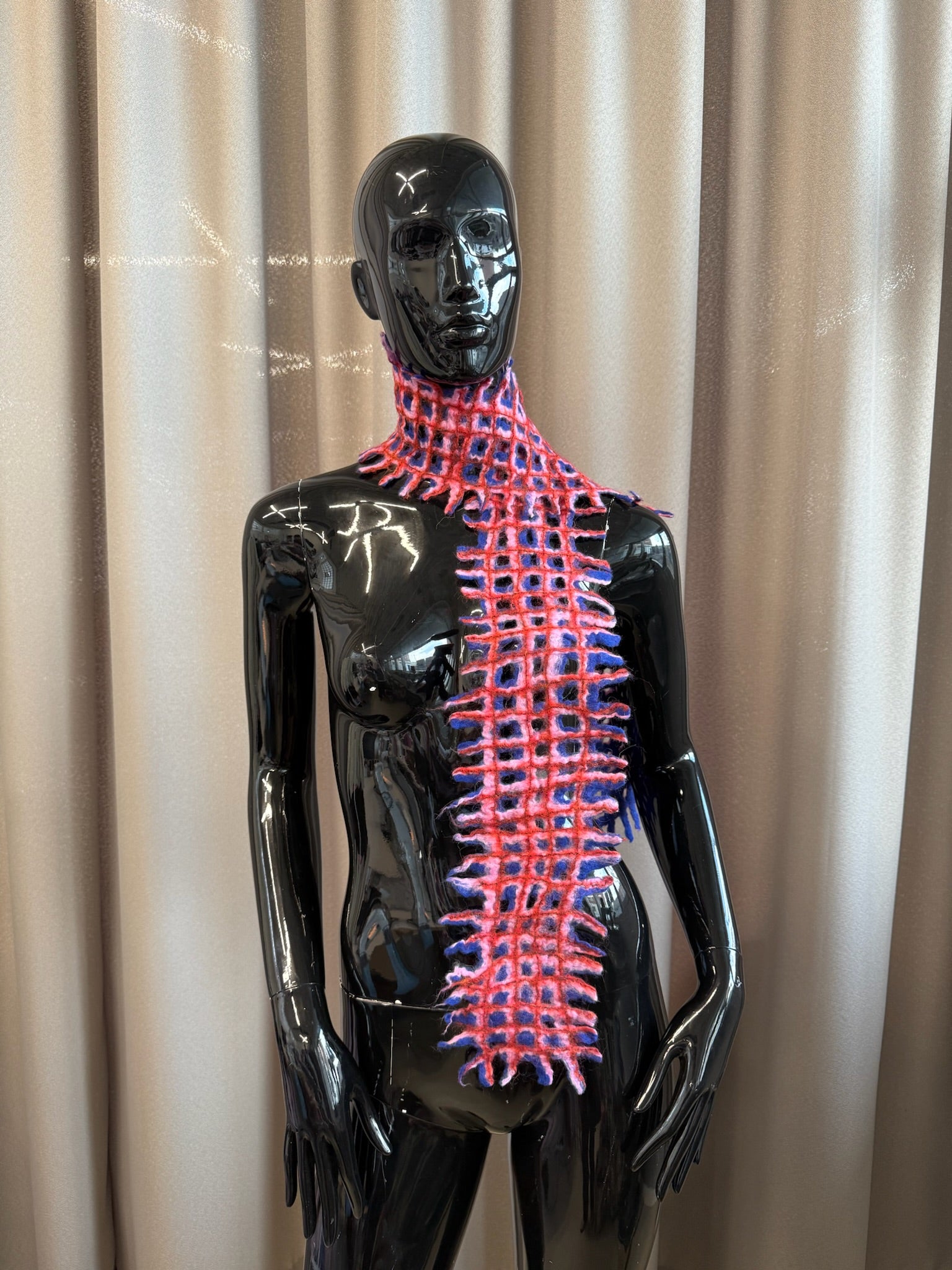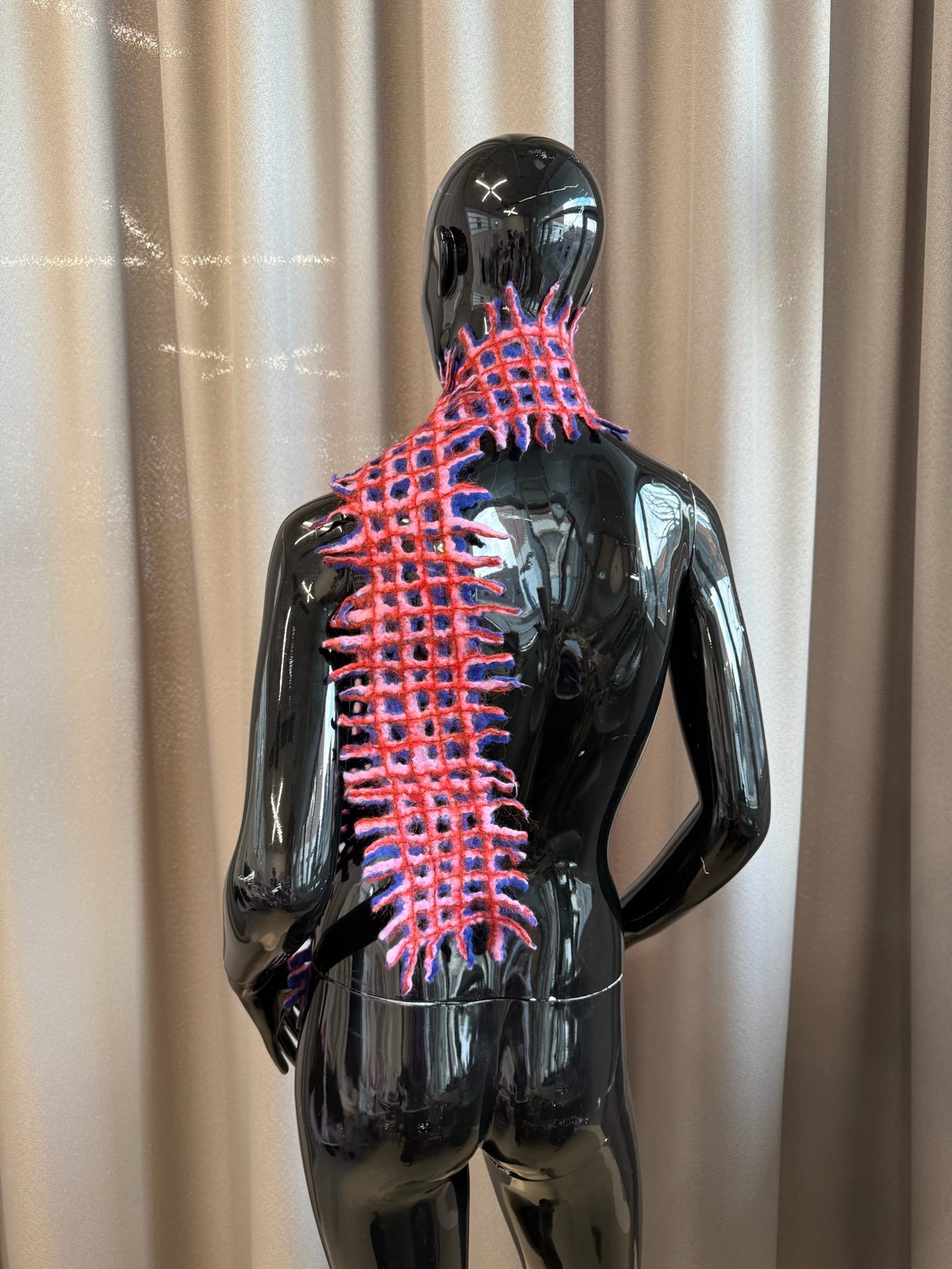 Felted long 3-coloured scarf in grit pattern with fringes on the edge