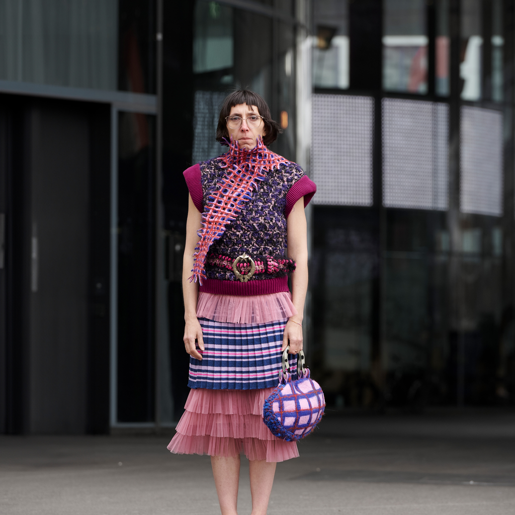 "peeing girls" crochet vest pink blue