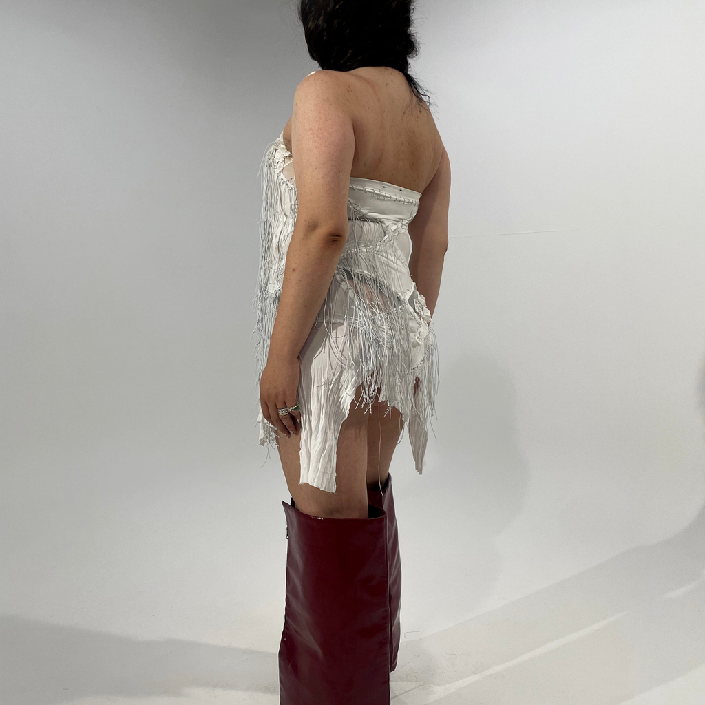 Tube dress made from up cycled stockings, lace and elasticated fringes. The dress is hand stitched with elastic thread so the dress can fit between womens size 36-48.