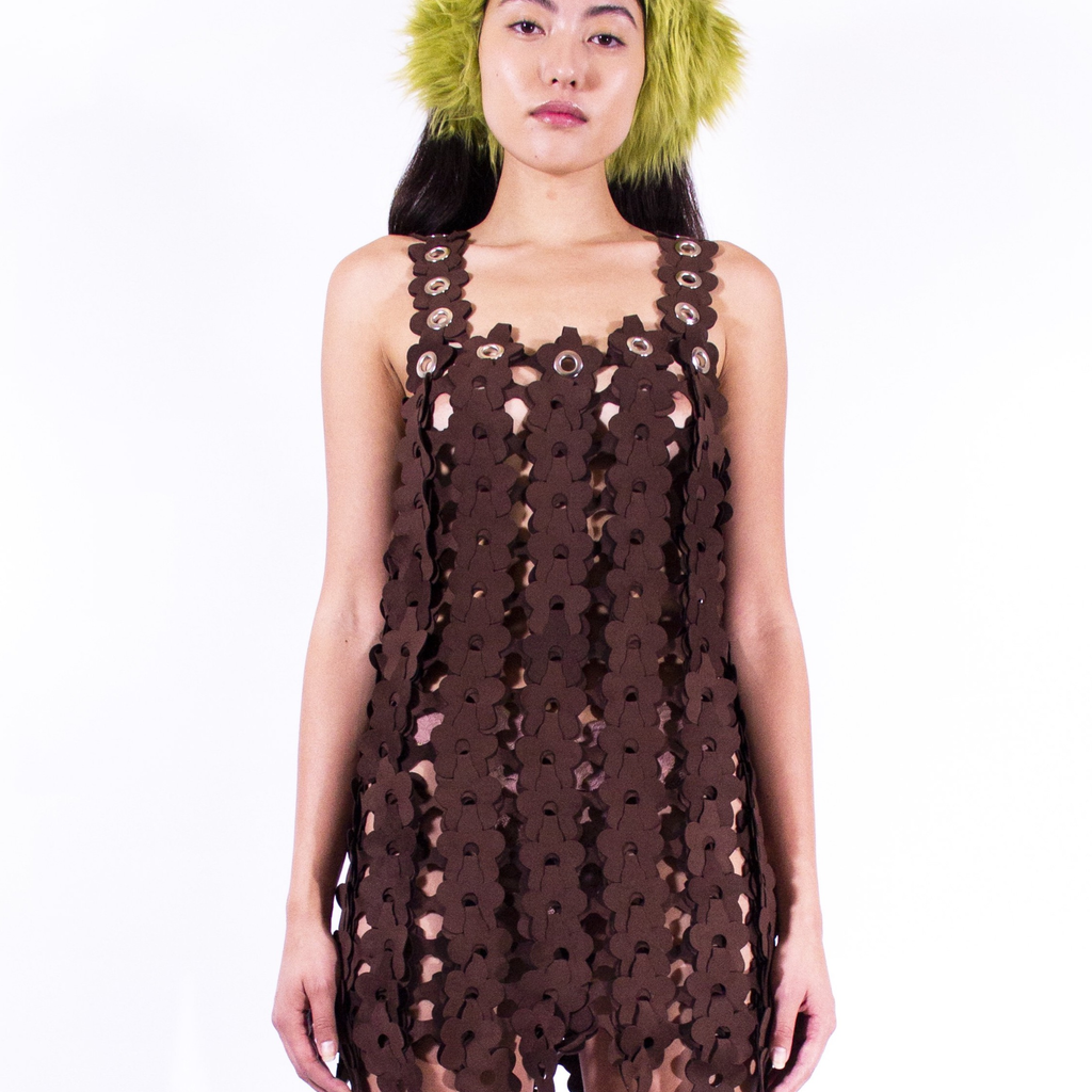 Handwoven and Handcut Ultrasuede Flower Chain Dress by Leeann Huang. Only 1 dress will be produced.